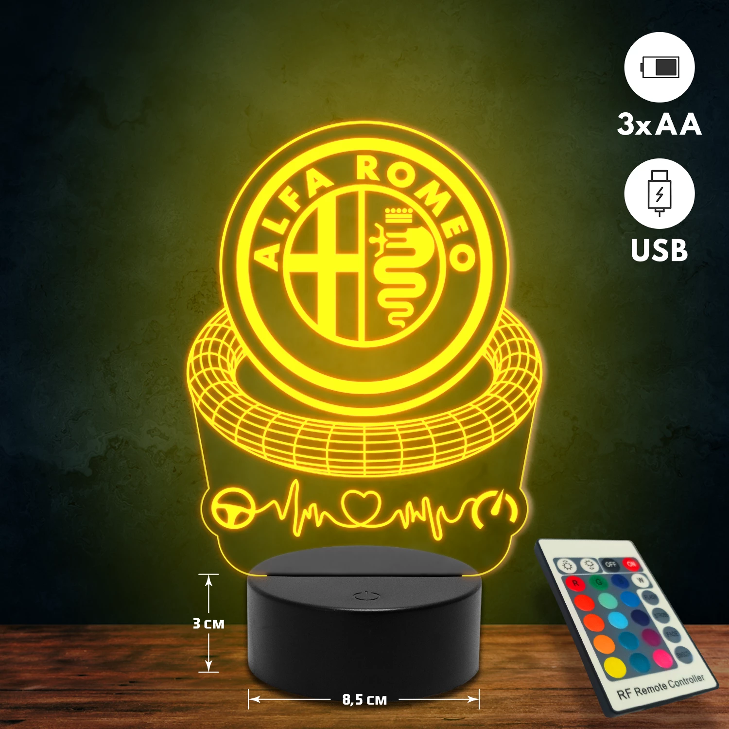 A 3D lámpa USB-kábellel is működtethető, amelyet egyszerűen csatlakoztathatsz számítógéphez, laptophoz vagy hálózati adapterhez. Emellett 3 darab AA elemmel is üzemeltethető (a csomag nem tartalmazza). A lámpa 16 különböző színben világíthat, emellett választhatóak a színváltási módok is: gyors villogás, lassú villogás vagy fokozatos színátmenet. A fény kellemesen lágy, a fényerőt pedig könnyedén állíthatod a mellékelt távirányító segítségével.