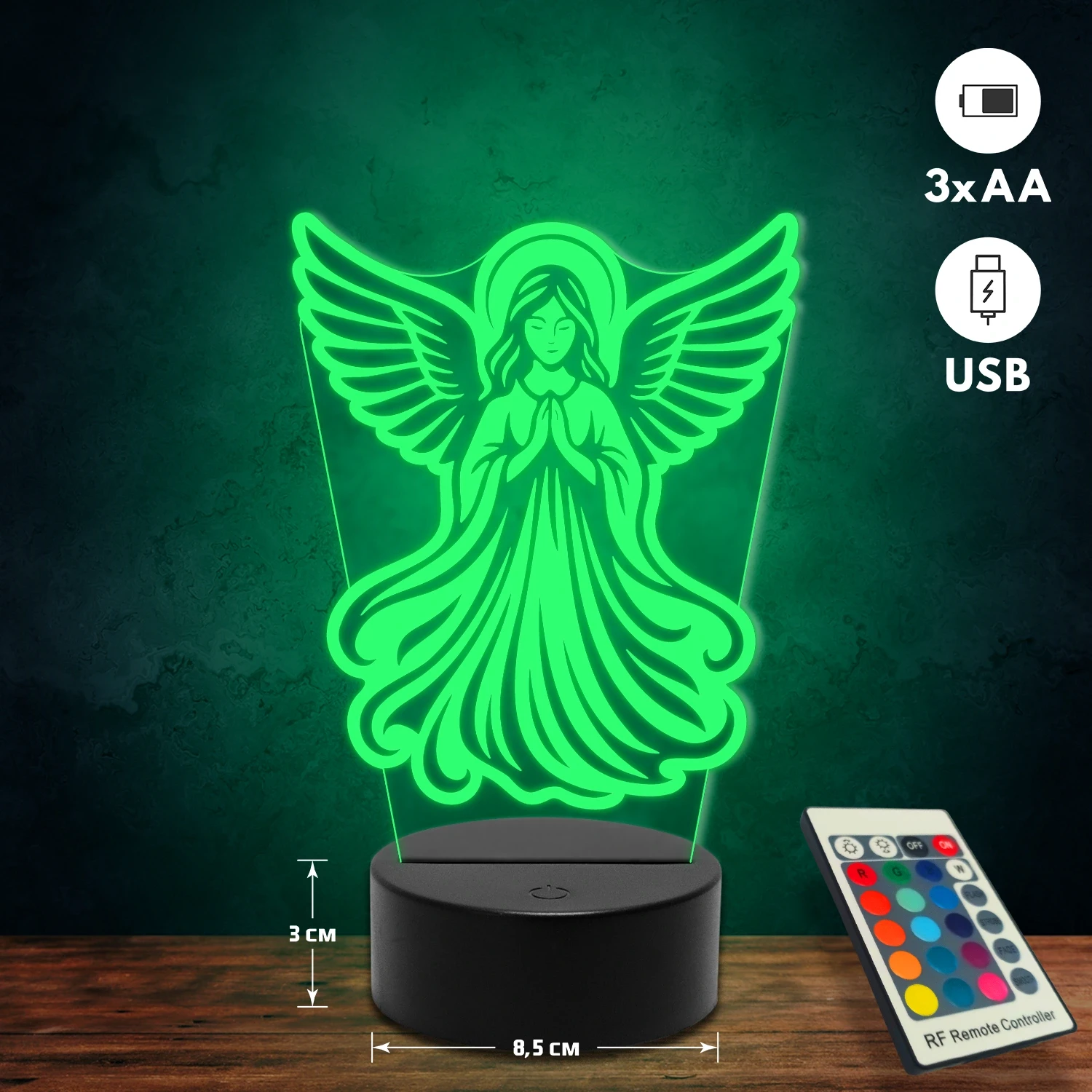 A 3D lámpa USB-kábellel is működtethető, amelyet egyszerűen csatlakoztathatsz számítógéphez, laptophoz vagy hálózati adapterhez. Emellett 3 darab AA elemmel is üzemeltethető (a csomag nem tartalmazza). A lámpa 16 különböző színben világíthat, emellett választhatóak a színváltási módok is: gyors villogás, lassú villogás vagy fokozatos színátmenet. A fény kellemesen lágy, a fényerőt pedig könnyedén állíthatod a mellékelt távirányító segítségével.