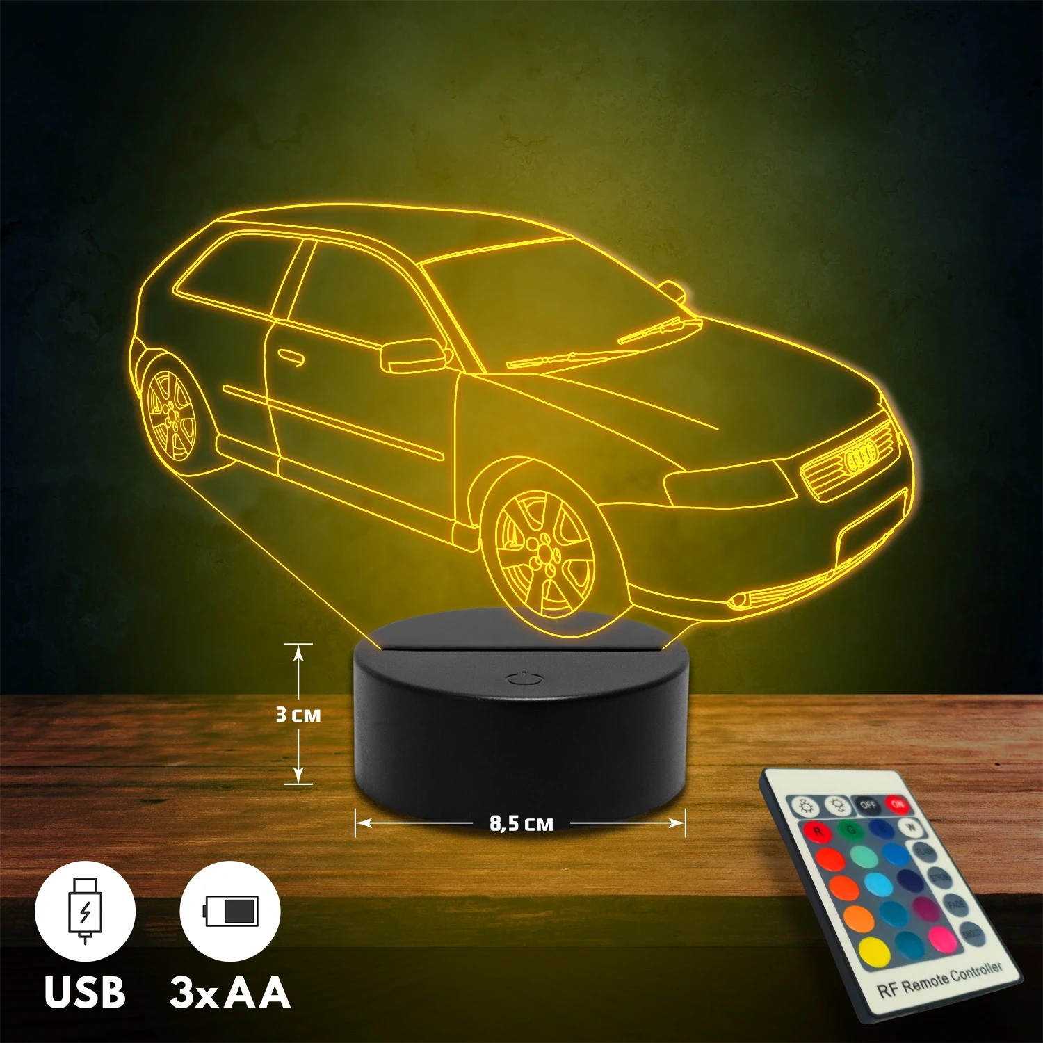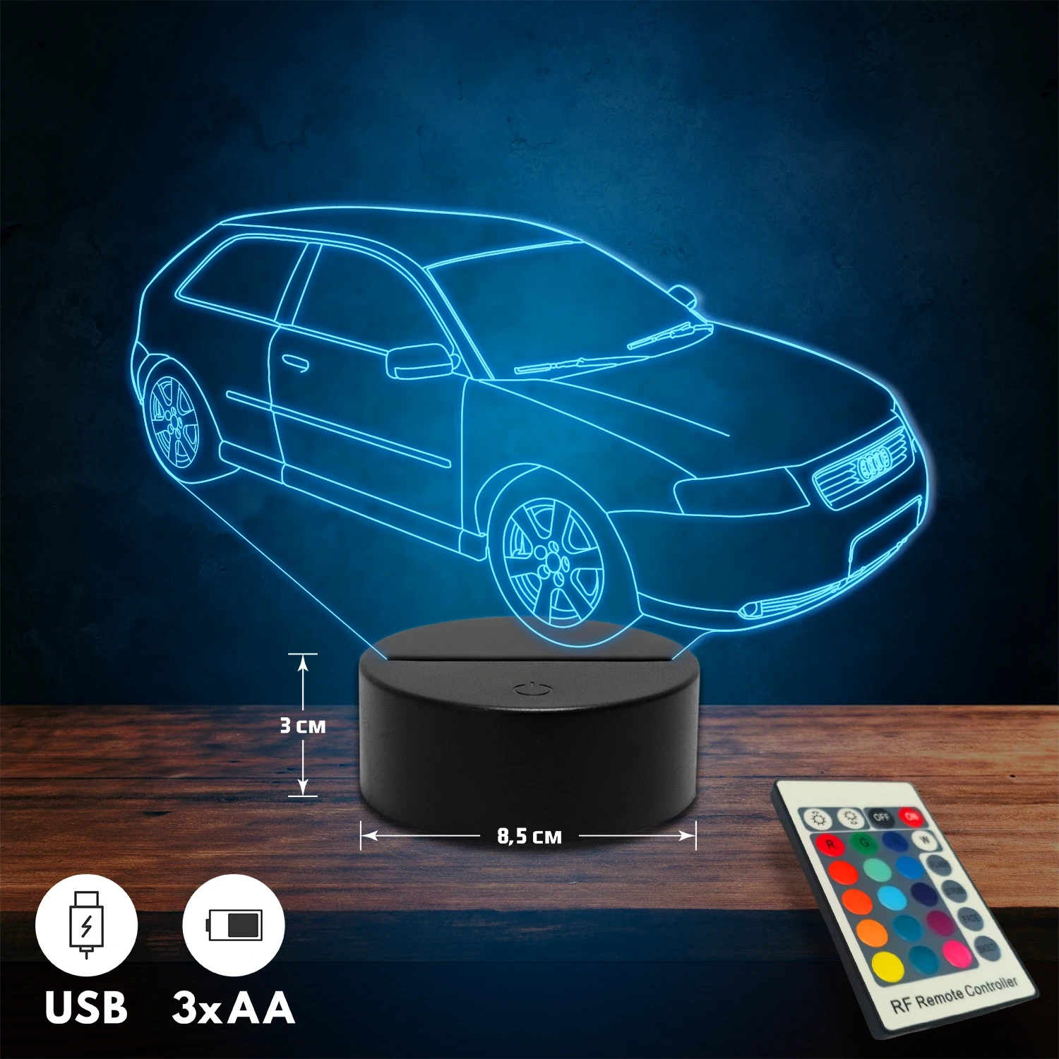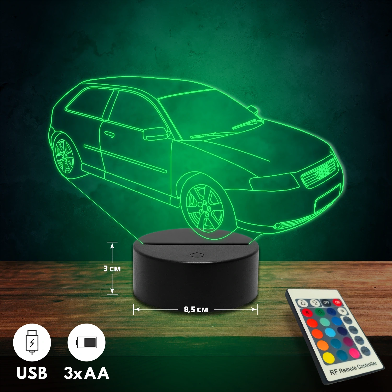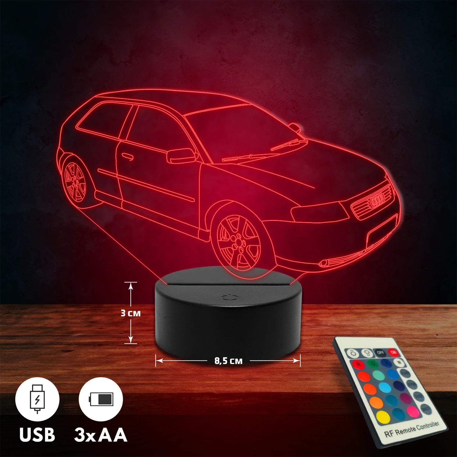 A 3D lámpa USB-kábellel is működtethető, amelyet egyszerűen csatlakoztathatsz számítógéphez, laptophoz vagy hálózati adapterhez. Emellett 3 darab AA elemmel is üzemeltethető (a csomag nem tartalmazza). A lámpa 16 különböző színben világíthat, emellett választhatóak a színváltási módok is: gyors villogás, lassú villogás vagy fokozatos színátmenet. A fény kellemesen lágy, a fényerőt pedig könnyedén állíthatod a mellékelt távirányító segítségével.