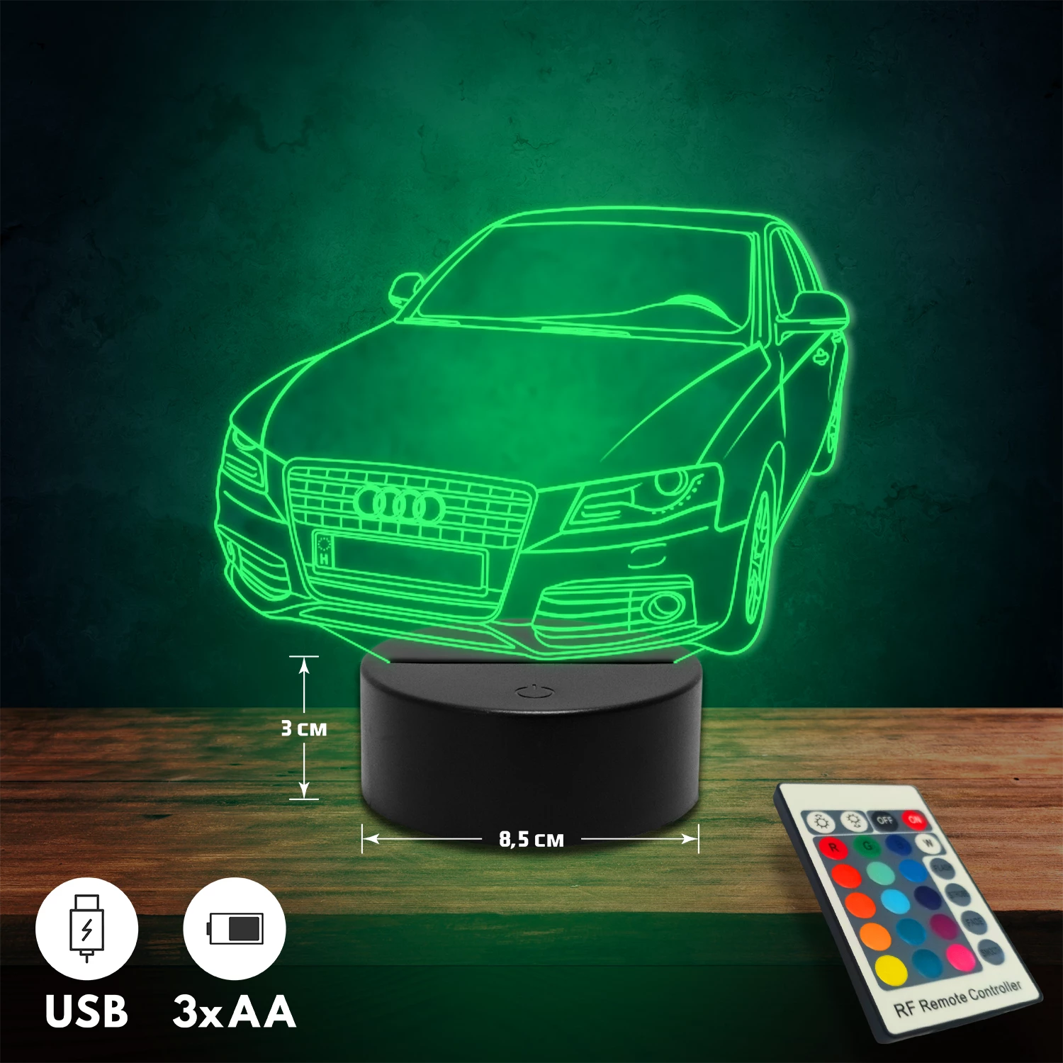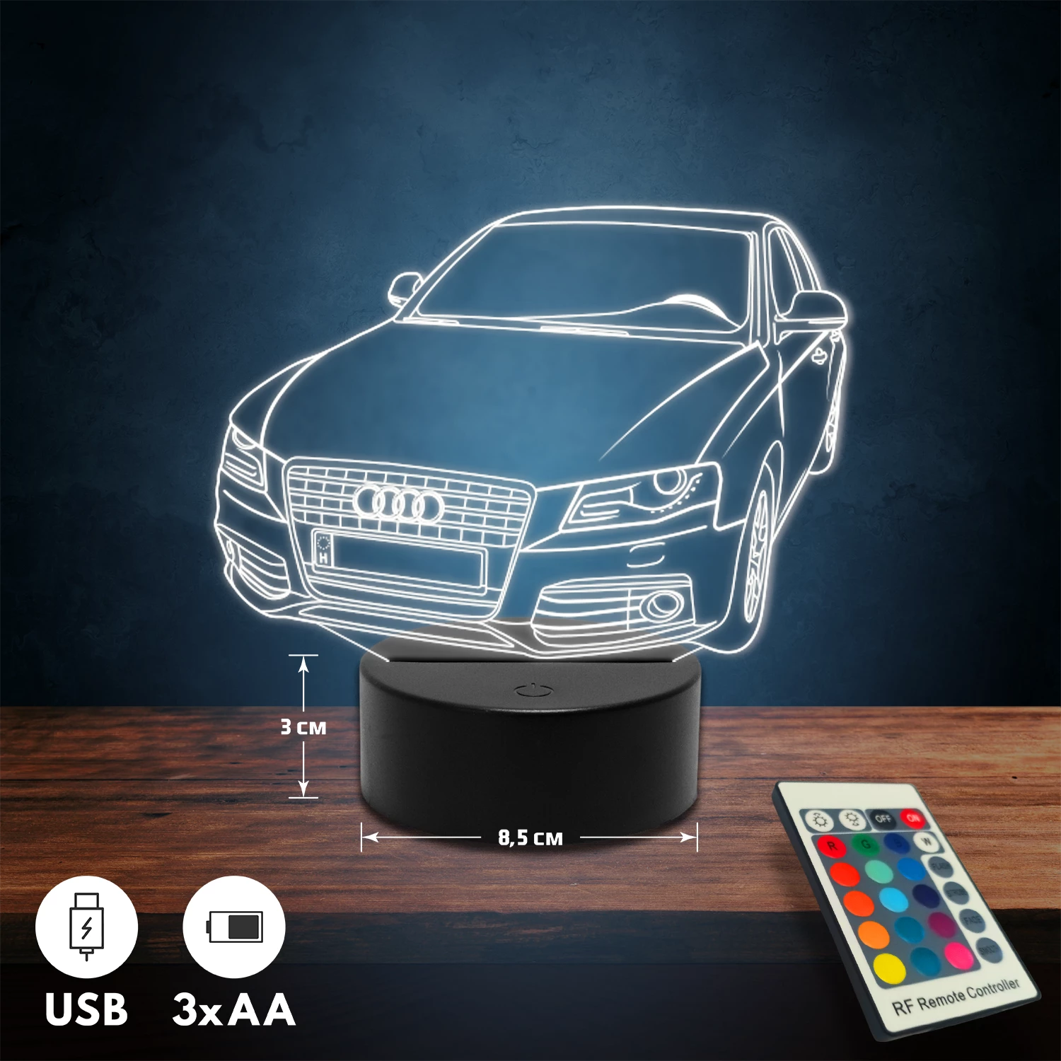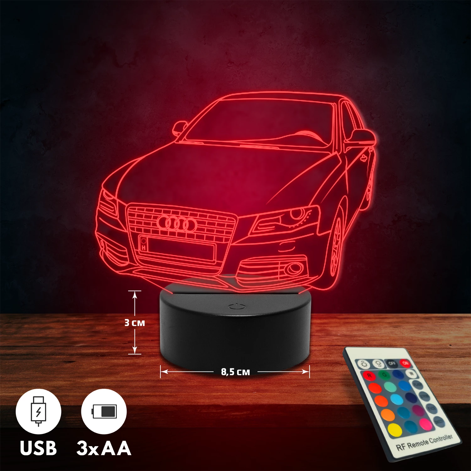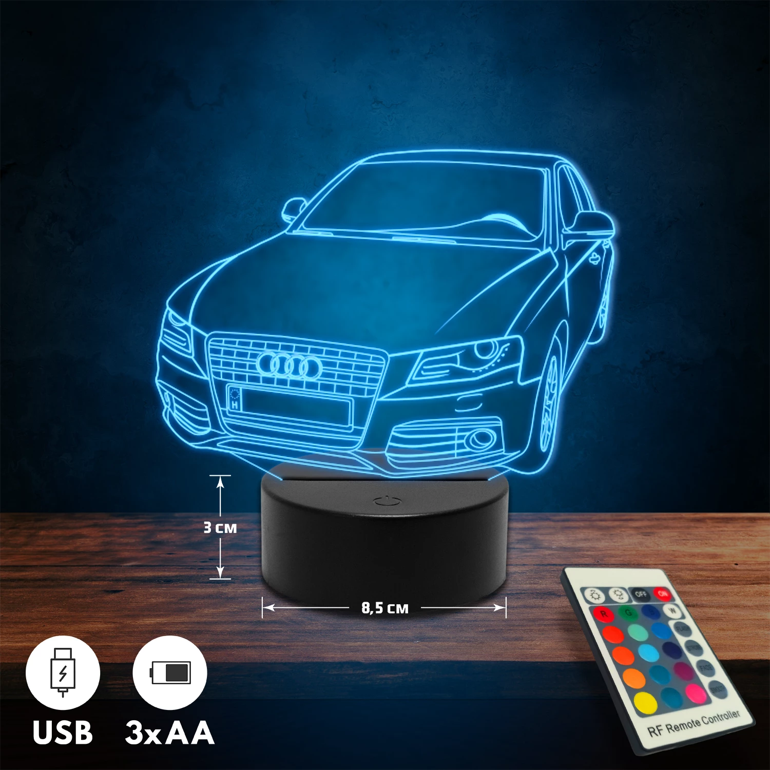 A 3D lámpa USB-kábellel is működtethető, amelyet egyszerűen csatlakoztathatsz számítógéphez, laptophoz vagy hálózati adapterhez. Emellett 3 darab AA elemmel is üzemeltethető (a csomag nem tartalmazza). A lámpa 16 különböző színben világíthat, emellett választhatóak a színváltási módok is: gyors villogás, lassú villogás vagy fokozatos színátmenet. A fény kellemesen lágy, a fényerőt pedig könnyedén állíthatod a mellékelt távirányító segítségével.