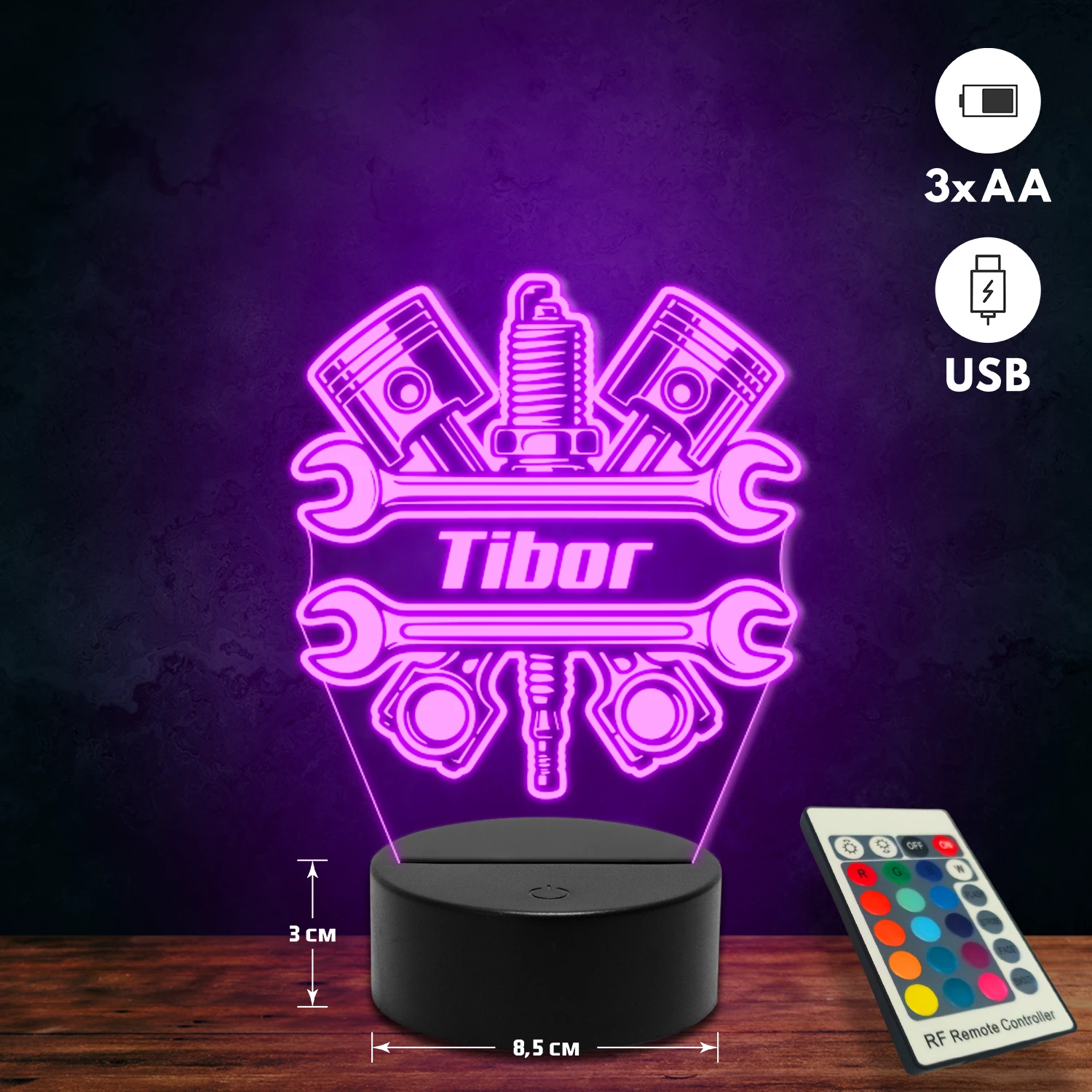 | Tartozékok: | Lézervágott, gravírozott akril lemez (Vastagság - 4 mm), Érintő gombos befogó talp (Átmérő - 8,5 cm, Magasság - 3,8 cm), Micro USB kábel (Hossz - 80 cm), Távirányító, Az elemet a csomag nem tartalmazza! |