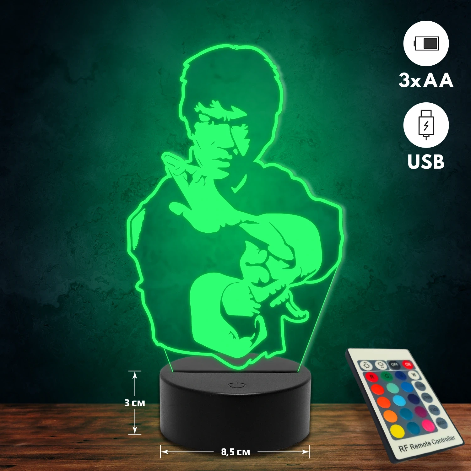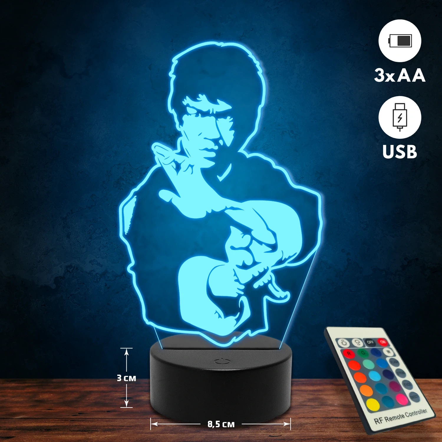 A 3D lámpa USB-kábellel is működtethető, amelyet egyszerűen csatlakoztathatsz számítógéphez, laptophoz vagy hálózati adapterhez. Emellett 3 darab AA elemmel is üzemeltethető (a csomag nem tartalmazza). A lámpa 16 különböző színben világíthat, emellett választhatóak a színváltási módok is: gyors villogás, lassú villogás vagy fokozatos színátmenet. A fény kellemesen lágy, a fényerőt pedig könnyedén állíthatod a mellékelt távirányító segítségével.