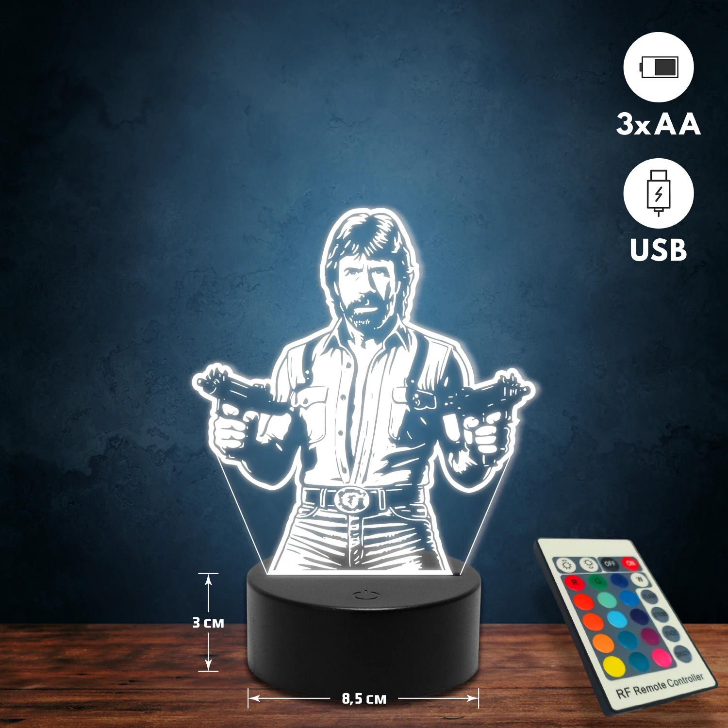 A 3D lámpa USB-kábellel is működtethető, amelyet egyszerűen csatlakoztathatsz számítógéphez, laptophoz vagy hálózati adapterhez. Emellett 3 darab AA elemmel is üzemeltethető (a csomag nem tartalmazza). A lámpa 16 különböző színben világíthat, emellett választhatóak a színváltási módok is: gyors villogás, lassú villogás vagy fokozatos színátmenet. A fény kellemesen lágy, a fényerőt pedig könnyedén állíthatod a mellékelt távirányító segítségével.