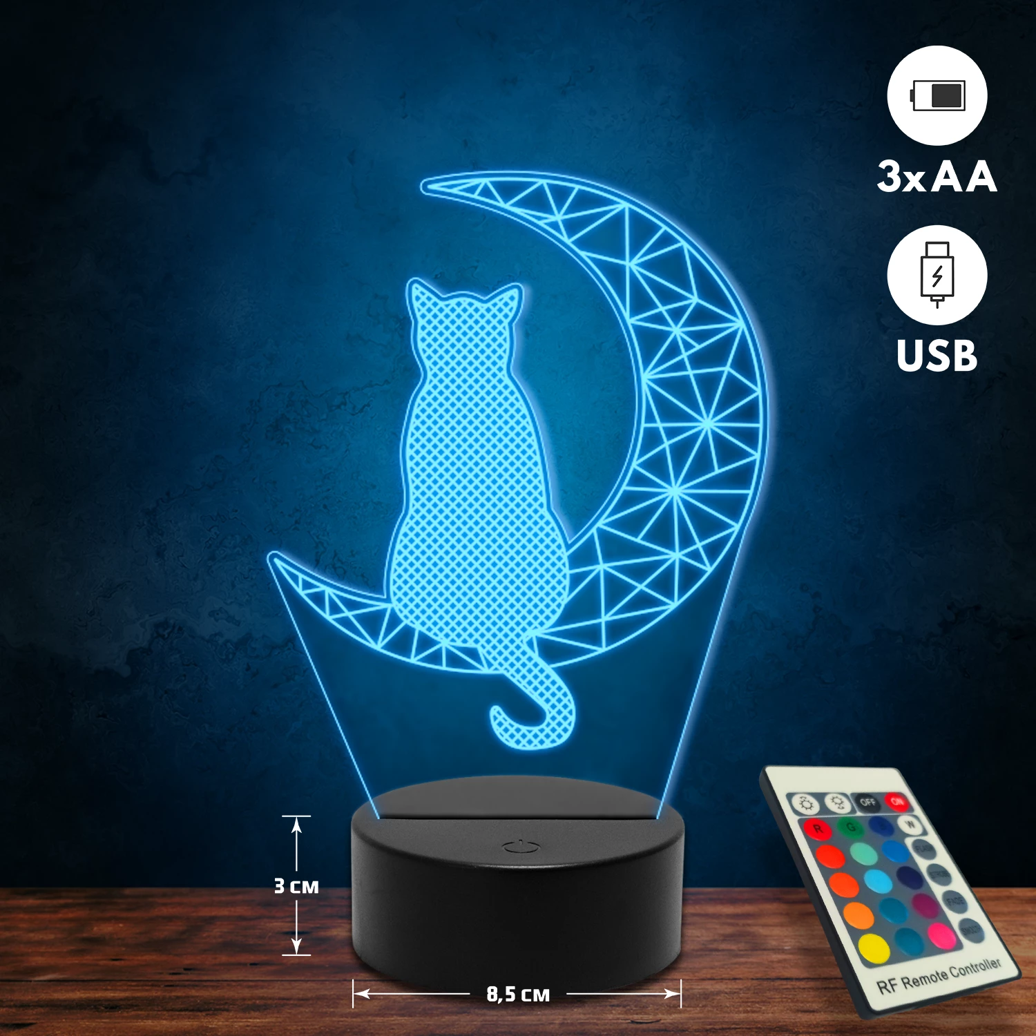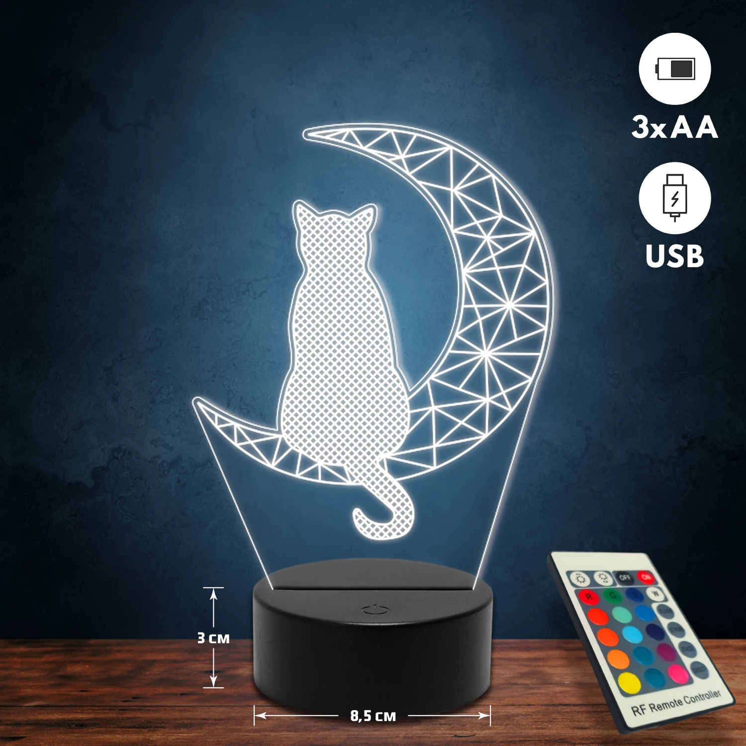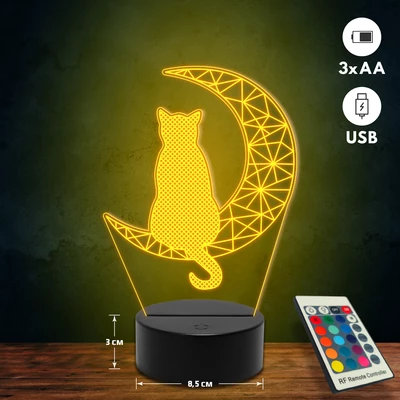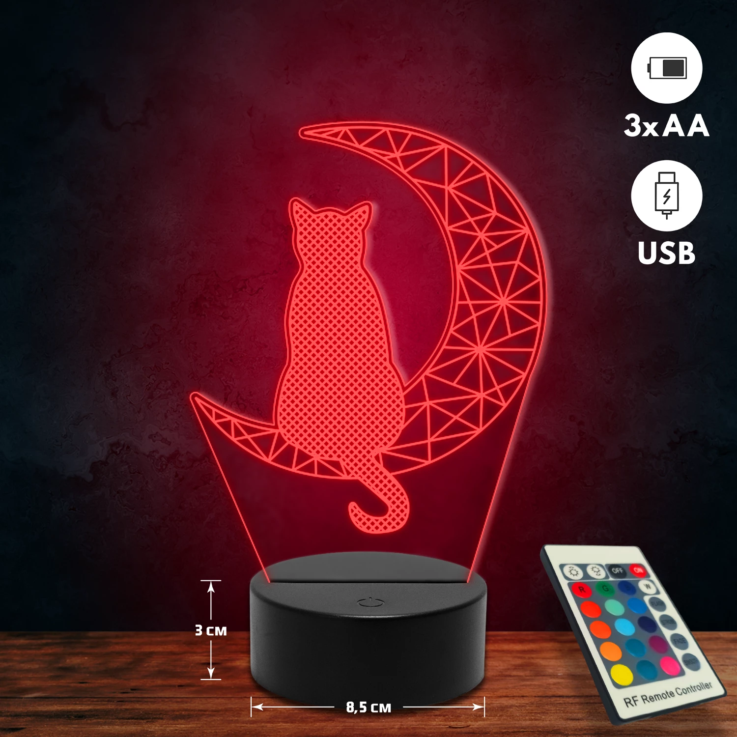 A 3D lámpa USB-kábellel is működtethető, amelyet egyszerűen csatlakoztathatsz számítógéphez, laptophoz vagy hálózati adapterhez. Emellett 3 darab AA elemmel is üzemeltethető (a csomag nem tartalmazza). A lámpa 16 különböző színben világíthat, emellett választhatóak a színváltási módok is: gyors villogás, lassú villogás vagy fokozatos színátmenet. A fény kellemesen lágy, a fényerőt pedig könnyedén állíthatod a mellékelt távirányító segítségével.