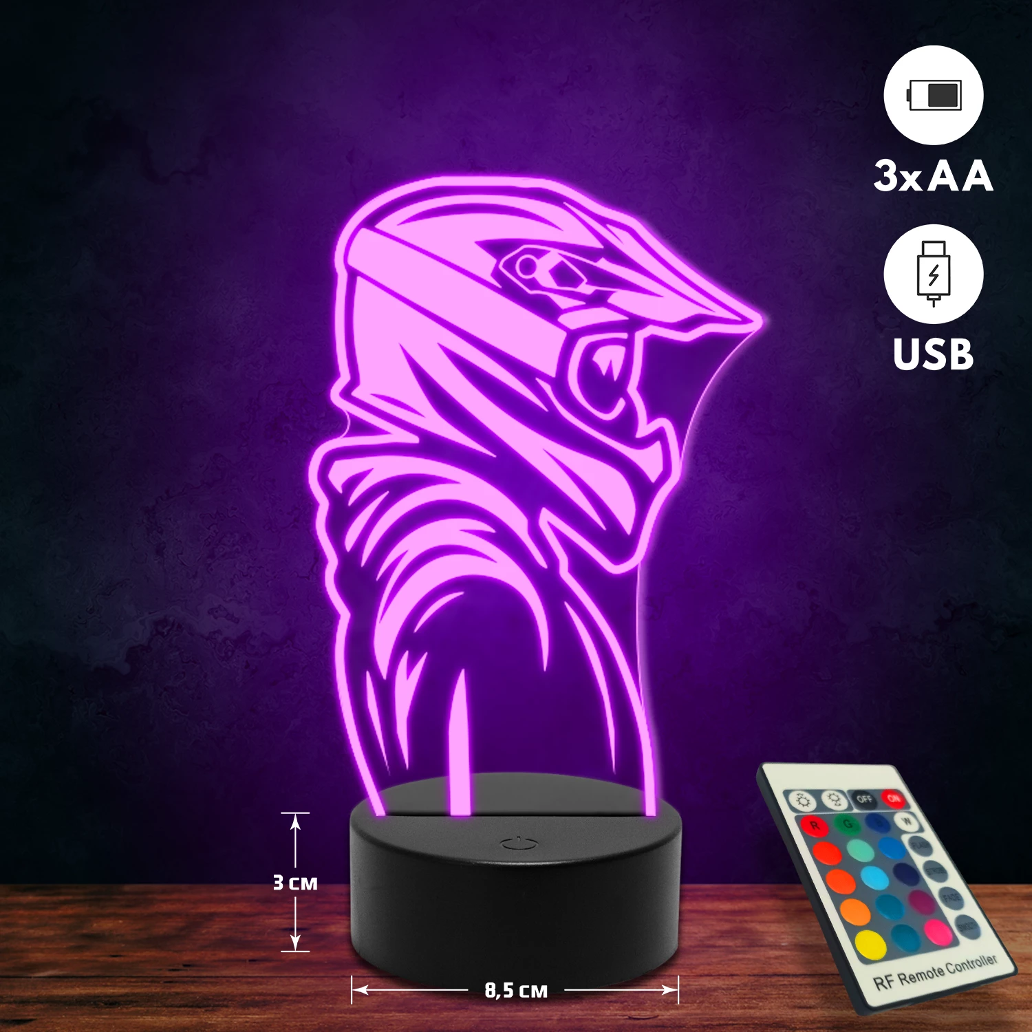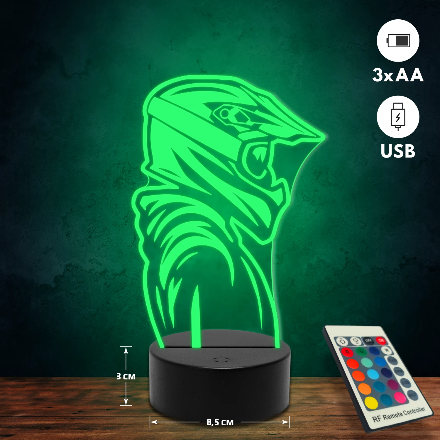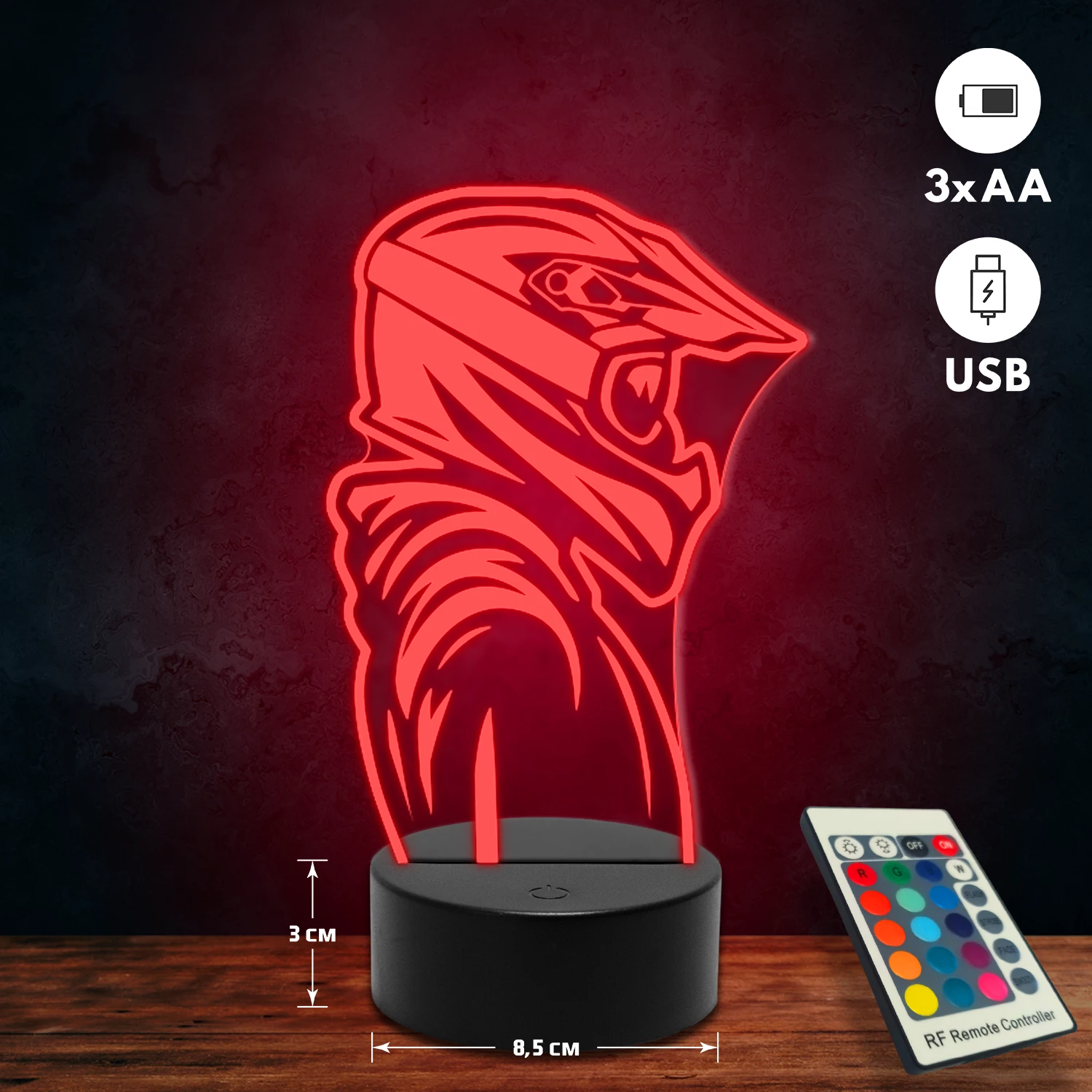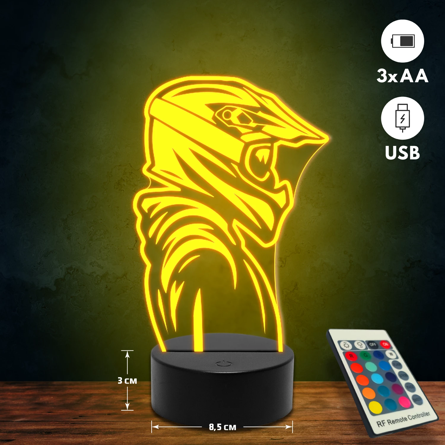 A 3D lámpa USB-kábellel is működtethető, amelyet egyszerűen csatlakoztathatsz számítógéphez, laptophoz vagy hálózati adapterhez. Emellett 3 darab AA elemmel is üzemeltethető (a csomag nem tartalmazza). A lámpa 16 különböző színben világíthat, emellett választhatóak a színváltási módok is: gyors villogás, lassú villogás vagy fokozatos színátmenet. A fény kellemesen lágy, a fényerőt pedig könnyedén állíthatod a mellékelt távirányító segítségével.