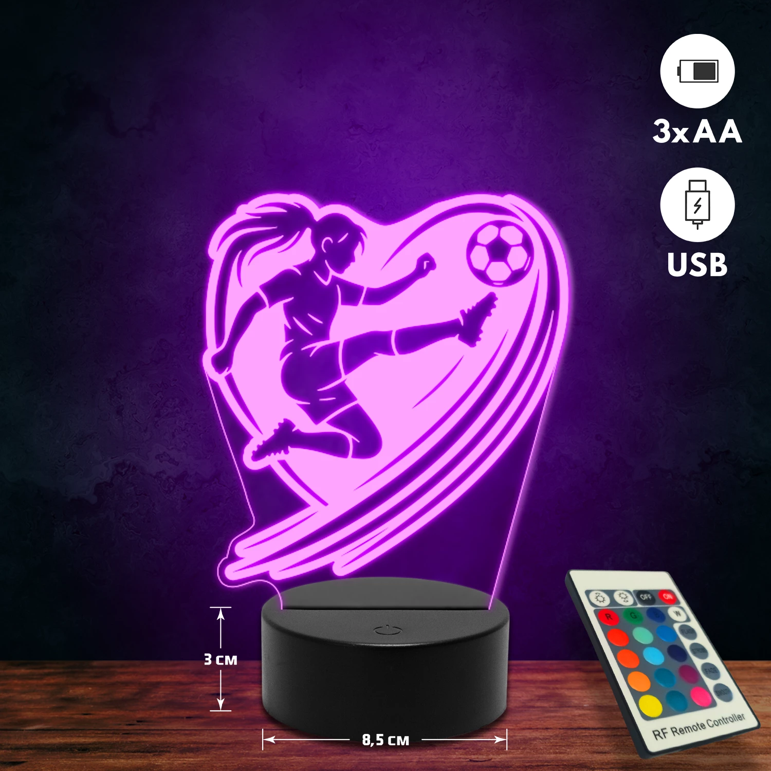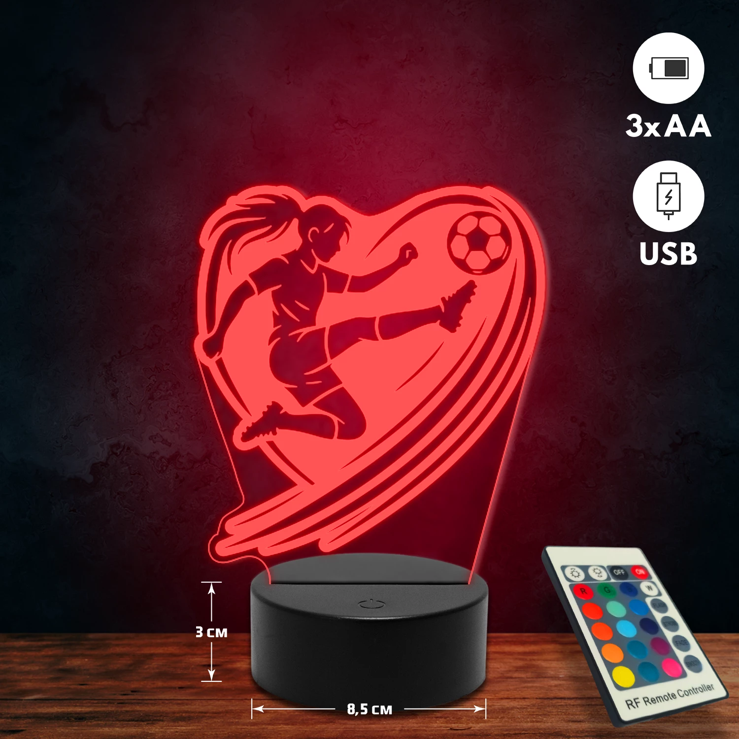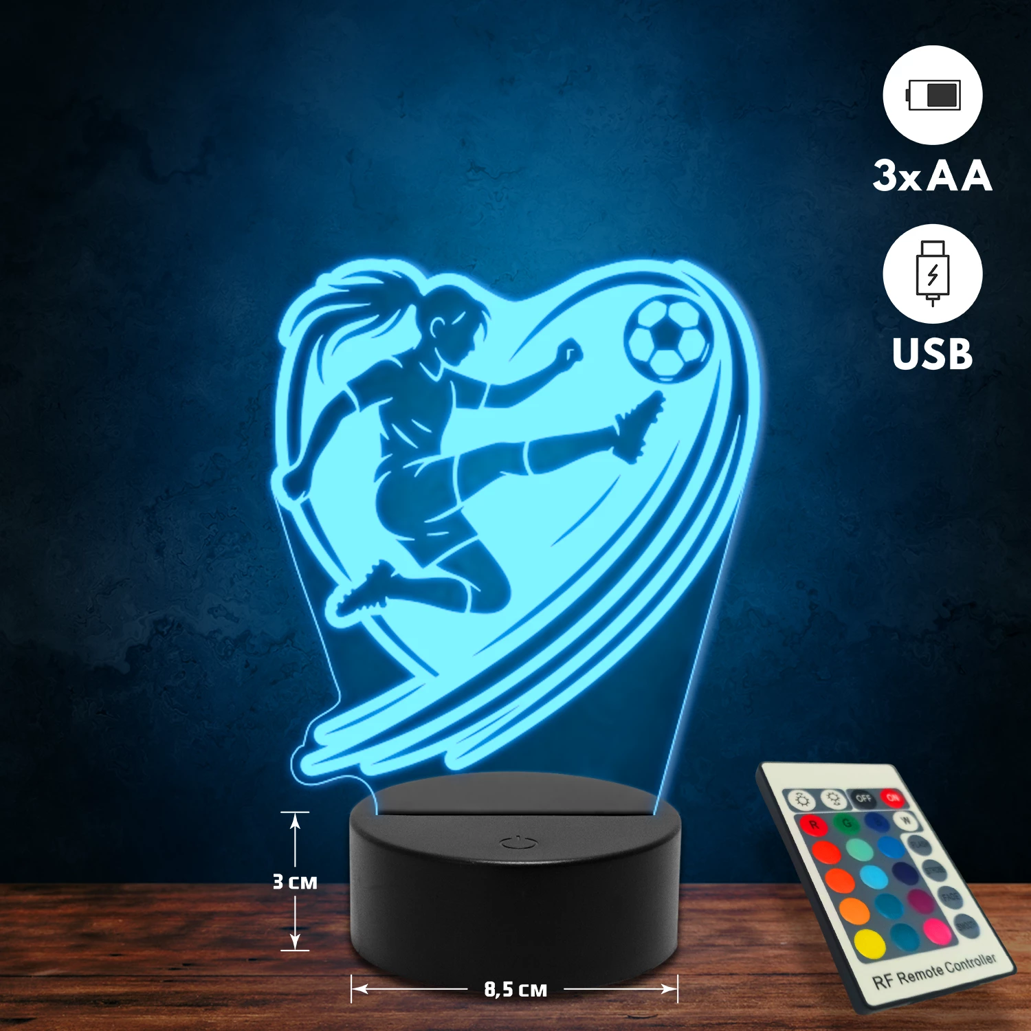 A 3D lámpa USB-kábellel is működtethető, amelyet egyszerűen csatlakoztathatsz számítógéphez, laptophoz vagy hálózati adapterhez. Emellett 3 darab AA elemmel is üzemeltethető (a csomag nem tartalmazza). A lámpa 16 különböző színben világíthat, emellett választhatóak a színváltási módok is: gyors villogás, lassú villogás vagy fokozatos színátmenet. A fény kellemesen lágy, a fényerőt pedig könnyedén állíthatod a mellékelt távirányító segítségével.