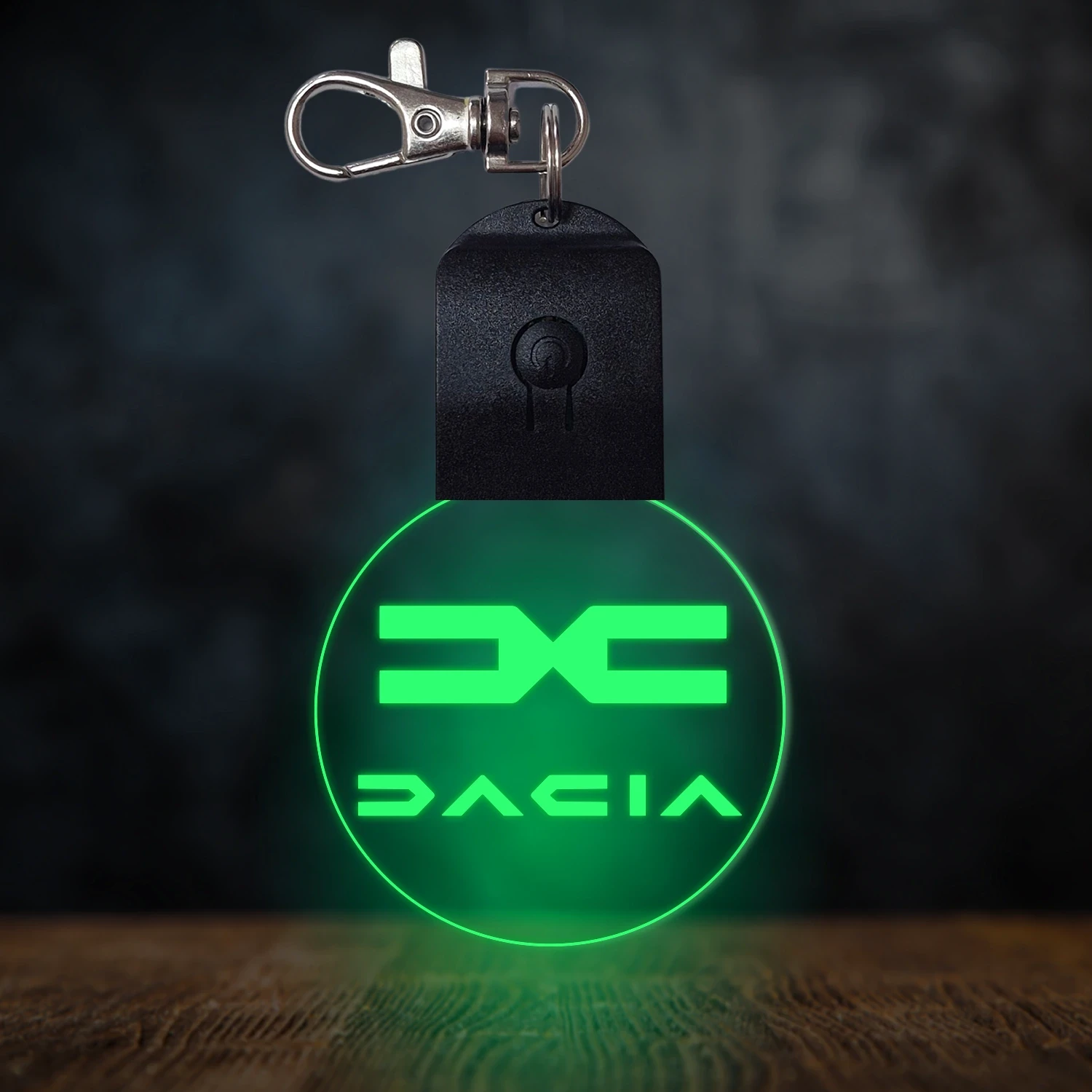 A kulcstartó különleges élvilágítással rendelkezik, amelynek hatására a bekapcsolt állapotban az akril lap színe megváltozik. Alapvetően az akril átlátszó, azonban amikor bekapcsoljuk, a gravírozott részek színesen ragyognak. Kikapcsolt állapotban az átlátszó akrilon, a gravírozott részek fehér színnel láthatóak, így jól kivehetőek maradnak. 🎁