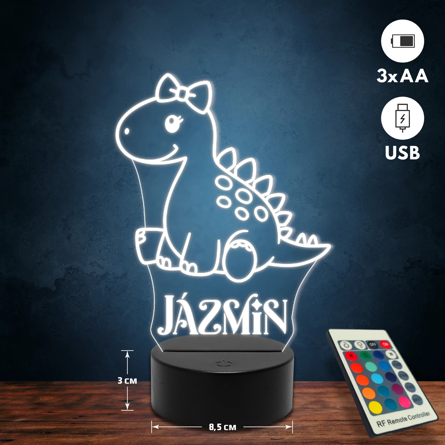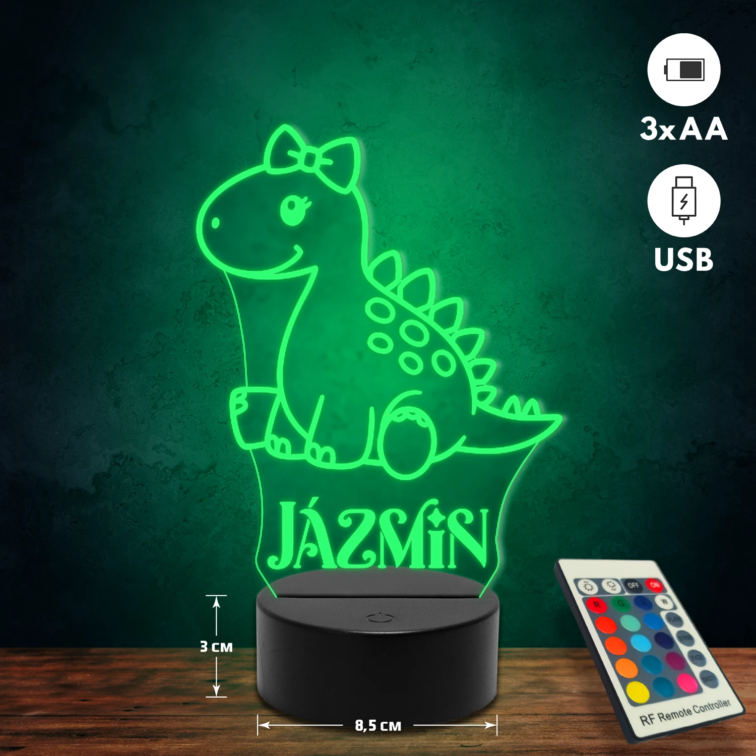 A 3D lámpa USB-kábellel is működtethető, amelyet egyszerűen csatlakoztathatsz számítógéphez, laptophoz vagy hálózati adapterhez. Emellett 3 darab AA elemmel is üzemeltethető (a csomag nem tartalmazza). A lámpa 16 különböző színben világíthat, emellett választhatóak a színváltási módok is: gyors villogás, lassú villogás vagy fokozatos színátmenet. A fény kellemesen lágy, a fényerőt pedig könnyedén állíthatod a mellékelt távirányító segítségével.