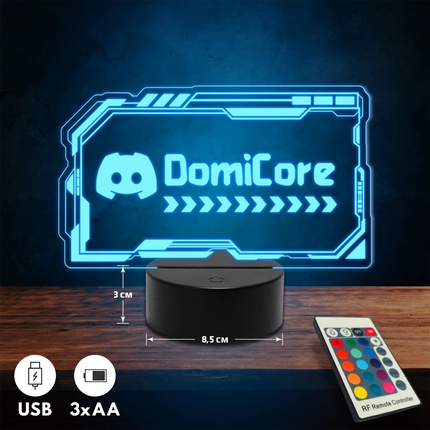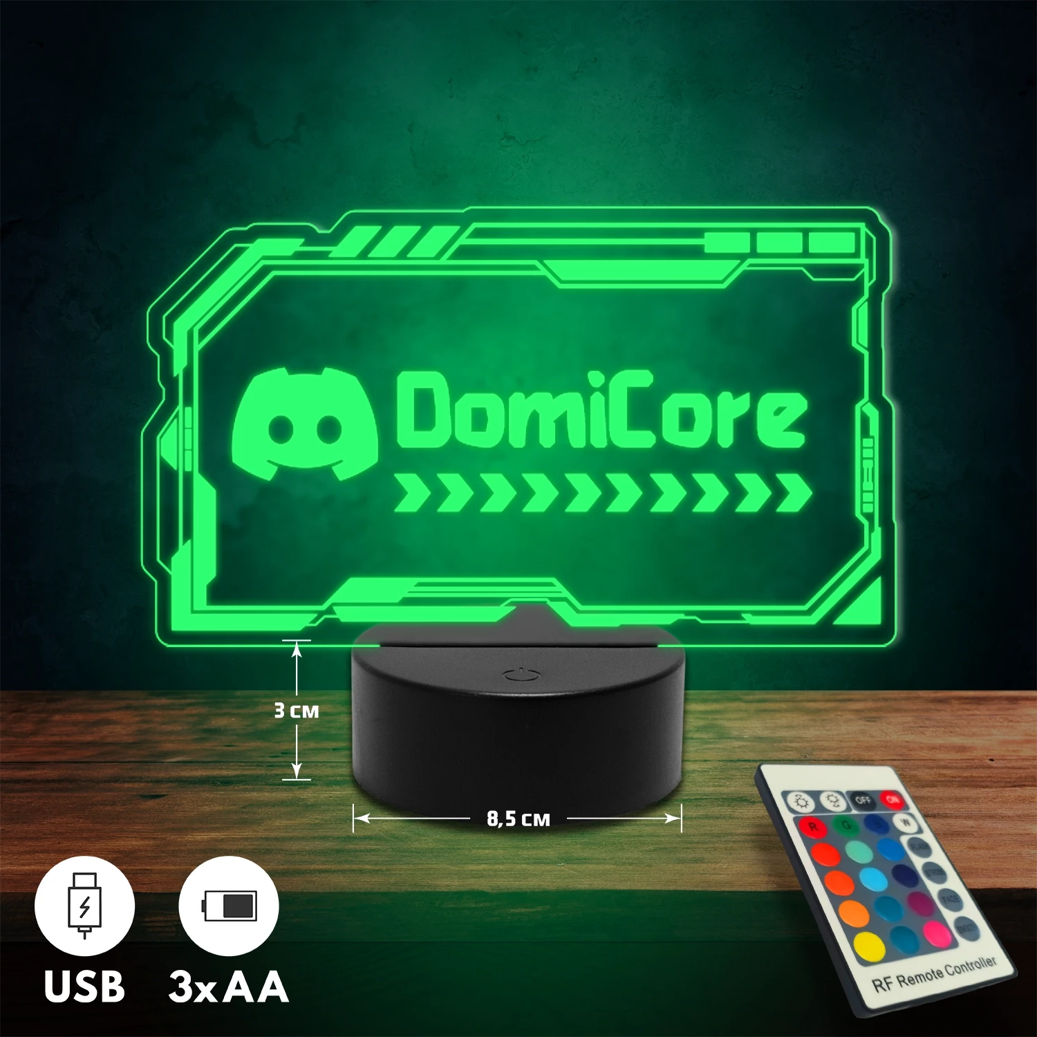 A 3D lámpa USB-kábellel is működtethető, amelyet egyszerűen csatlakoztathatsz számítógéphez, laptophoz vagy hálózati adapterhez. Emellett 3 darab AA elemmel is üzemeltethető (a csomag nem tartalmazza). A lámpa 16 különböző színben világíthat, emellett választhatóak a színváltási módok is: gyors villogás, lassú villogás vagy fokozatos színátmenet. A fény kellemesen lágy, a fényerőt pedig könnyedén állíthatod a mellékelt távirányító segítségével.