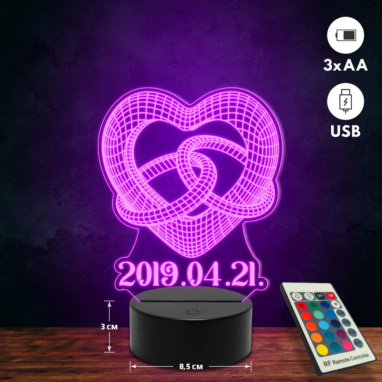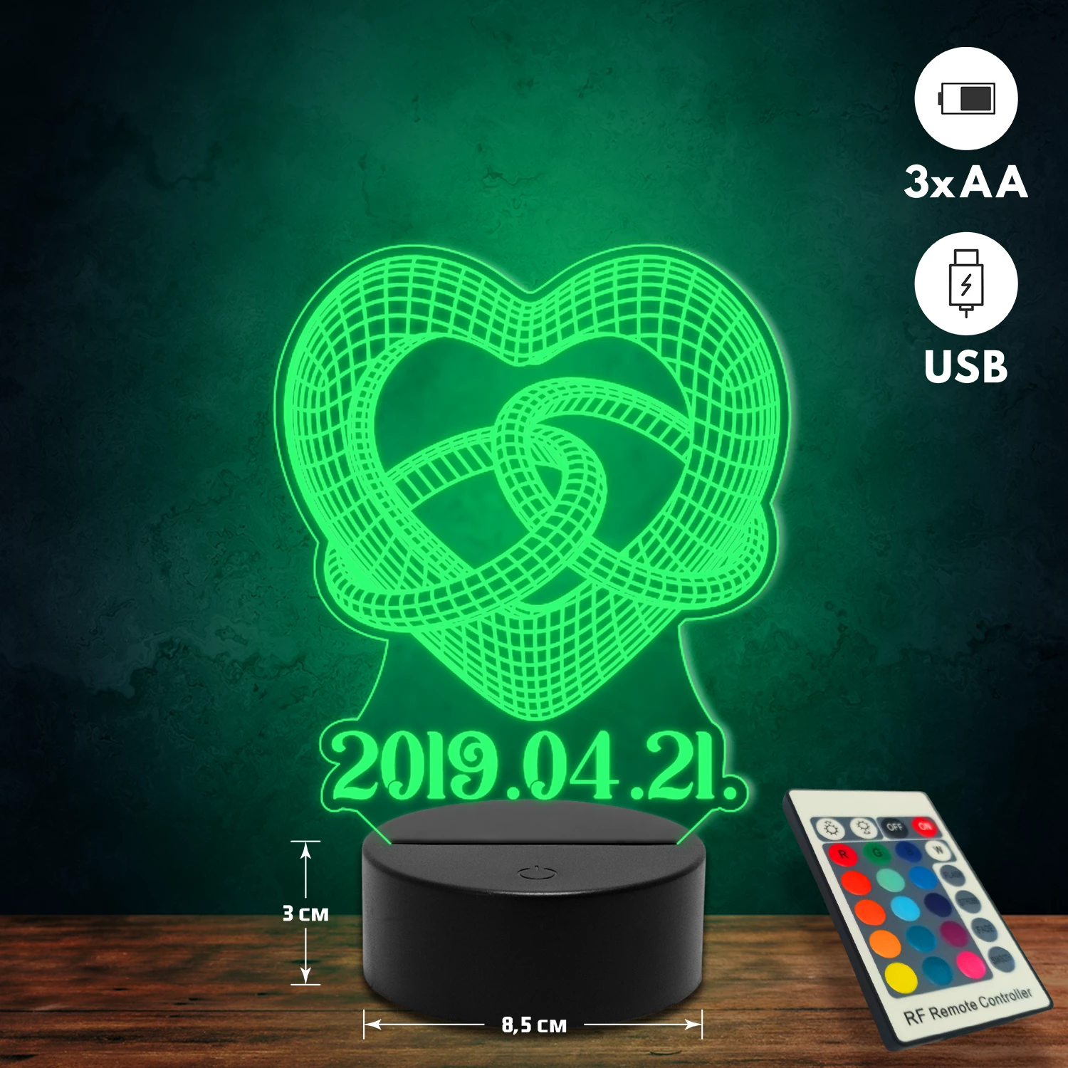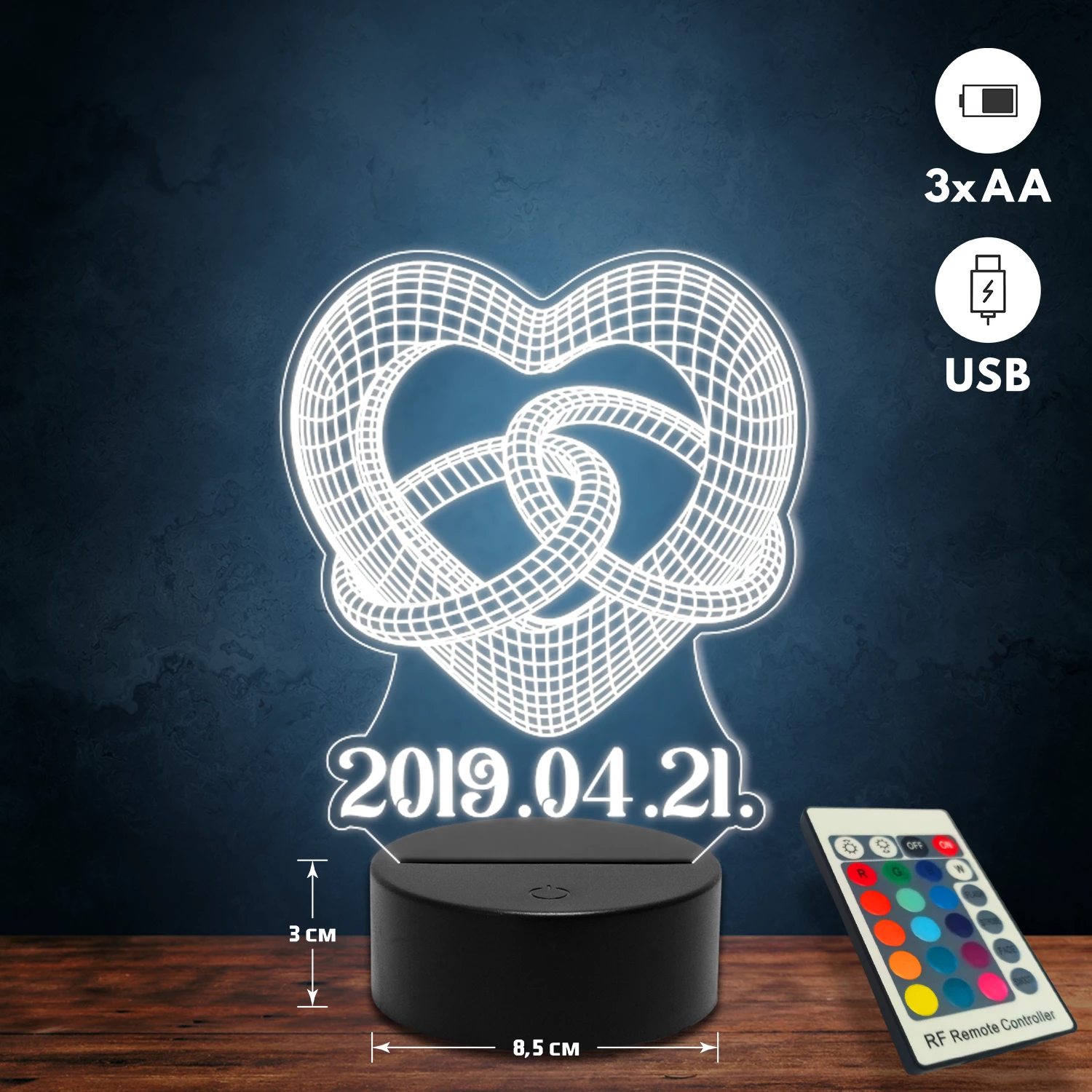 A 3D lámpa USB-kábellel is működtethető, amelyet egyszerűen csatlakoztathatsz számítógéphez, laptophoz vagy hálózati adapterhez. Emellett 3 darab AA elemmel is üzemeltethető (a csomag nem tartalmazza). A lámpa 16 különböző színben világíthat, emellett választhatóak a színváltási módok is: gyors villogás, lassú villogás vagy fokozatos színátmenet. A fény kellemesen lágy, a fényerőt pedig könnyedén állíthatod a mellékelt távirányító segítségével.