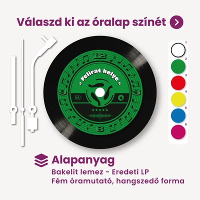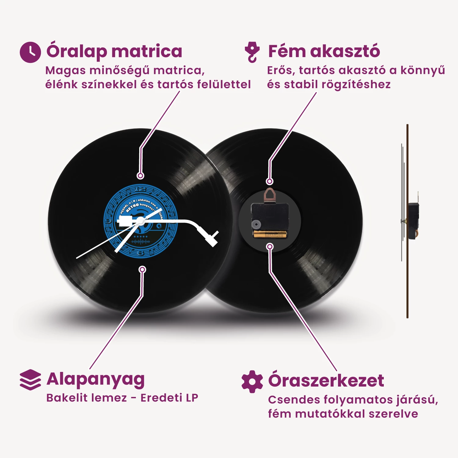 A szöveges óralap dizájnját mi készítettük, amely a régi bakelit albumok retro címkéinek hangulatát idézi. 6 választható szín közül dönthetsz, így az óra még inkább illeszkedik stílusodhoz vagy az ajándékozott ízléséhez.