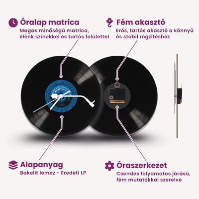 Óráink eredeti LP lemezekből készülnek, így minden darab igazán különleges. A mutatók formavilága a lemezjátszó hangszedőjét idézi, fémből készülnek, színük pedig harmonizál az óra anyagával.