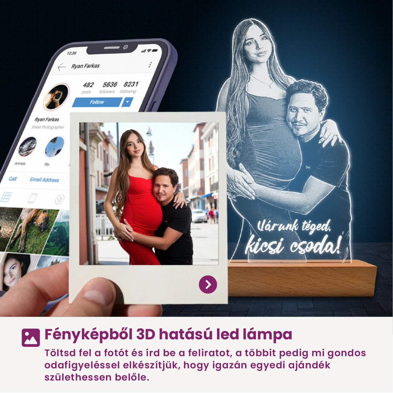 Fontos: A terméknév és a termékkép csak iránymutatás – te választod ki, milyen fotó kerüljön a lámpára. Legyen családi, páros vagy akár kisállatos kép, mindig személyre szabott és egyedi darabot készítünk!