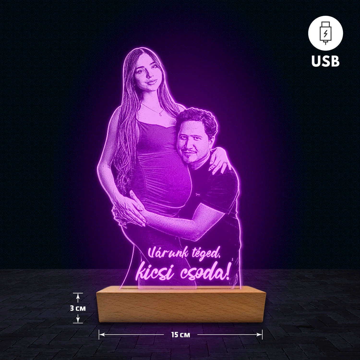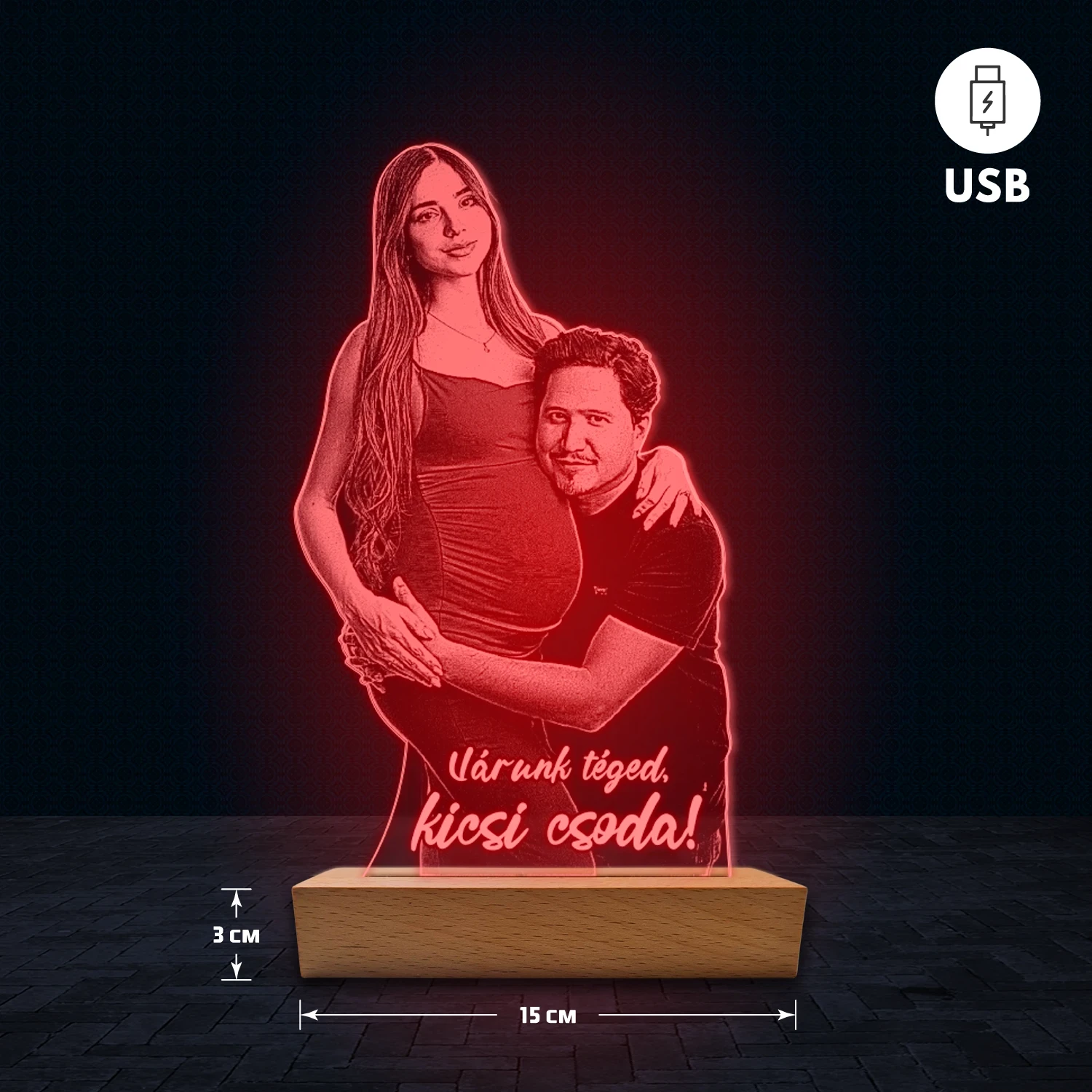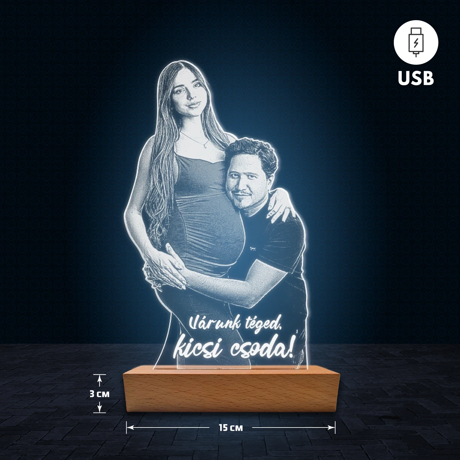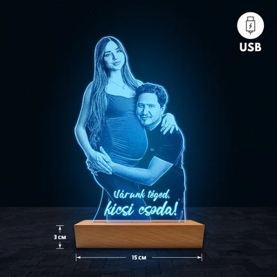 A 3D hatású led lámpa különlegessége, hogy az akril lemezre fényképedet gravírozzuk, így teljesen személyre szabható. Egyedi feliratot – például nevet, dátumot vagy rövid üzenetet – is megadhatsz hozzá, ezért ajándéknak is tökéletes választás. A lámpa természetes fa talppal készül, amely dekoratív és elegáns megjelenést biztosít. 🎁