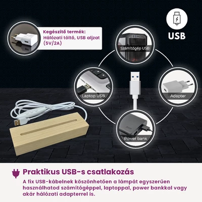 A lámpa USB-kábellel működik, amely fixen rögzítve van a fa talphoz. Az USB-t egyszerűen csatlakoztathatod számítógéphez, laptophoz vagy hálózati adapterhez. (Adapter opcionálisan rendelhető.) A vezetéken található a vezérlő egység, amelyen három gomb kapott helyet:
