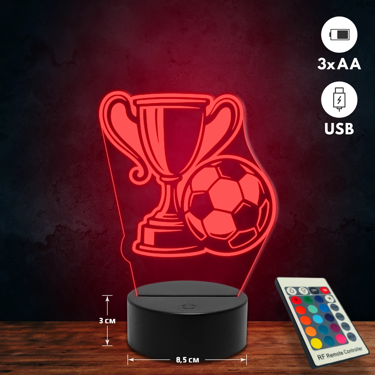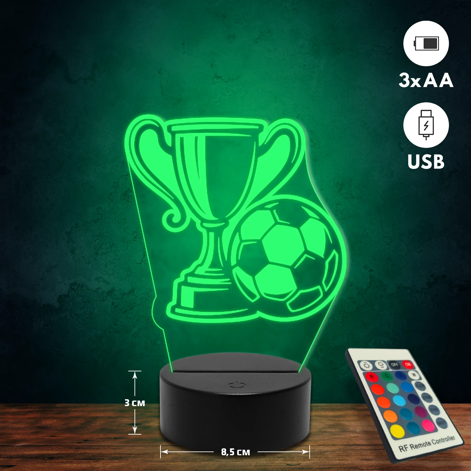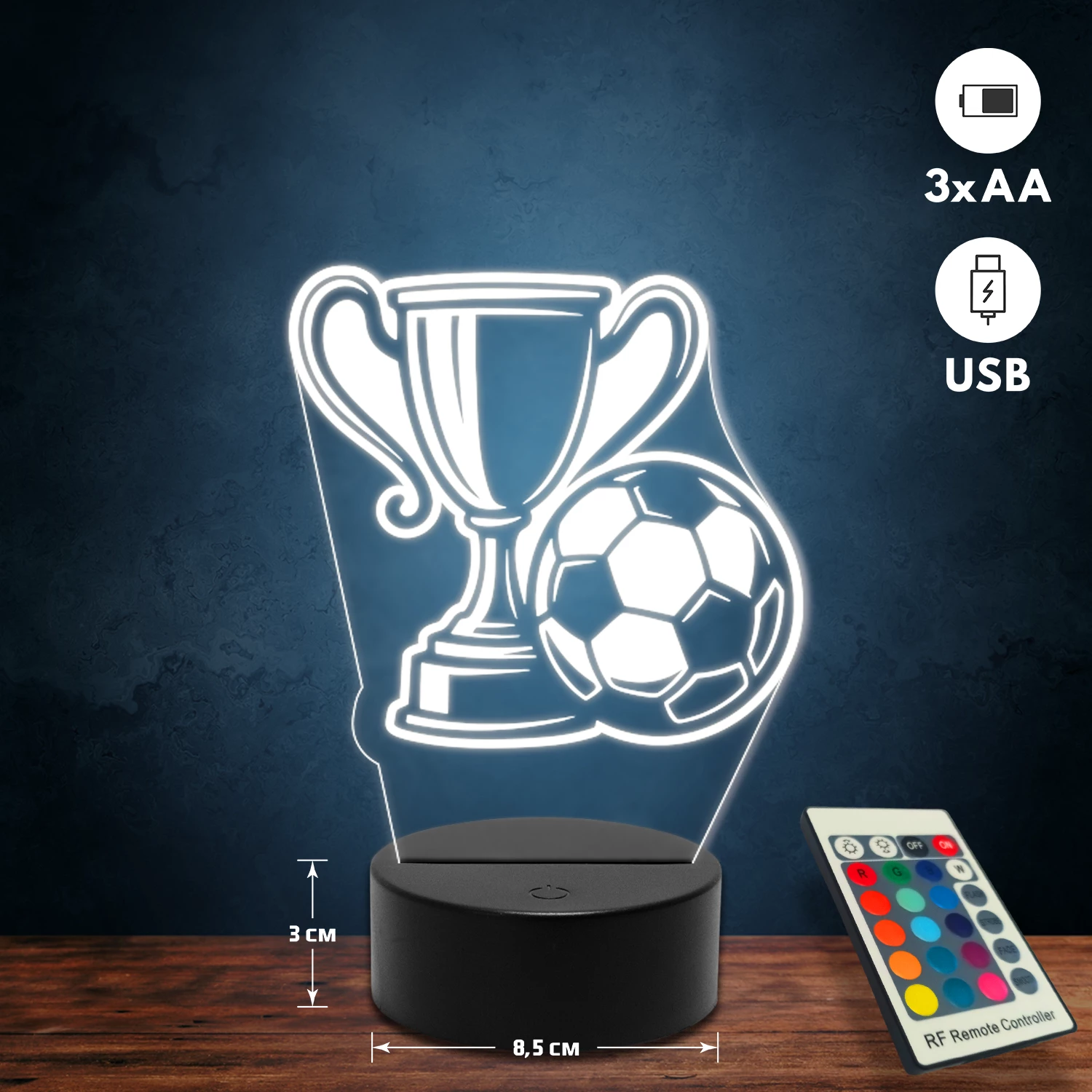 A 3D lámpa USB-kábellel is működtethető, amelyet egyszerűen csatlakoztathatsz számítógéphez, laptophoz vagy hálózati adapterhez. Emellett 3 darab AA elemmel is üzemeltethető (a csomag nem tartalmazza). A lámpa 16 különböző színben világíthat, emellett választhatóak a színváltási módok is: gyors villogás, lassú villogás vagy fokozatos színátmenet. A fény kellemesen lágy, a fényerőt pedig könnyedén állíthatod a mellékelt távirányító segítségével.