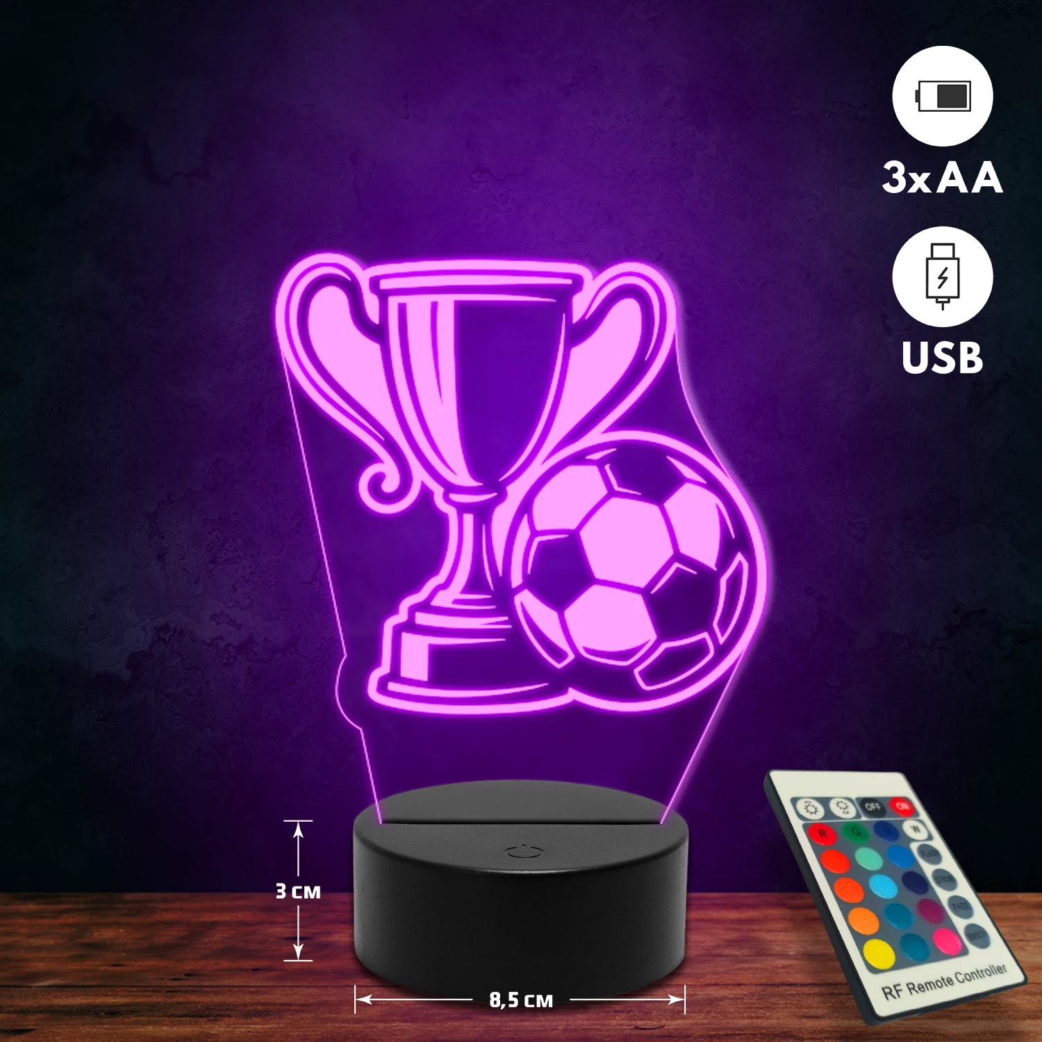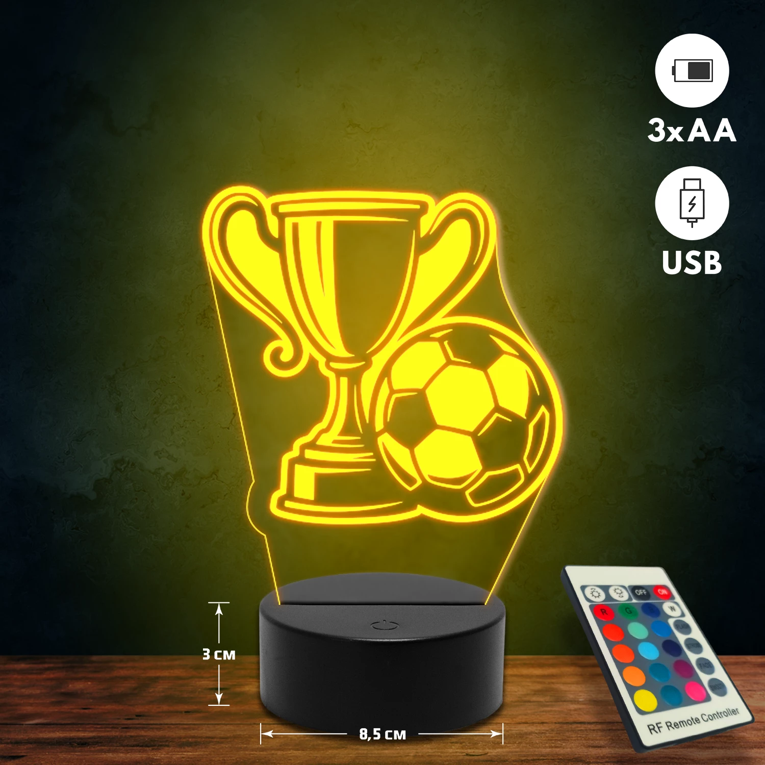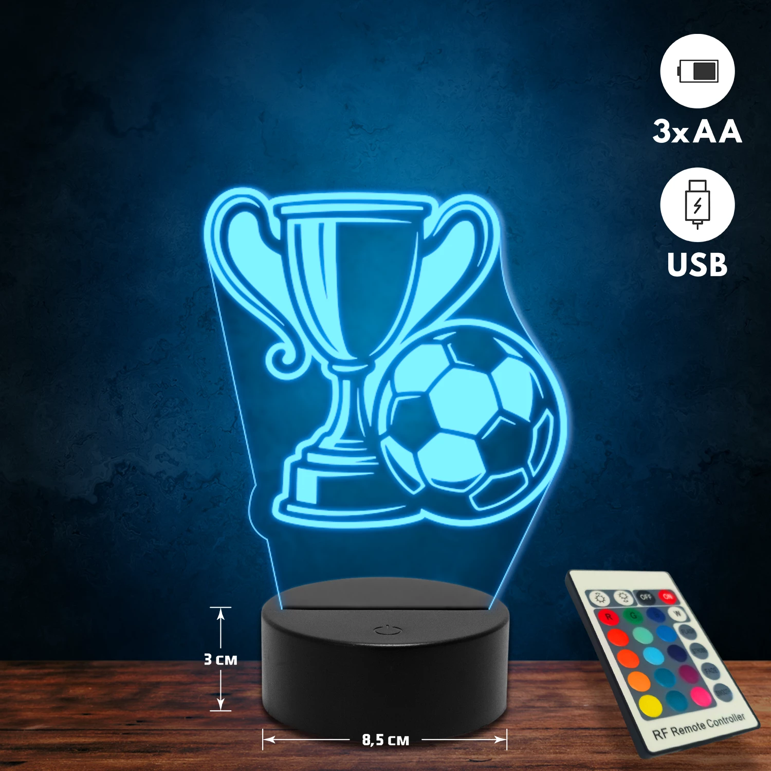 A 3D lámpa USB-kábellel is működtethető, amelyet egyszerűen csatlakoztathatsz számítógéphez, laptophoz vagy hálózati adapterhez. Emellett 3 darab AA elemmel is üzemeltethető (a csomag nem tartalmazza). A lámpa 16 különböző színben világíthat, emellett választhatóak a színváltási módok is: gyors villogás, lassú villogás vagy fokozatos színátmenet. A fény kellemesen lágy, a fényerőt pedig könnyedén állíthatod a mellékelt távirányító segítségével.