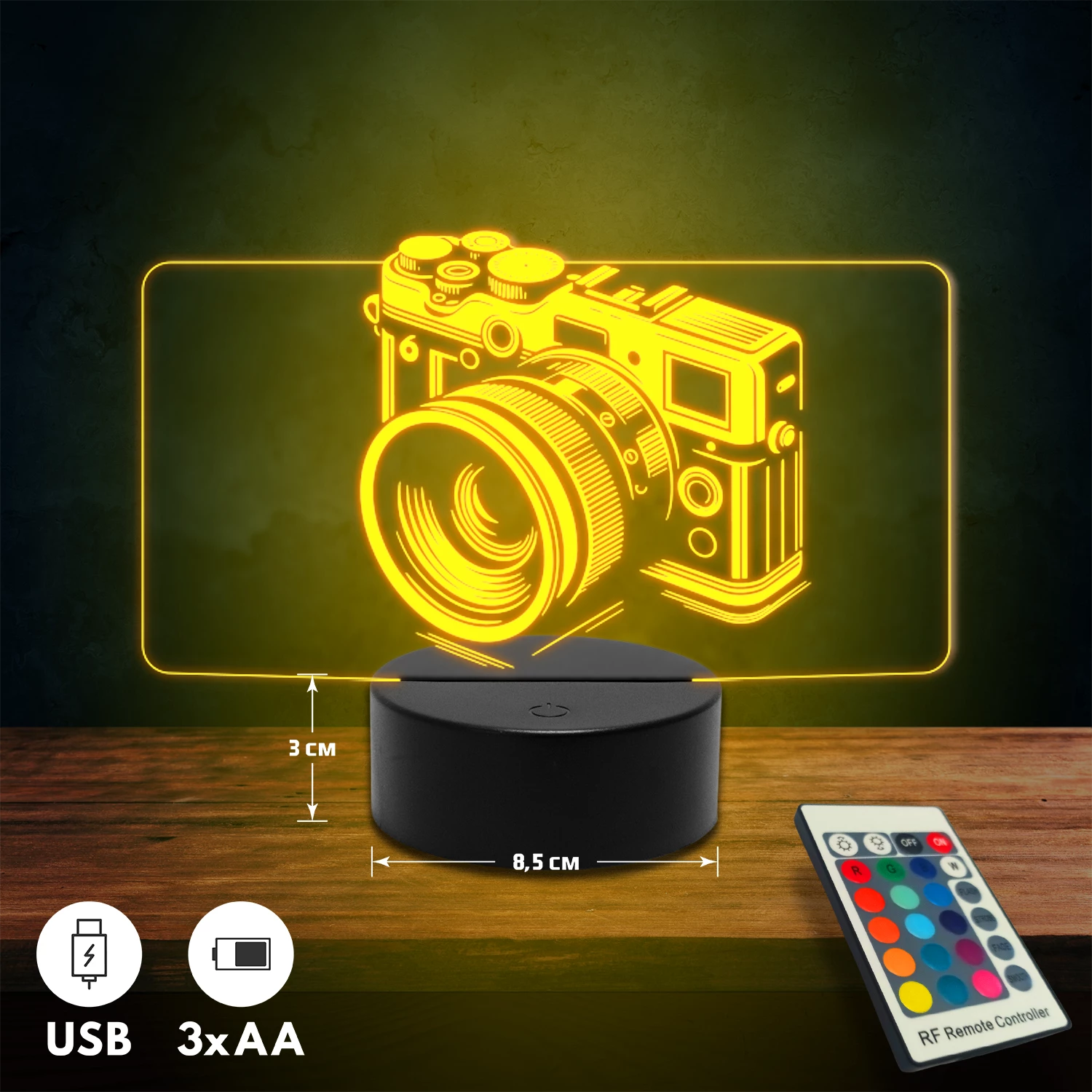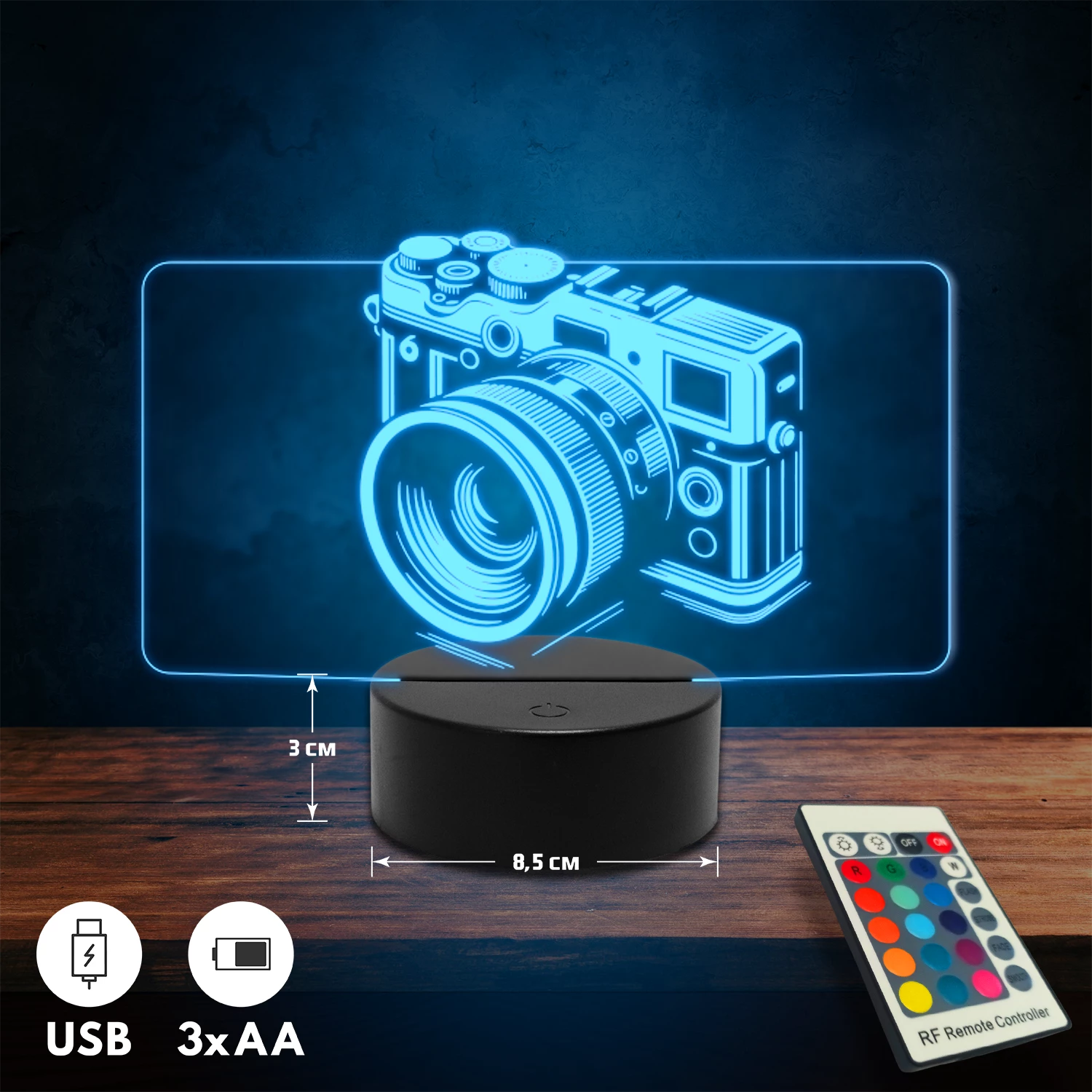 A 3D lámpa USB-kábellel is működtethető, amelyet egyszerűen csatlakoztathatsz számítógéphez, laptophoz vagy hálózati adapterhez. Emellett 3 darab AA elemmel is üzemeltethető (a csomag nem tartalmazza). A lámpa 16 különböző színben világíthat, emellett választhatóak a színváltási módok is: gyors villogás, lassú villogás vagy fokozatos színátmenet. A fény kellemesen lágy, a fényerőt pedig könnyedén állíthatod a mellékelt távirányító segítségével.