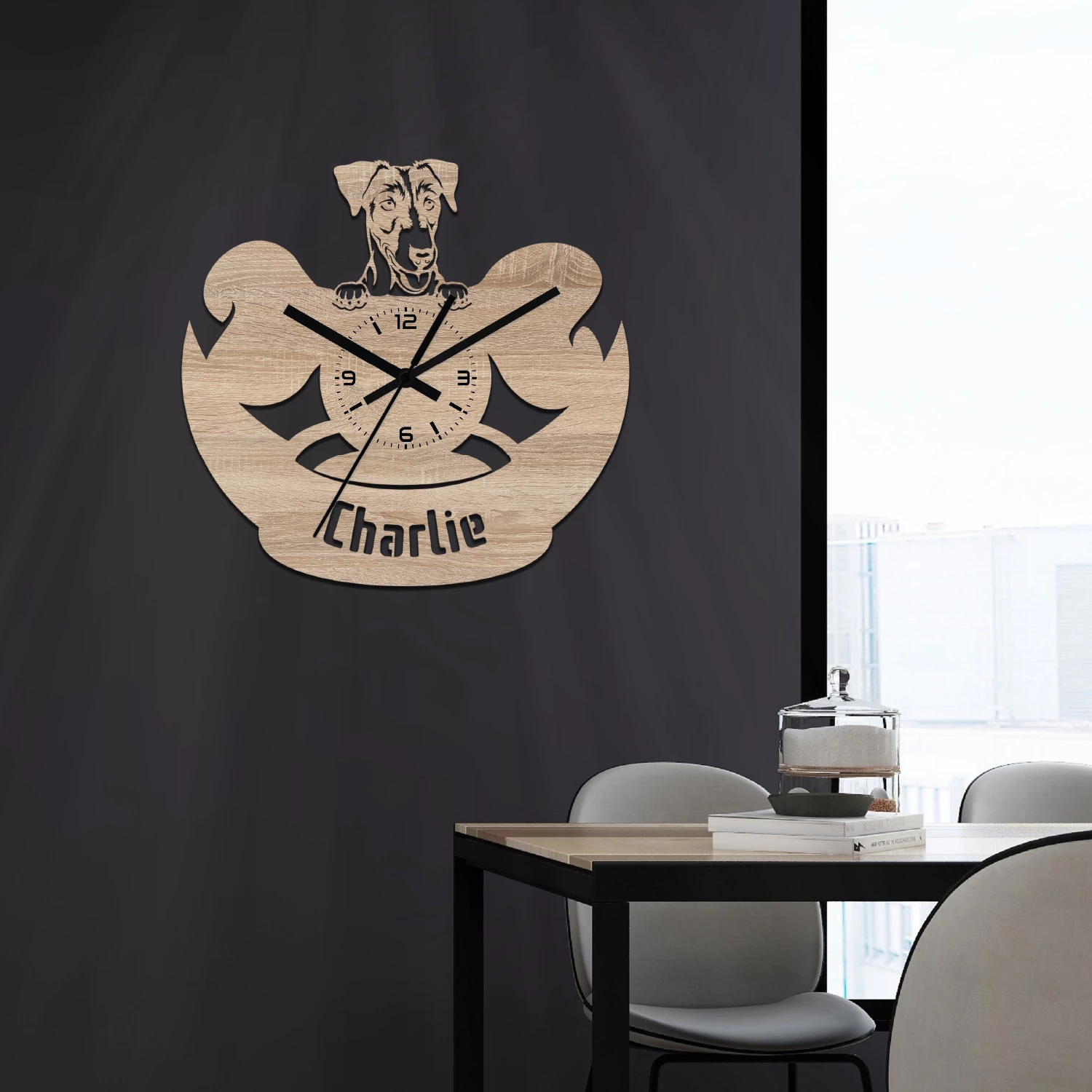 Bármelyik óránkra kérhetsz egyedi feliratot. A feliratokat – a minta alakzataihoz hasonlóan – kivágással készítjük el. A gyártáshoz stencil betűtípust használunk. Hosszabb vagy nagyobb méretű szövegeknél az alap mintán is végzünk kisebb módosításokat. A képek között találsz néhány példát egyedi feliratos óráinkról, amelyeket korábbi megrendelésekhez készítettünk.