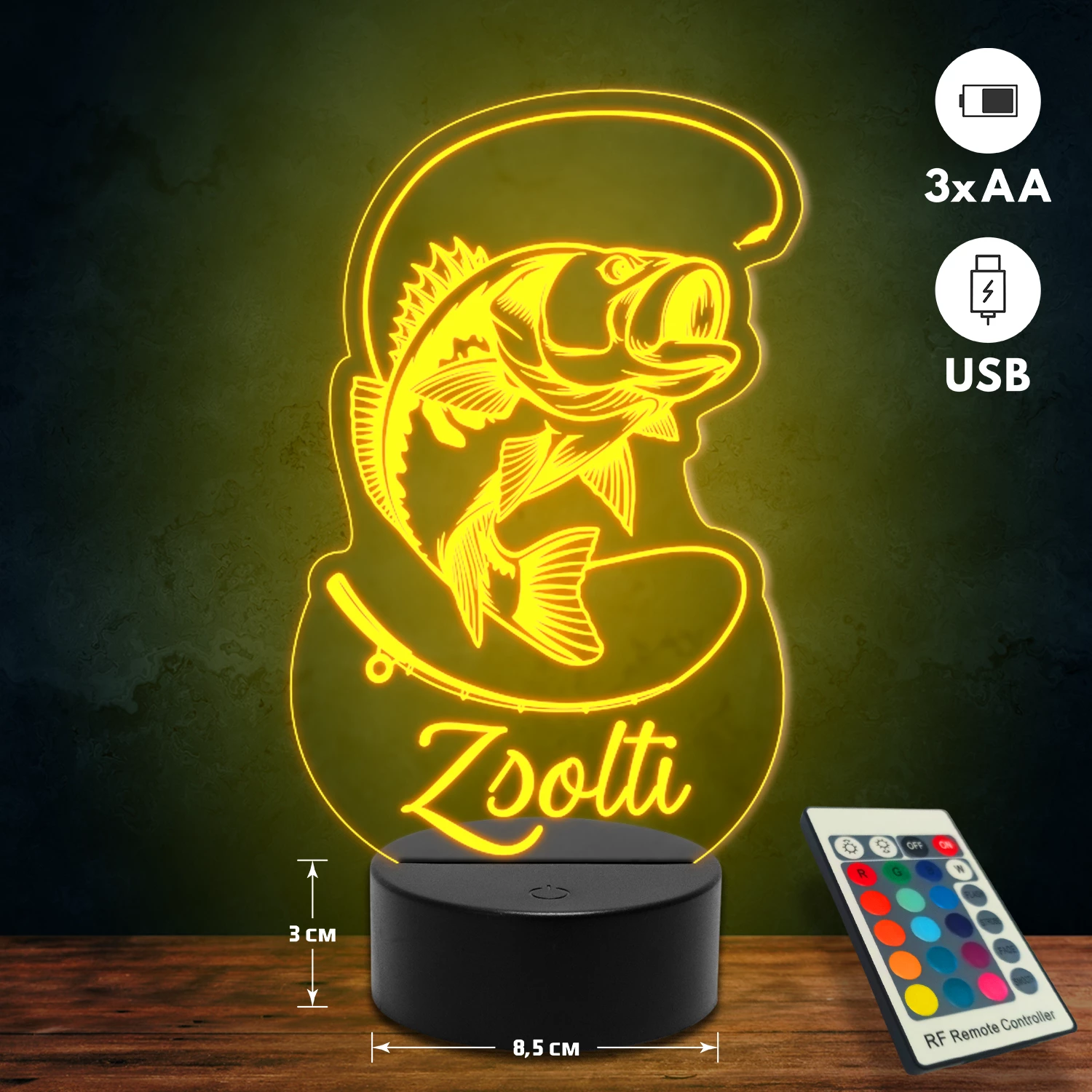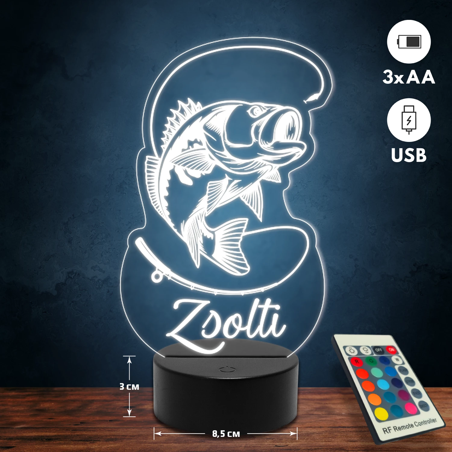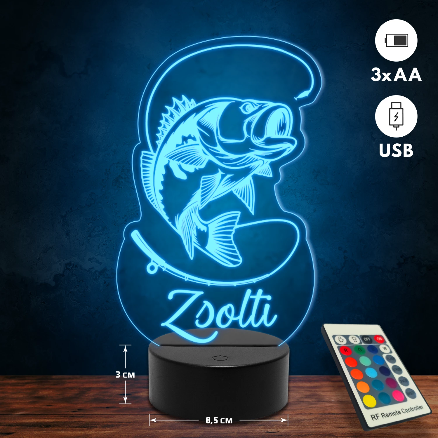 A 3D lámpa USB-kábellel is működtethető, amelyet egyszerűen csatlakoztathatsz számítógéphez, laptophoz vagy hálózati adapterhez. Emellett 3 darab AA elemmel is üzemeltethető (a csomag nem tartalmazza). A lámpa 16 különböző színben világíthat, emellett választhatóak a színváltási módok is: gyors villogás, lassú villogás vagy fokozatos színátmenet. A fény kellemesen lágy, a fényerőt pedig könnyedén állíthatod a mellékelt távirányító segítségével.