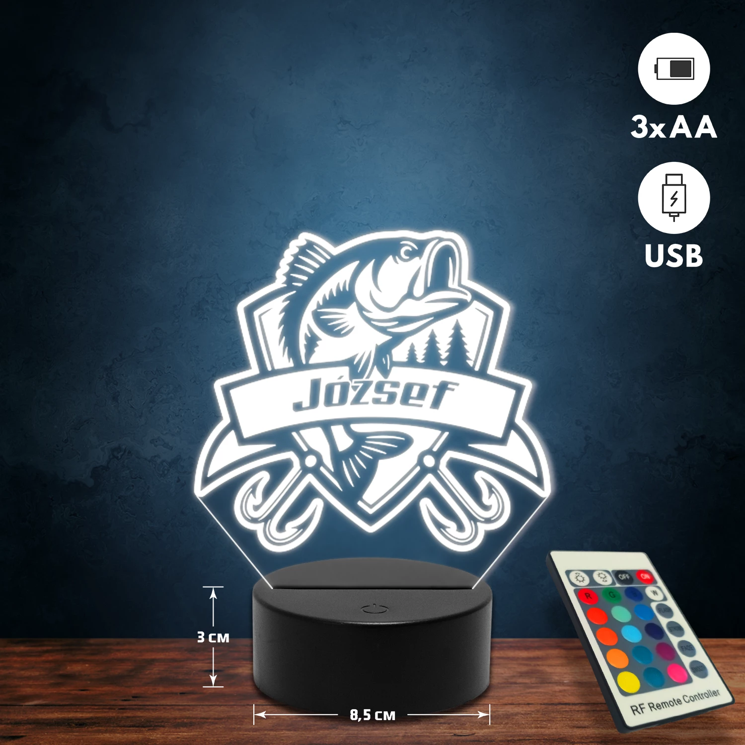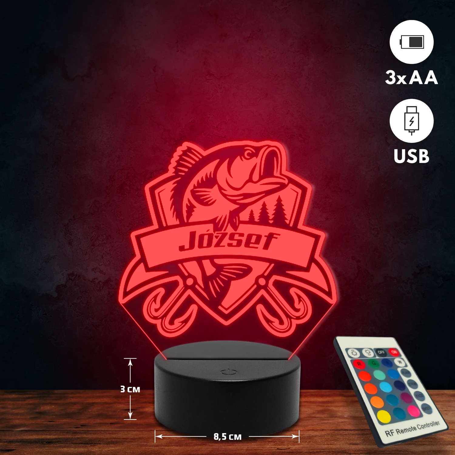 A 3D lámpa USB-kábellel is működtethető, amelyet egyszerűen csatlakoztathatsz számítógéphez, laptophoz vagy hálózati adapterhez. Emellett 3 darab AA elemmel is üzemeltethető (a csomag nem tartalmazza). A lámpa 16 különböző színben világíthat, emellett választhatóak a színváltási módok is: gyors villogás, lassú villogás vagy fokozatos színátmenet. A fény kellemesen lágy, a fényerőt pedig könnyedén állíthatod a mellékelt távirányító segítségével.