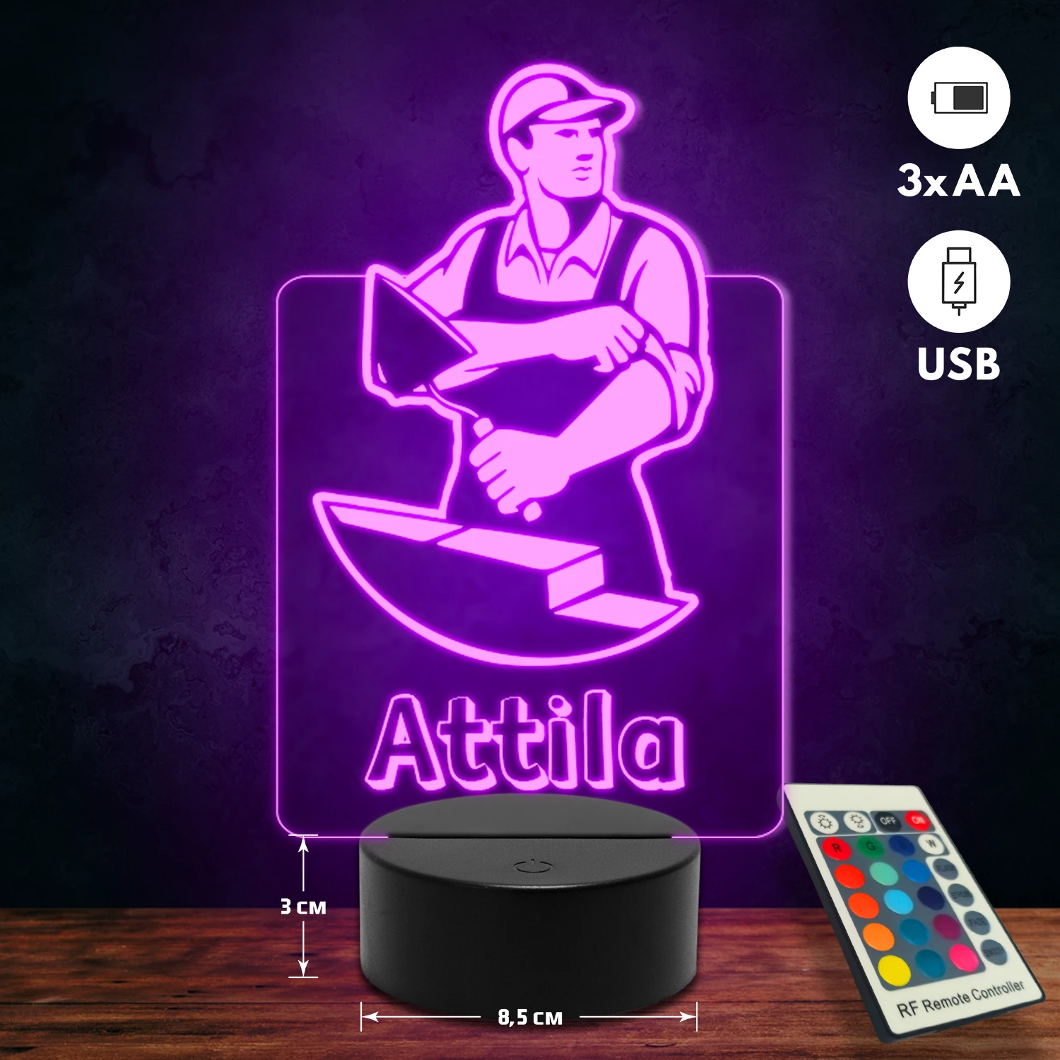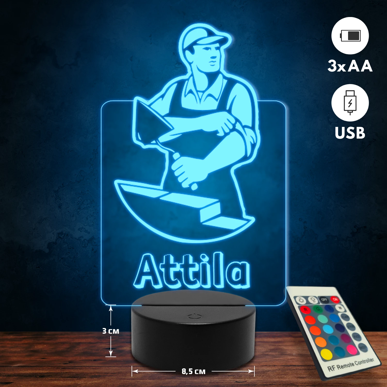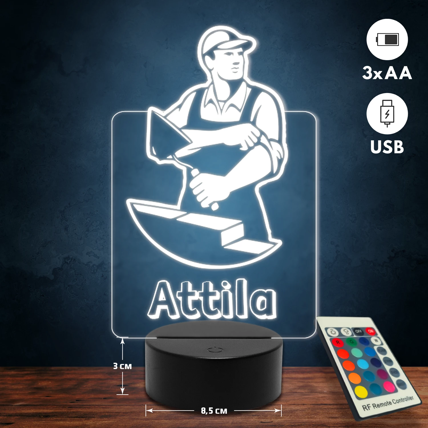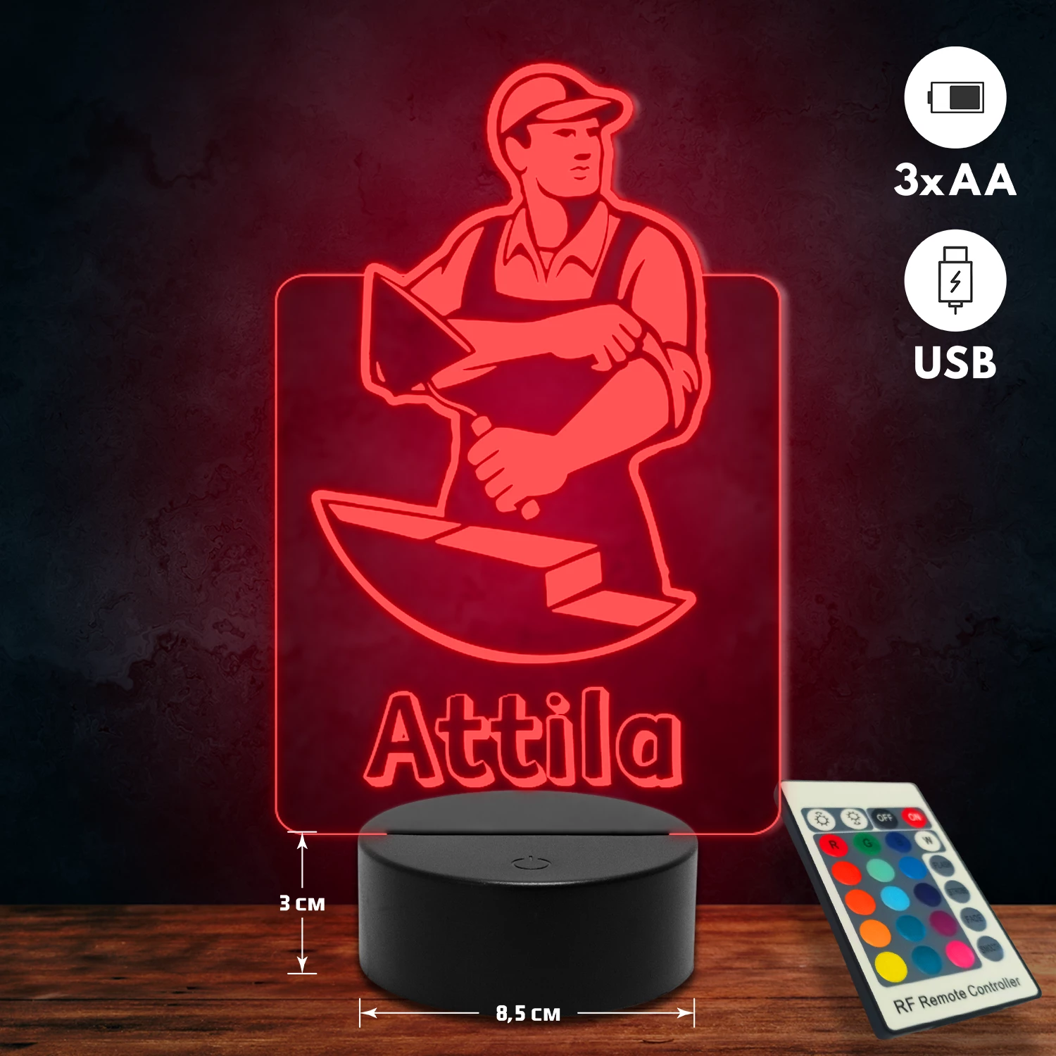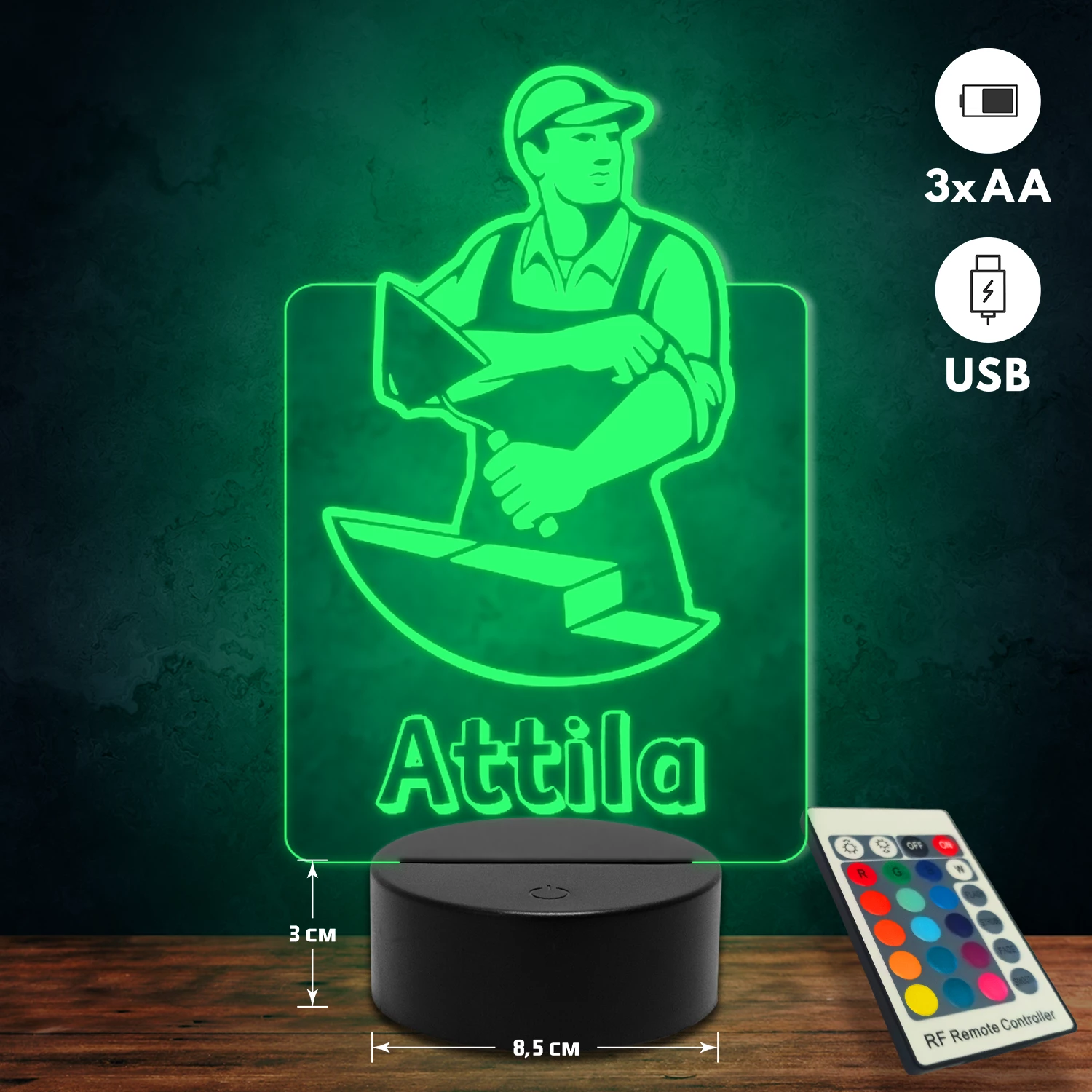 A 3D lámpa USB-kábellel is működtethető, amelyet egyszerűen csatlakoztathatsz számítógéphez, laptophoz vagy hálózati adapterhez. Emellett 3 darab AA elemmel is üzemeltethető (a csomag nem tartalmazza). A lámpa 16 különböző színben világíthat, emellett választhatóak a színváltási módok is: gyors villogás, lassú villogás vagy fokozatos színátmenet. A fény kellemesen lágy, a fényerőt pedig könnyedén állíthatod a mellékelt távirányító segítségével.