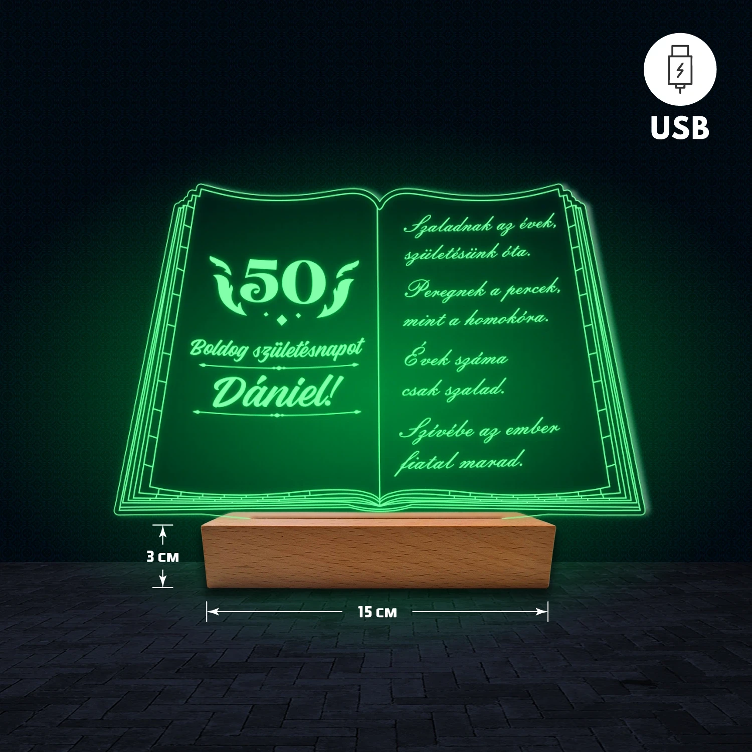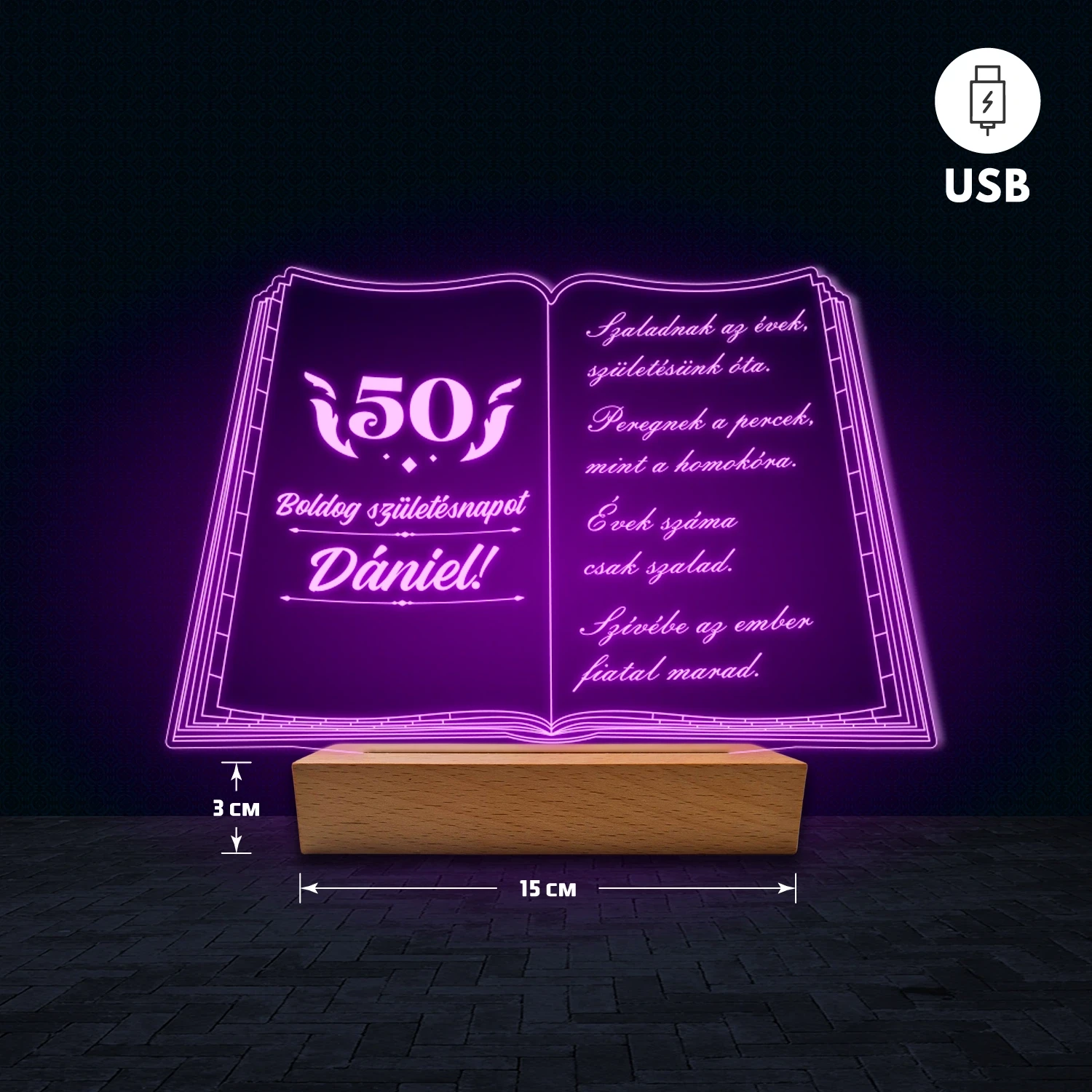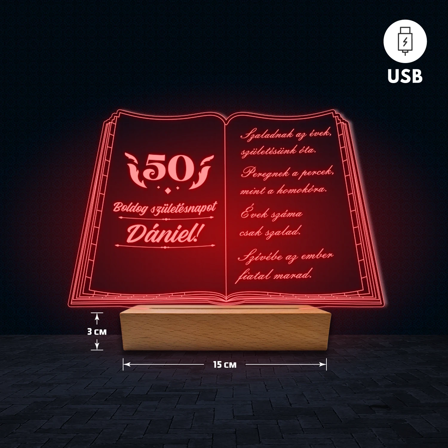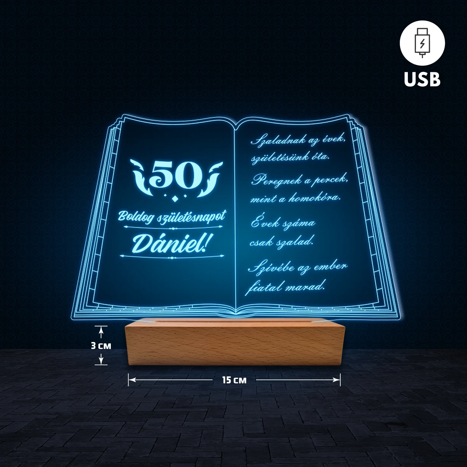 A 3D hatású LED lámpa különlegessége, hogy az akril lemezre az egyedi feliratod gravírozzuk, így teljesen személyre szabható. Nem csak nevet vagy dátumot adhatsz meg, hanem akár hosszabb szöveget is – legyen az idézet, kedvenc dalrészlet, üzenet vagy bármilyen személyes szöveg, amit szeretnél. Ezért tökéletes ajándék, amely egyszerre különleges és személyes. A lámpa természetes fa talppal készül, amely dekoratív és elegáns megjelenést biztosít. 🎁
