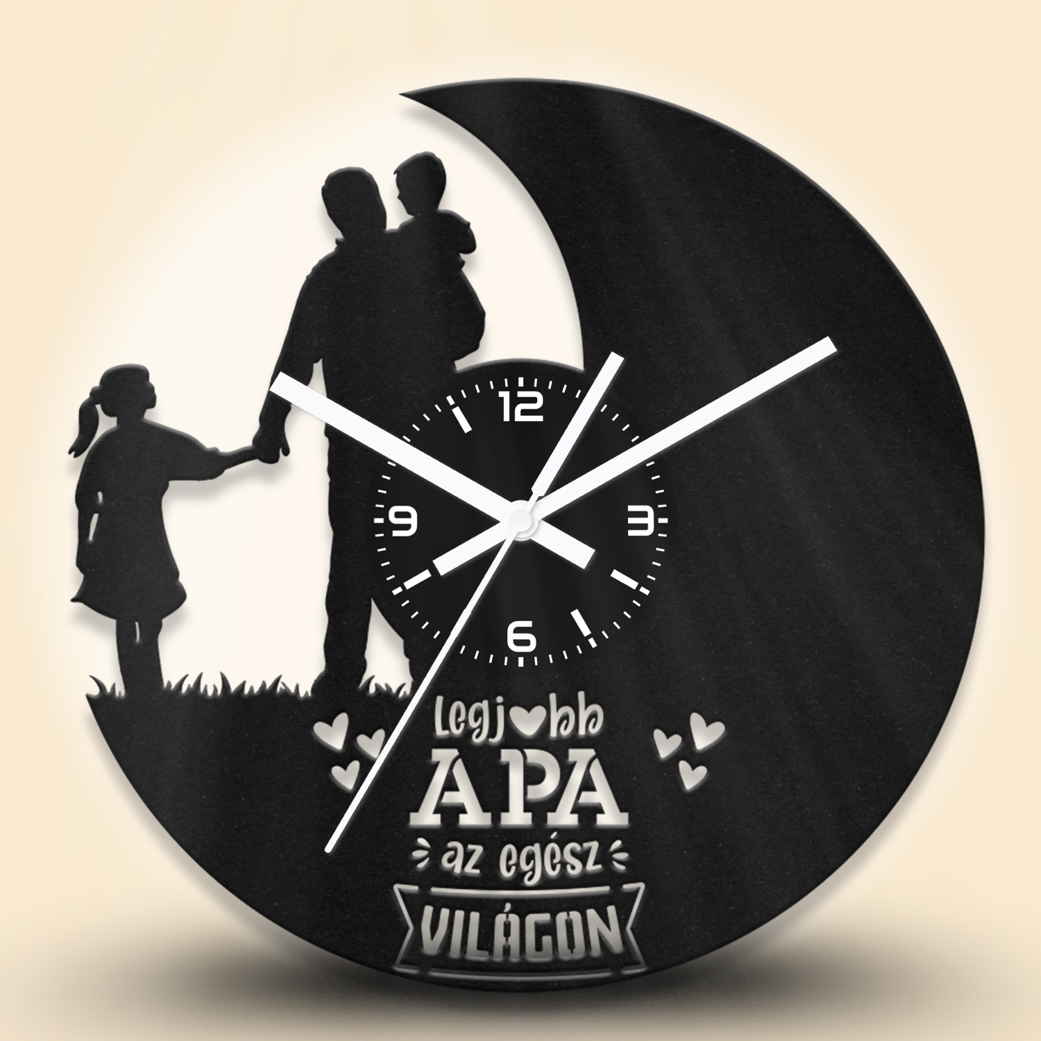 Bármelyik óránkra kérhetsz egyedi feliratot. A feliratokat – a minta alakzataihoz hasonlóan – kivágással készítjük el. A gyártáshoz stencil betűtípust használunk. Hosszabb vagy nagyobb méretű szövegeknél az alap mintán is végzünk kisebb módosításokat. A képek között találsz néhány példát egyedi feliratos óráinkról, amelyeket korábbi megrendelésekhez készítettünk.