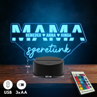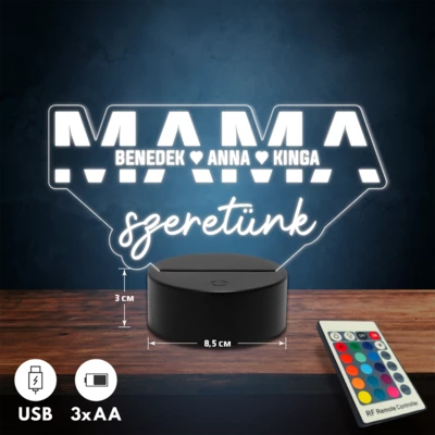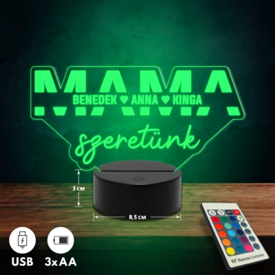 A 3D lámpa USB-kábellel is működtethető, amelyet egyszerűen csatlakoztathatsz számítógéphez, laptophoz vagy hálózati adapterhez. Emellett 3 darab AA elemmel is üzemeltethető (a csomag nem tartalmazza). A lámpa 16 különböző színben világíthat, emellett választhatóak a színváltási módok is: gyors villogás, lassú villogás vagy fokozatos színátmenet. A fény kellemesen lágy, a fényerőt pedig könnyedén állíthatod a mellékelt távirányító segítségével.