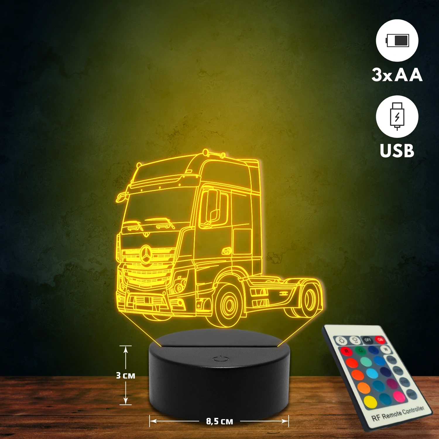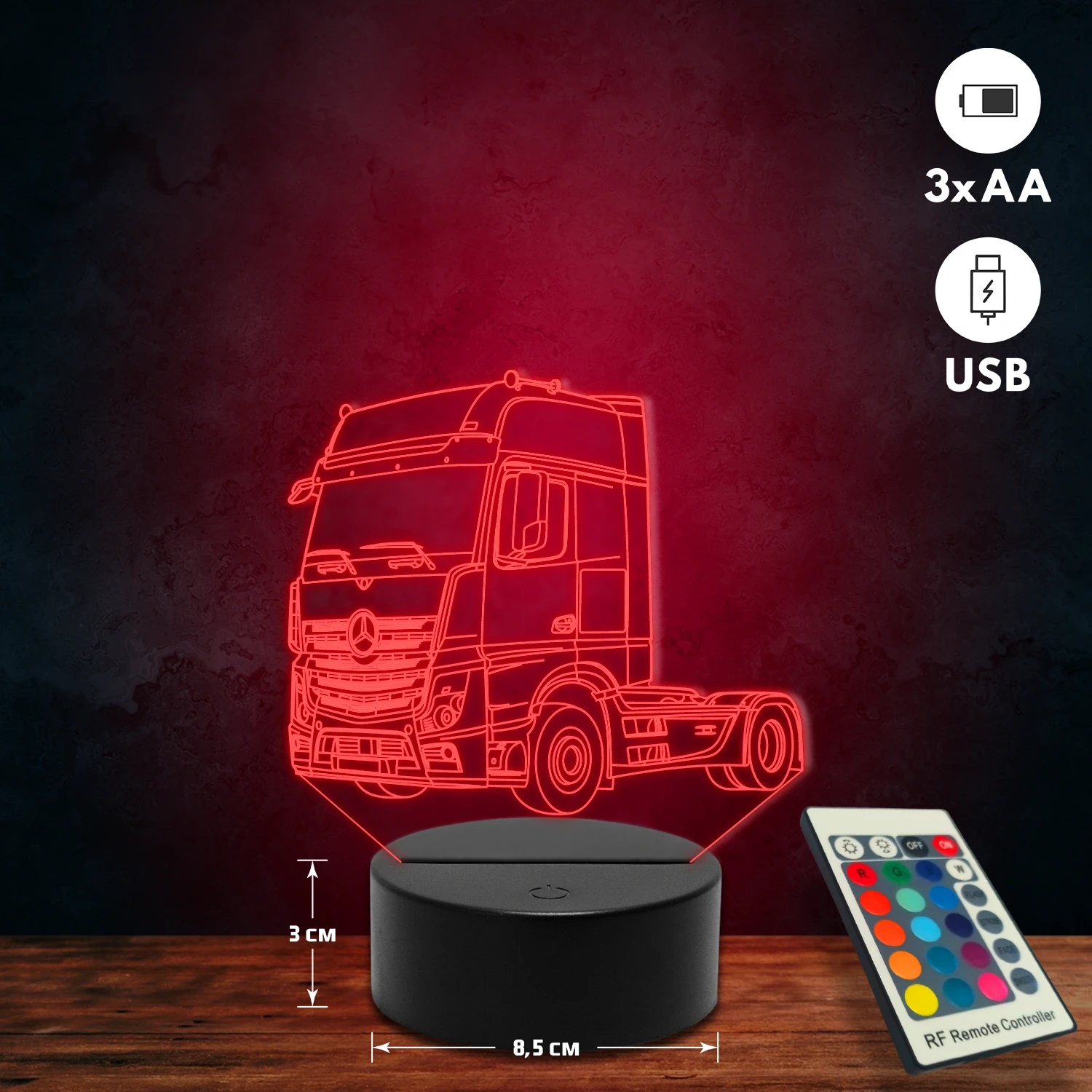 A 3D lámpa USB-kábellel is működtethető, amelyet egyszerűen csatlakoztathatsz számítógéphez, laptophoz vagy hálózati adapterhez. Emellett 3 darab AA elemmel is üzemeltethető (a csomag nem tartalmazza). A lámpa 16 különböző színben világíthat, emellett választhatóak a színváltási módok is: gyors villogás, lassú villogás vagy fokozatos színátmenet. A fény kellemesen lágy, a fényerőt pedig könnyedén állíthatod a mellékelt távirányító segítségével.
