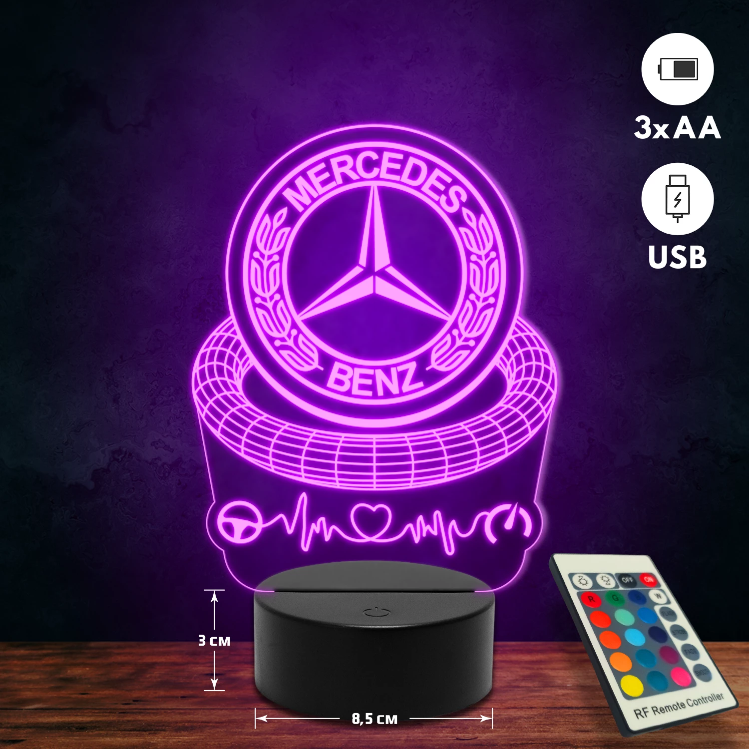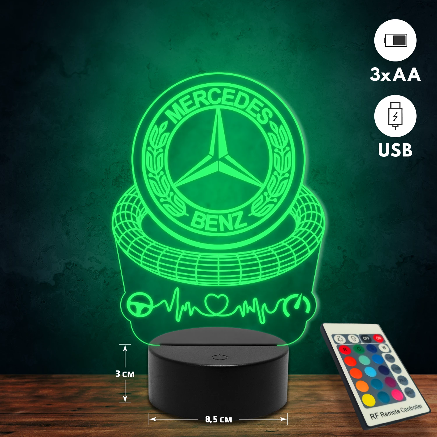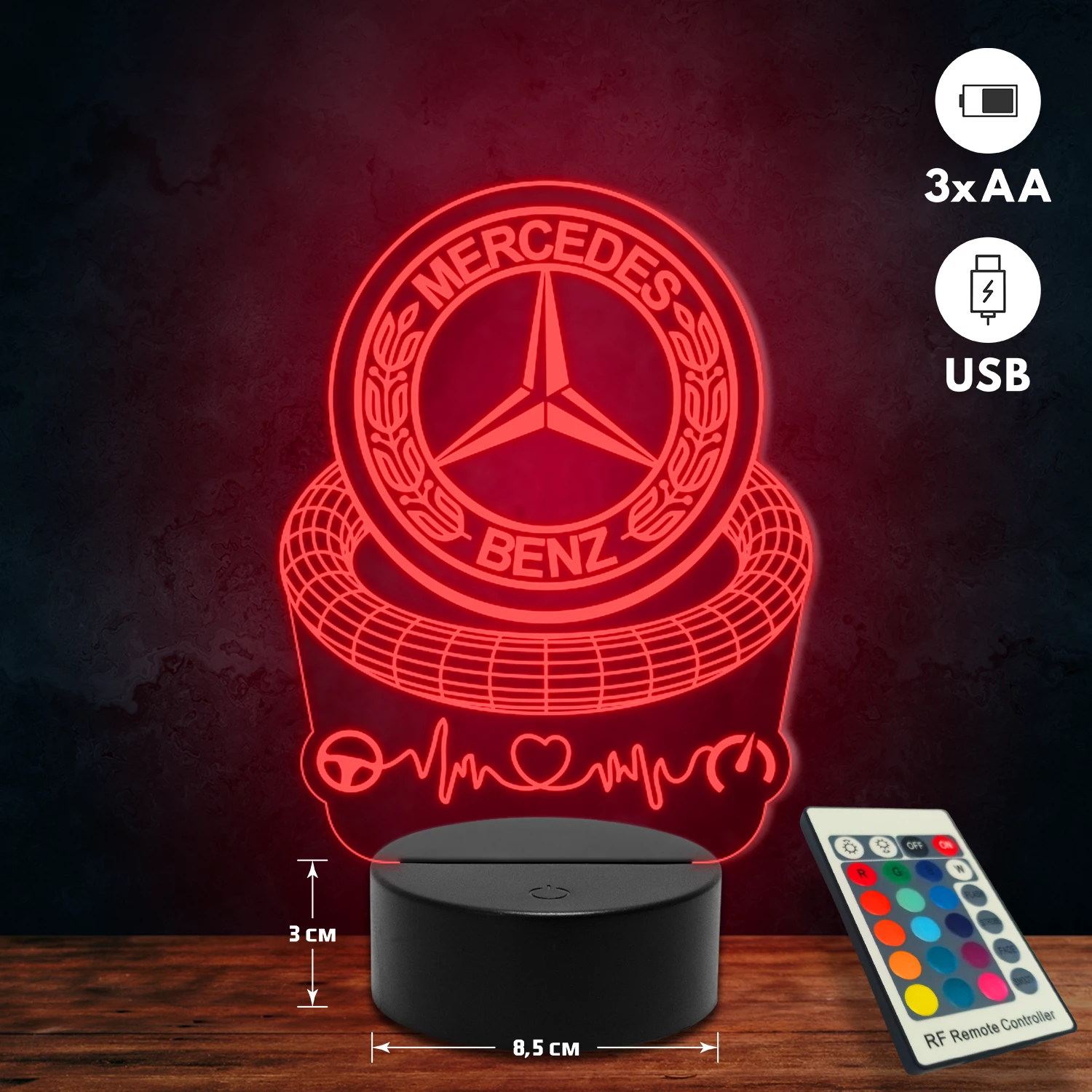 A 3D lámpa USB-kábellel is működtethető, amelyet egyszerűen csatlakoztathatsz számítógéphez, laptophoz vagy hálózati adapterhez. Emellett 3 darab AA elemmel is üzemeltethető (a csomag nem tartalmazza). A lámpa 16 különböző színben világíthat, emellett választhatóak a színváltási módok is: gyors villogás, lassú villogás vagy fokozatos színátmenet. A fény kellemesen lágy, a fényerőt pedig könnyedén állíthatod a mellékelt távirányító segítségével.