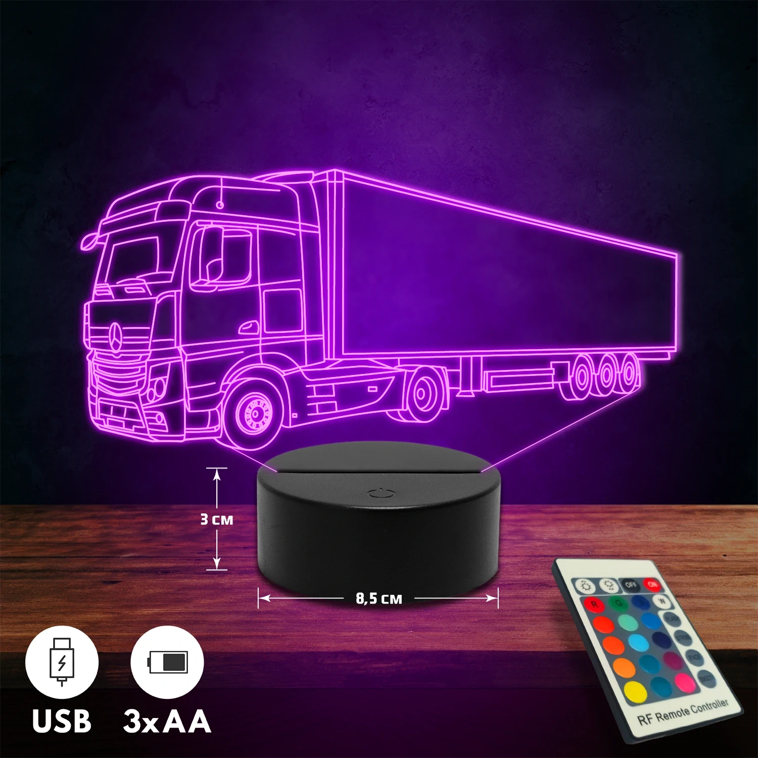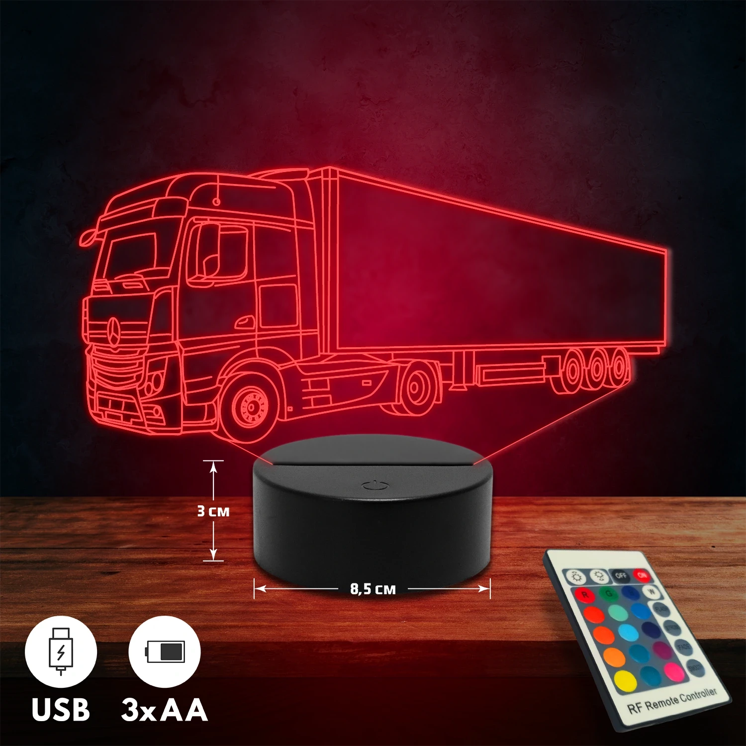 A 3D lámpa USB-kábellel is működtethető, amelyet egyszerűen csatlakoztathatsz számítógéphez, laptophoz vagy hálózati adapterhez. Emellett 3 darab AA elemmel is üzemeltethető (a csomag nem tartalmazza). A lámpa 16 különböző színben világíthat, emellett választhatóak a színváltási módok is: gyors villogás, lassú villogás vagy fokozatos színátmenet. A fény kellemesen lágy, a fényerőt pedig könnyedén állíthatod a mellékelt távirányító segítségével.