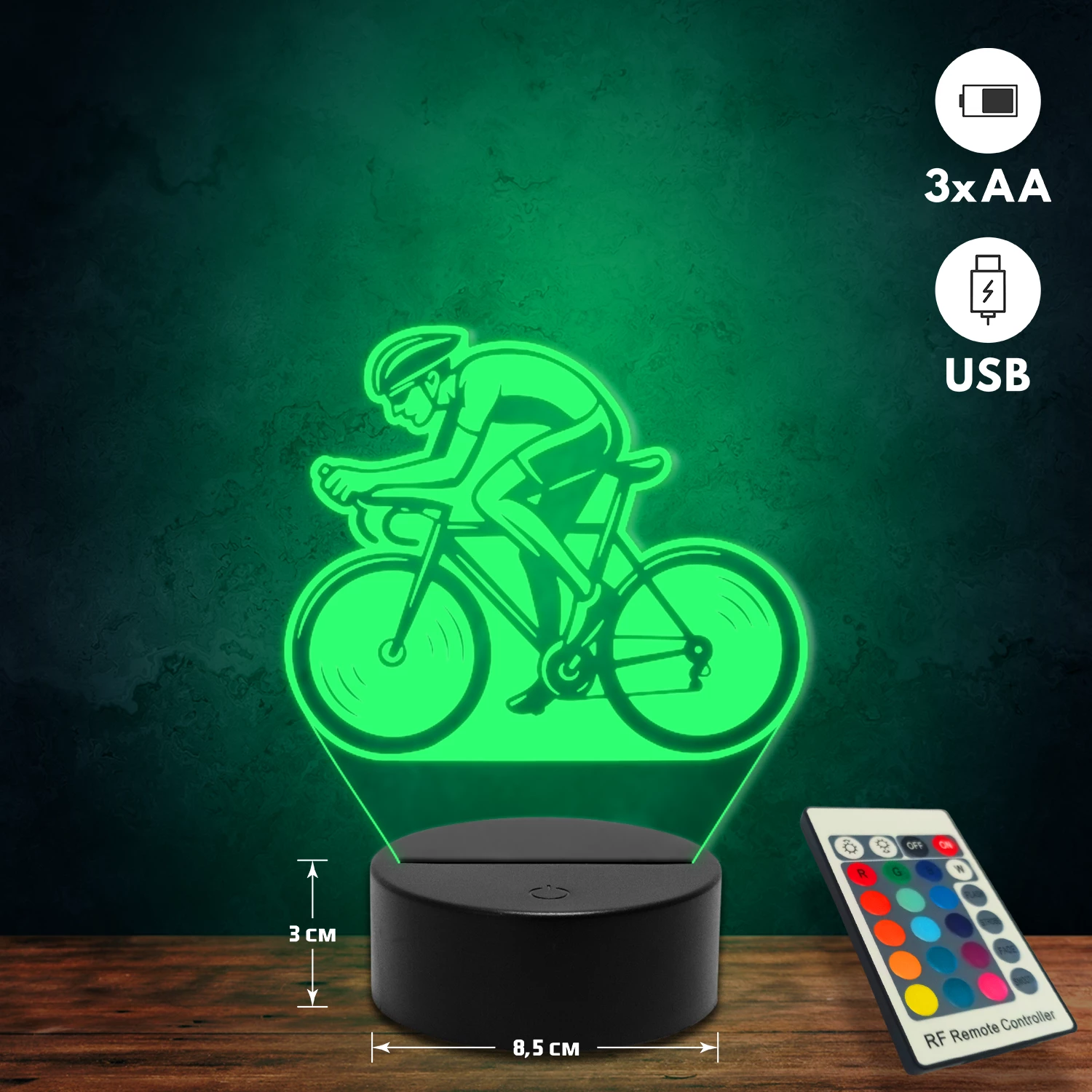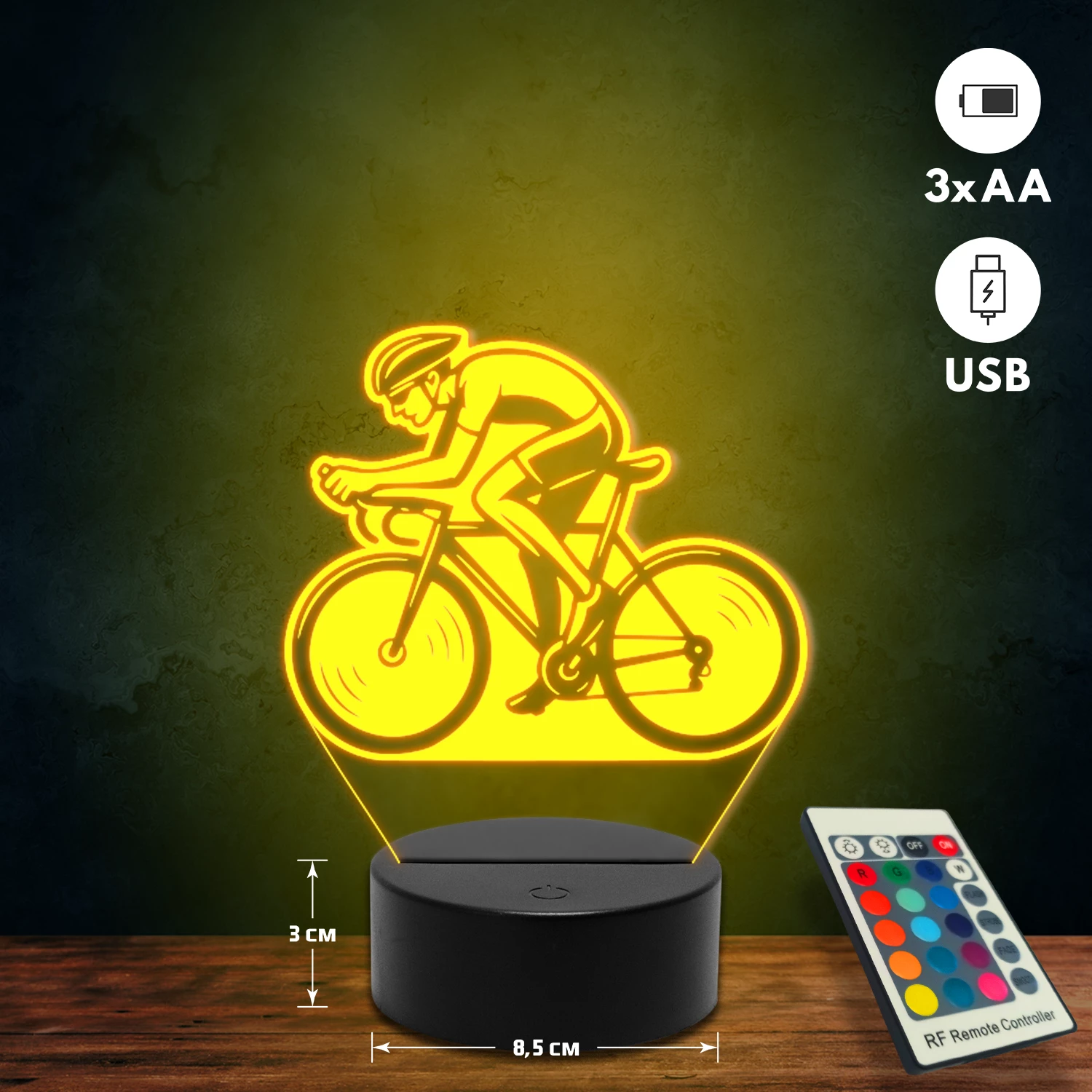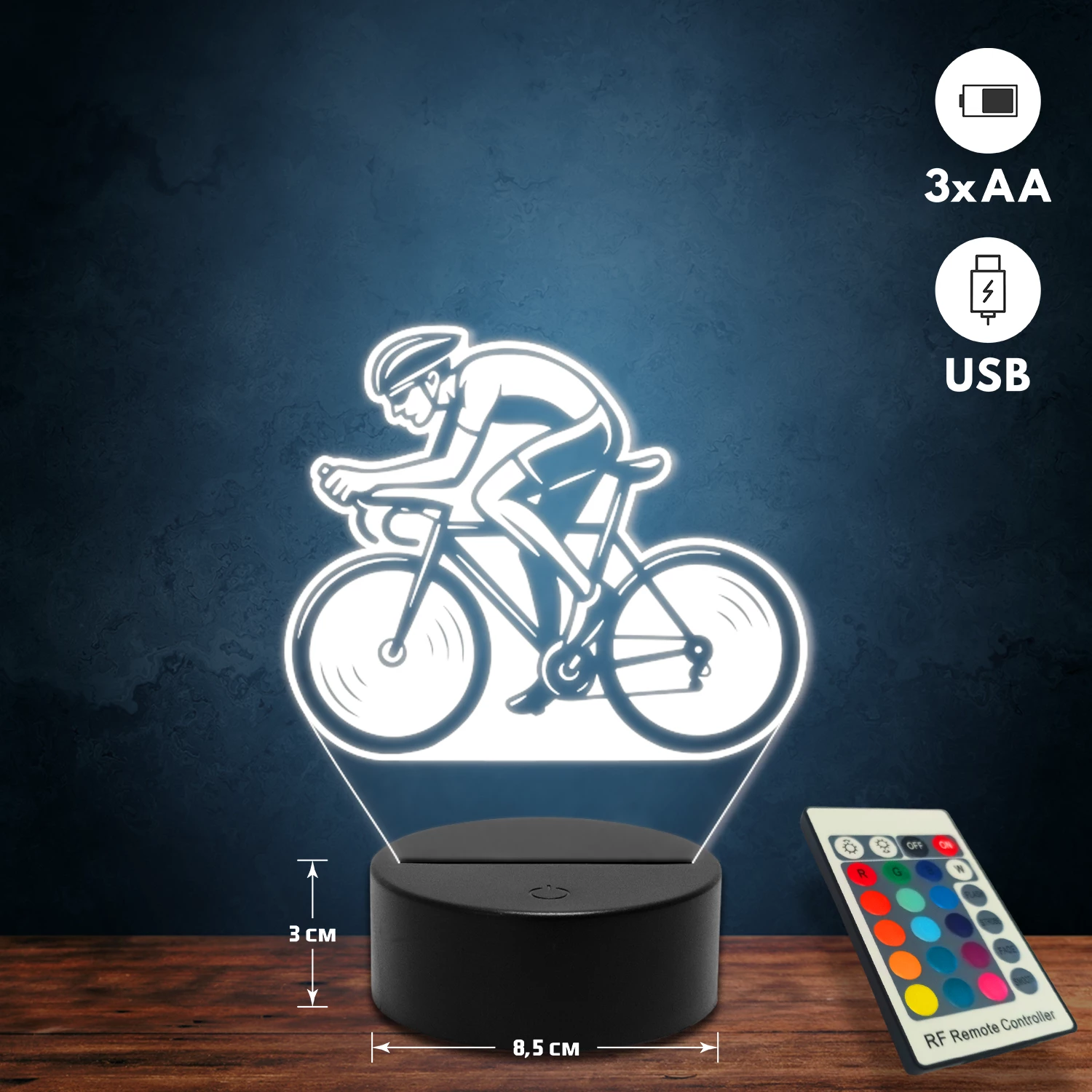A 3D lámpa USB-kábellel is működtethető, amelyet egyszerűen csatlakoztathatsz számítógéphez, laptophoz vagy hálózati adapterhez. Emellett 3 darab AA elemmel is üzemeltethető (a csomag nem tartalmazza). A lámpa 16 különböző színben világíthat, emellett választhatóak a színváltási módok is: gyors villogás, lassú villogás vagy fokozatos színátmenet. A fény kellemesen lágy, a fényerőt pedig könnyedén állíthatod a mellékelt távirányító segítségével.