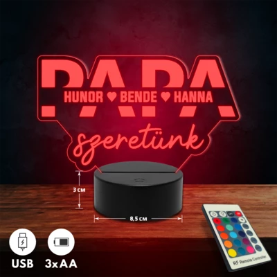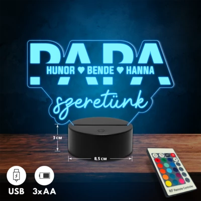 A 3D lámpa USB-kábellel is működtethető, amelyet egyszerűen csatlakoztathatsz számítógéphez, laptophoz vagy hálózati adapterhez. Emellett 3 darab AA elemmel is üzemeltethető (a csomag nem tartalmazza). A lámpa 16 különböző színben világíthat, emellett választhatóak a színváltási módok is: gyors villogás, lassú villogás vagy fokozatos színátmenet. A fény kellemesen lágy, a fényerőt pedig könnyedén állíthatod a mellékelt távirányító segítségével.