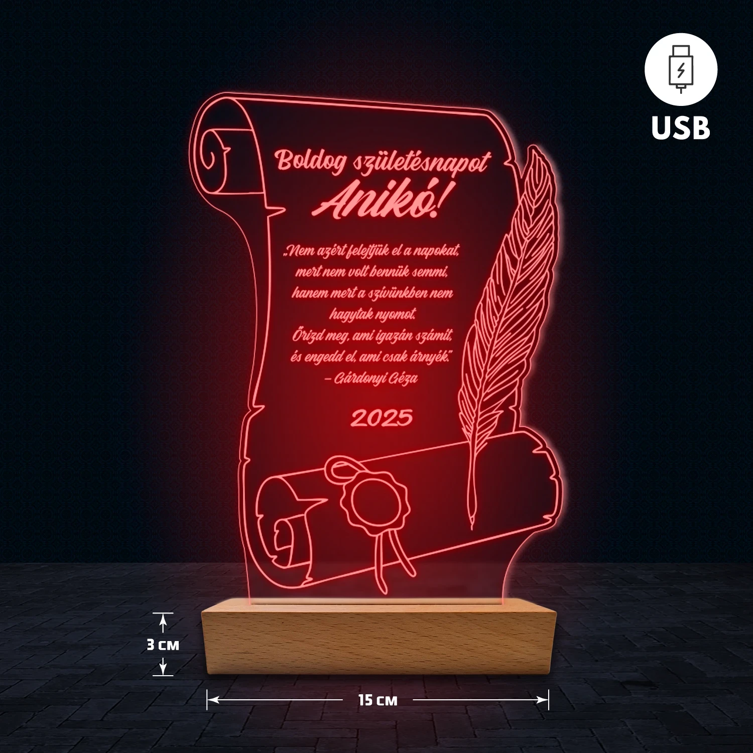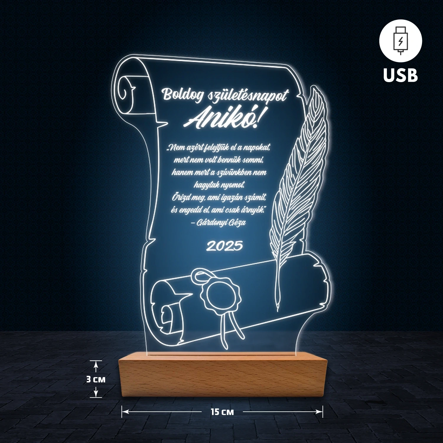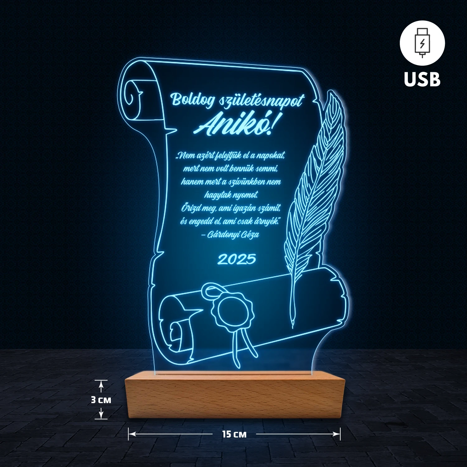 A 3D hatású LED lámpa különlegessége, hogy az akril lemezre az egyedi feliratod gravírozzuk, így teljesen személyre szabható. Nem csak nevet vagy dátumot adhatsz meg, hanem akár hosszabb szöveget is – legyen az idézet, kedvenc dalrészlet, üzenet vagy bármilyen személyes szöveg, amit szeretnél. Ezért tökéletes ajándék, amely egyszerre különleges és személyes. A lámpa természetes fa talppal készül, amely dekoratív és elegáns megjelenést biztosít. 🎁