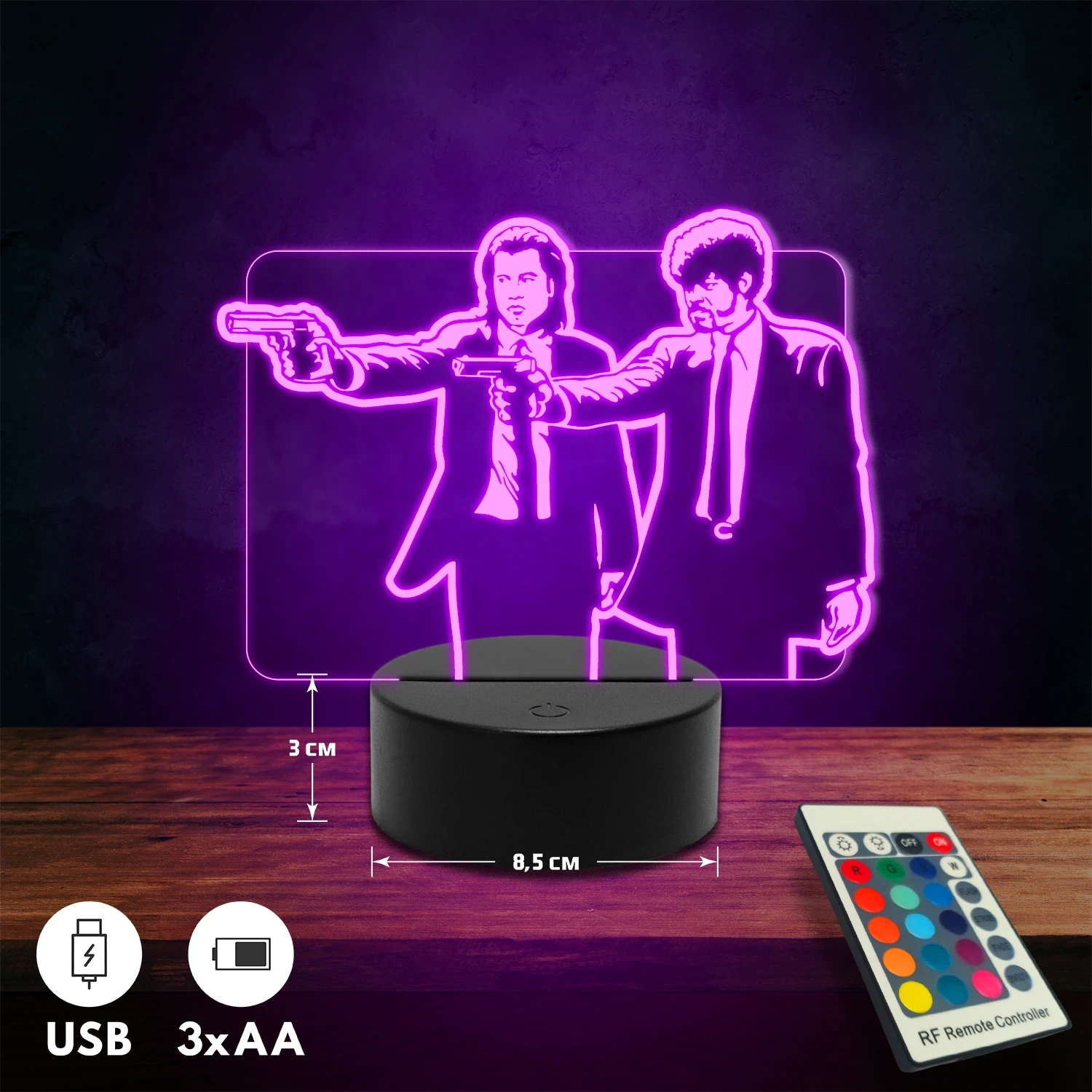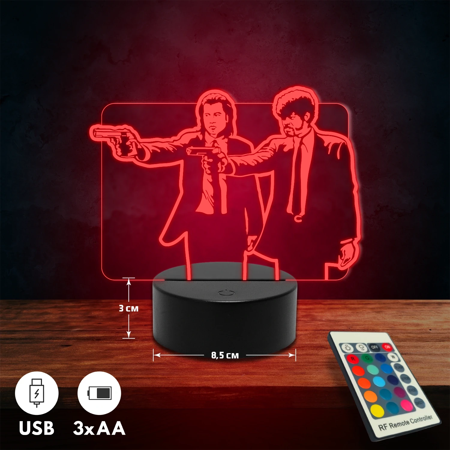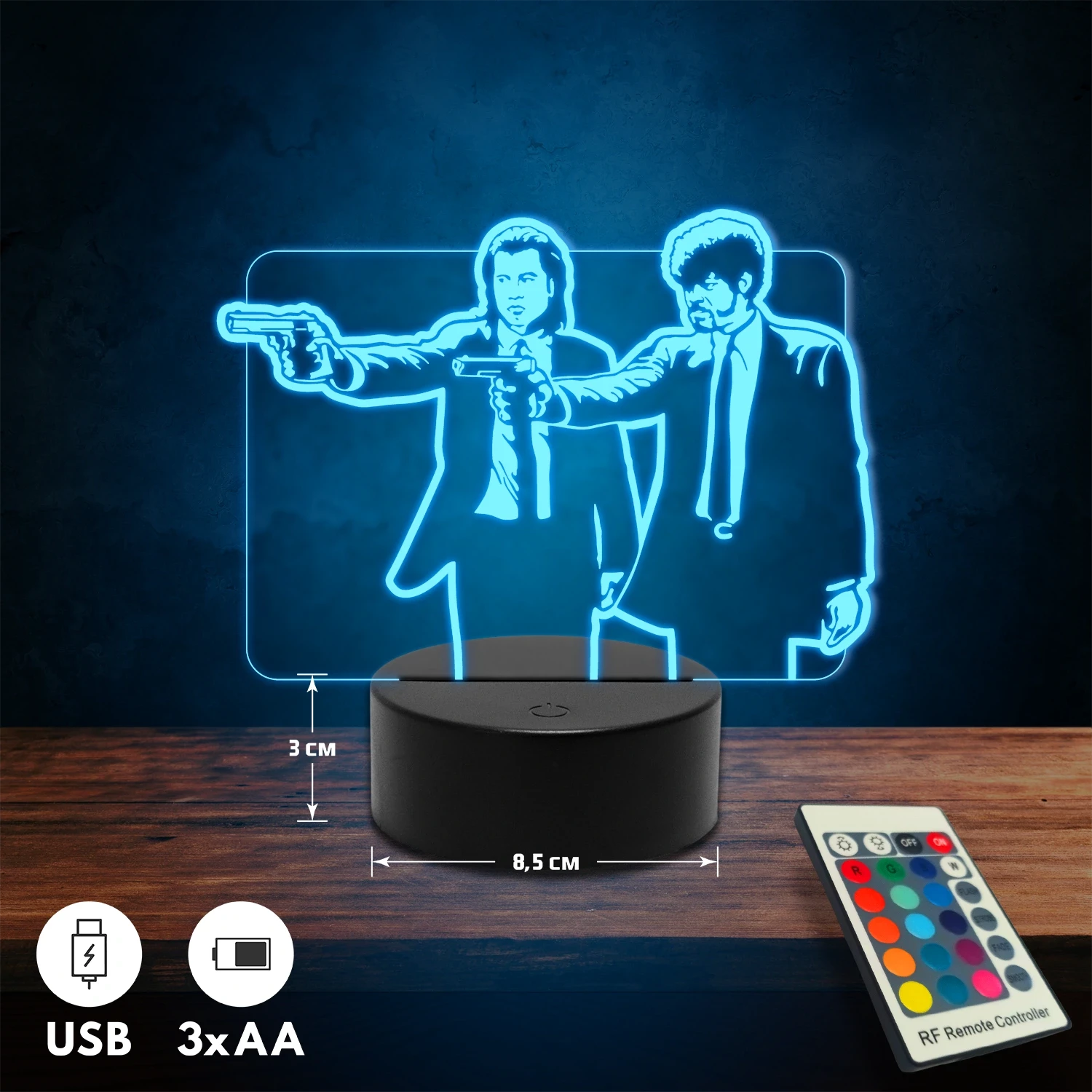 A 3D lámpa USB-kábellel is működtethető, amelyet egyszerűen csatlakoztathatsz számítógéphez, laptophoz vagy hálózati adapterhez. Emellett 3 darab AA elemmel is üzemeltethető (a csomag nem tartalmazza). A lámpa 16 különböző színben világíthat, emellett választhatóak a színváltási módok is: gyors villogás, lassú villogás vagy fokozatos színátmenet. A fény kellemesen lágy, a fényerőt pedig könnyedén állíthatod a mellékelt távirányító segítségével.