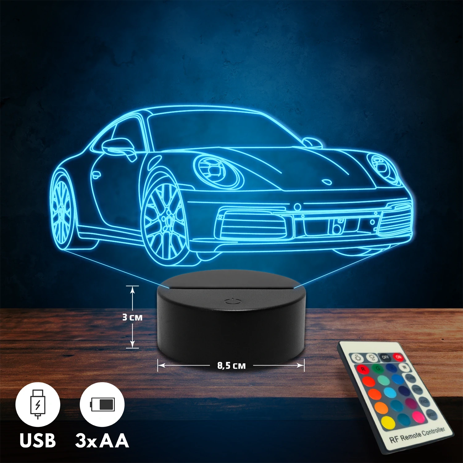 A 3D lámpa USB-kábellel is működtethető, amelyet egyszerűen csatlakoztathatsz számítógéphez, laptophoz vagy hálózati adapterhez. Emellett 3 darab AA elemmel is üzemeltethető (a csomag nem tartalmazza). A lámpa 16 különböző színben világíthat, emellett választhatóak a színváltási módok is: gyors villogás, lassú villogás vagy fokozatos színátmenet. A fény kellemesen lágy, a fényerőt pedig könnyedén állíthatod a mellékelt távirányító segítségével.
