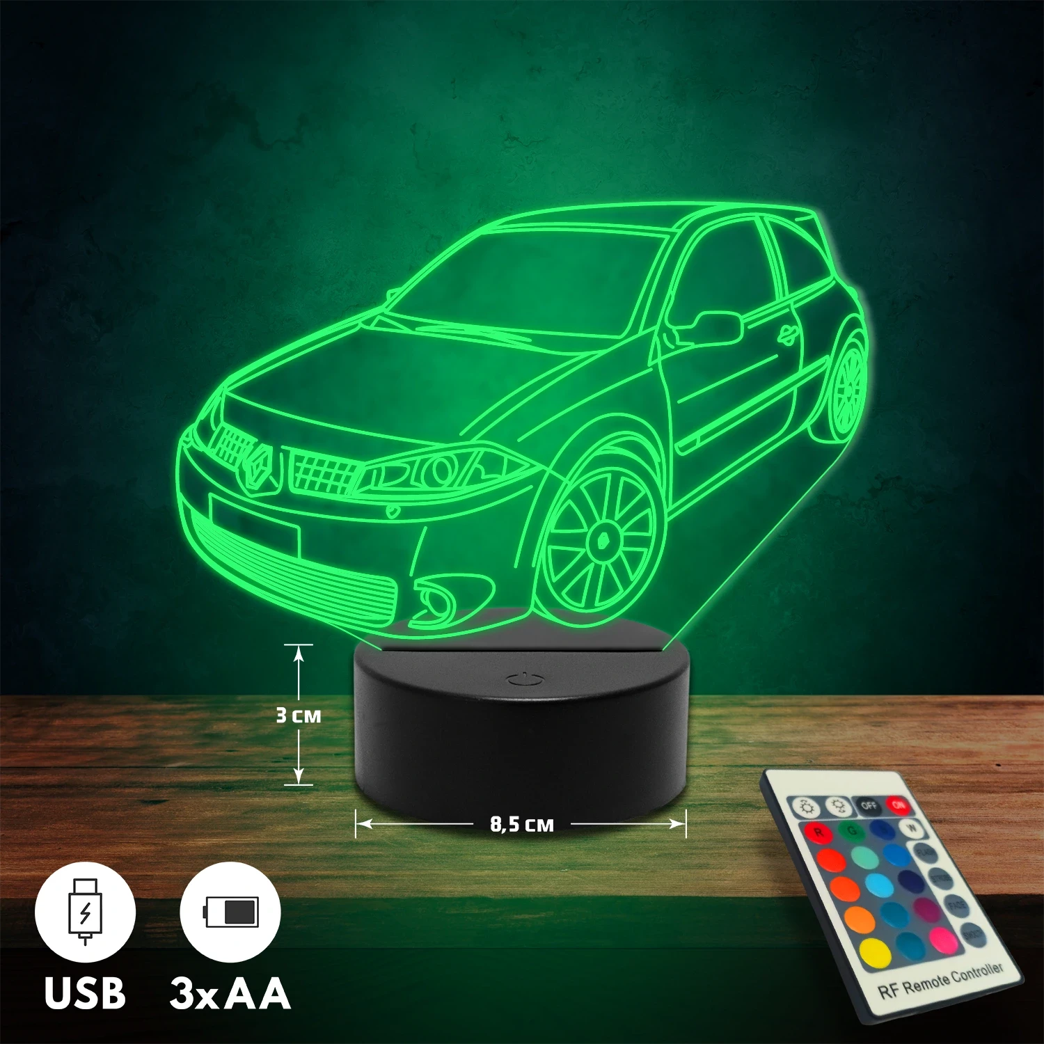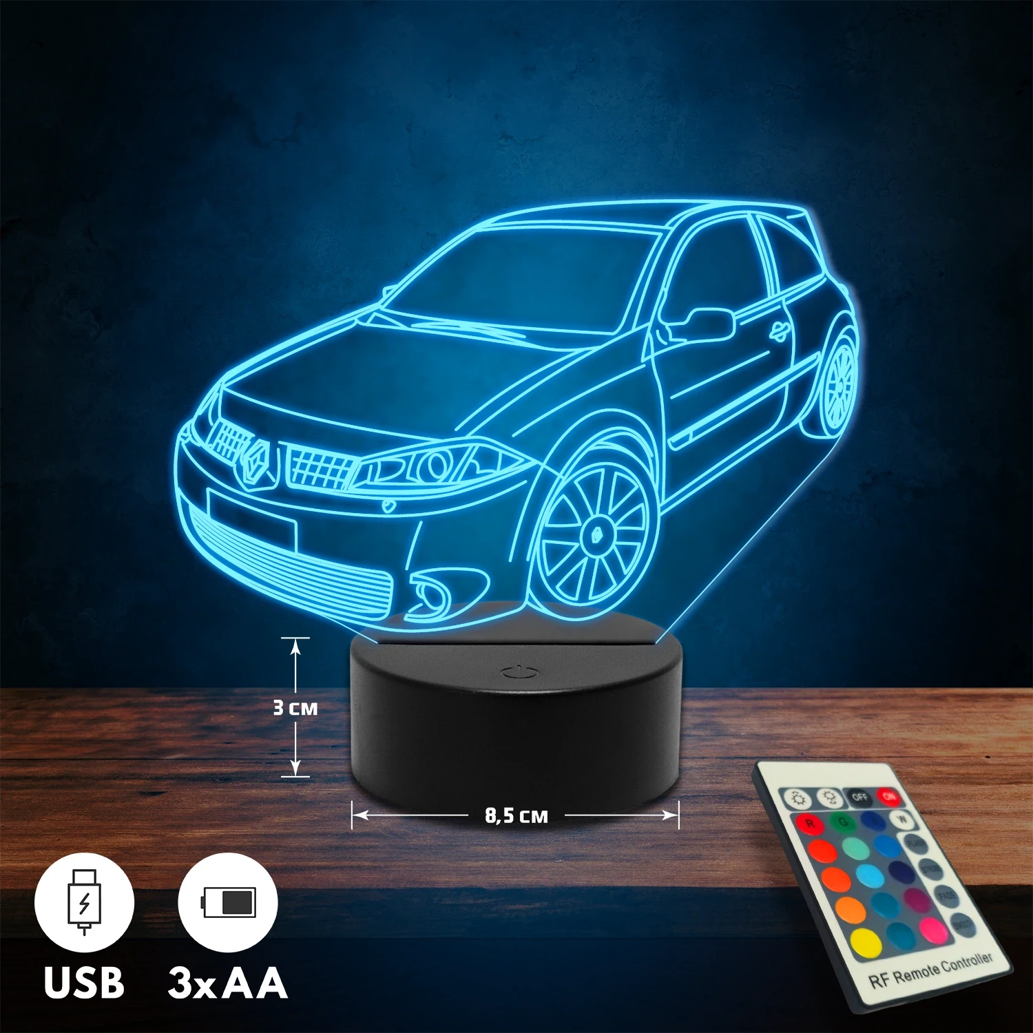 A 3D lámpa USB-kábellel is működtethető, amelyet egyszerűen csatlakoztathatsz számítógéphez, laptophoz vagy hálózati adapterhez. Emellett 3 darab AA elemmel is üzemeltethető (a csomag nem tartalmazza). A lámpa 16 különböző színben világíthat, emellett választhatóak a színváltási módok is: gyors villogás, lassú villogás vagy fokozatos színátmenet. A fény kellemesen lágy, a fényerőt pedig könnyedén állíthatod a mellékelt távirányító segítségével.