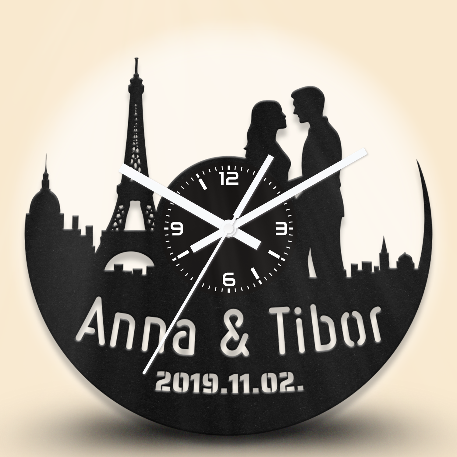 Bármelyik óránkra kérhetsz egyedi feliratot. A feliratokat – a minta alakzataihoz hasonlóan – kivágással készítjük el. A gyártáshoz stencil betűtípust használunk. Hosszabb vagy nagyobb méretű szövegeknél az alap mintán is végzünk kisebb módosításokat. A képek között találsz néhány példát egyedi feliratos óráinkról, amelyeket korábbi megrendelésekhez készítettünk.