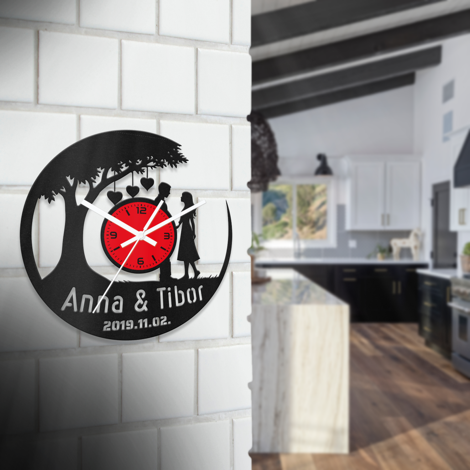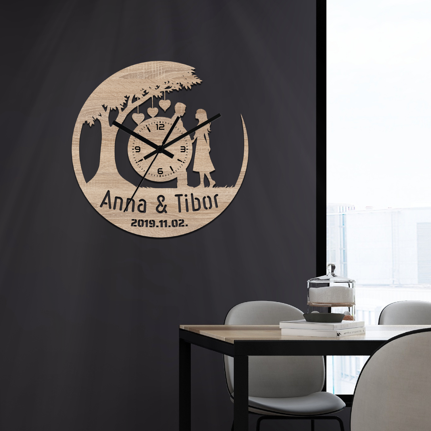 Bármelyik óránkra kérhetsz egyedi feliratot. A feliratokat – a minta alakzataihoz hasonlóan – kivágással készítjük el. A gyártáshoz stencil betűtípust használunk. Hosszabb vagy nagyobb méretű szövegeknél az alap mintán is végzünk kisebb módosításokat. A képek között találsz néhány példát egyedi feliratos óráinkról, amelyeket korábbi megrendelésekhez készítettünk.