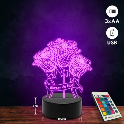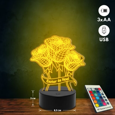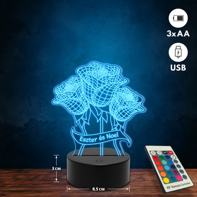 | Tartozékok: | Lézervágott, gravírozott akril lemez (Vastagság - 4 mm), Érintő gombos befogó talp (Átmérő - 8,5 cm, Magasság - 3,8 cm), Micro USB kábel (Hossz - 80 cm), Távirányító, Az elemet a csomag nem tartalmazza! |