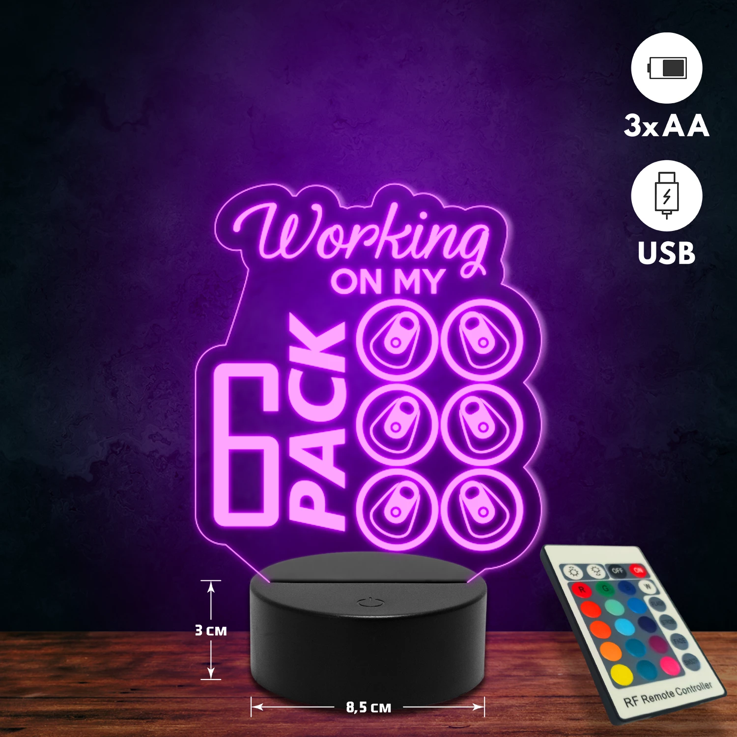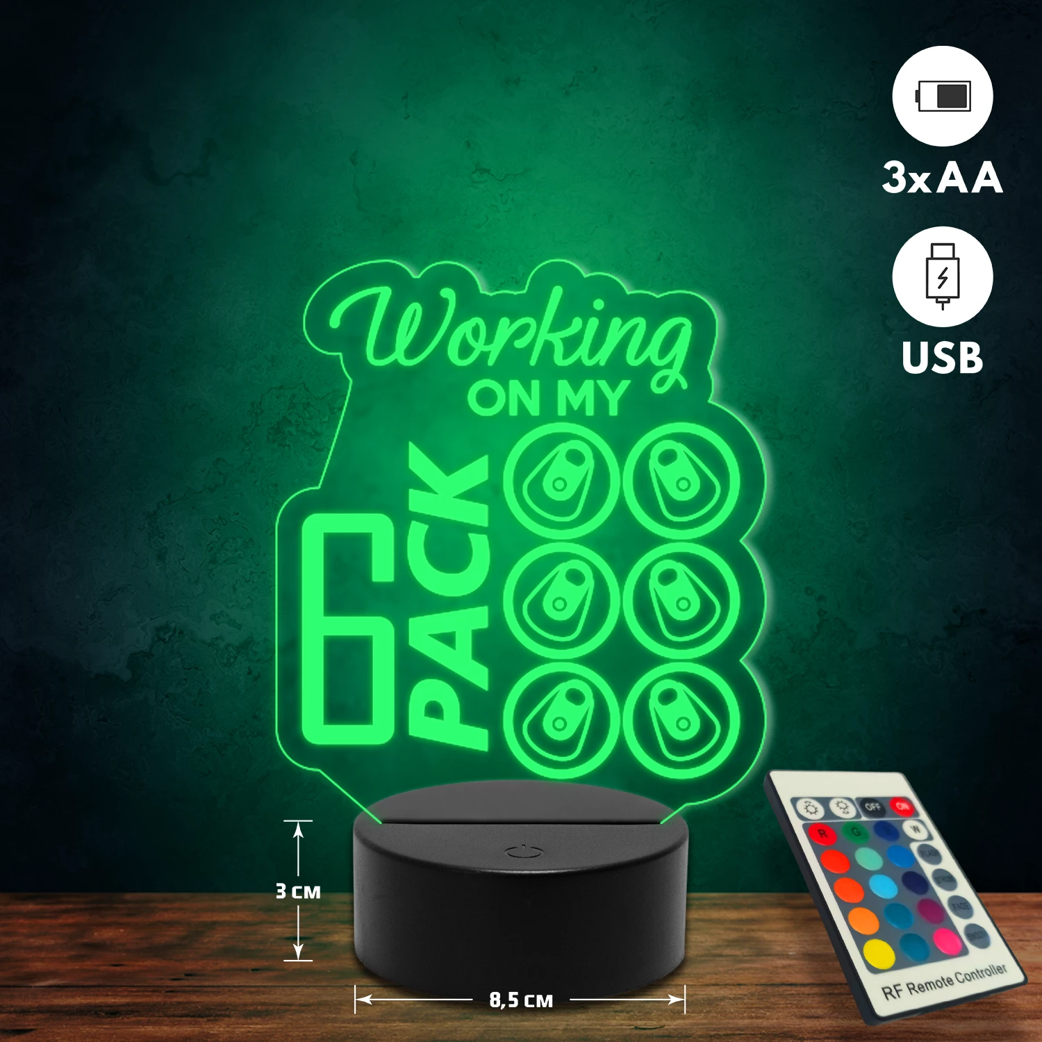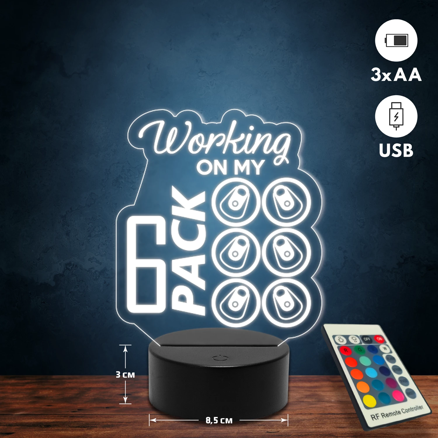 A 3D lámpa USB-kábellel is működtethető, amelyet egyszerűen csatlakoztathatsz számítógéphez, laptophoz vagy hálózati adapterhez. Emellett 3 darab AA elemmel is üzemeltethető (a csomag nem tartalmazza). A lámpa 16 különböző színben világíthat, emellett választhatóak a színváltási módok is: gyors villogás, lassú villogás vagy fokozatos színátmenet. A fény kellemesen lágy, a fényerőt pedig könnyedén állíthatod a mellékelt távirányító segítségével.