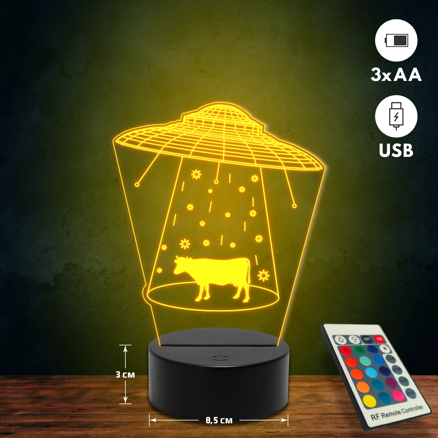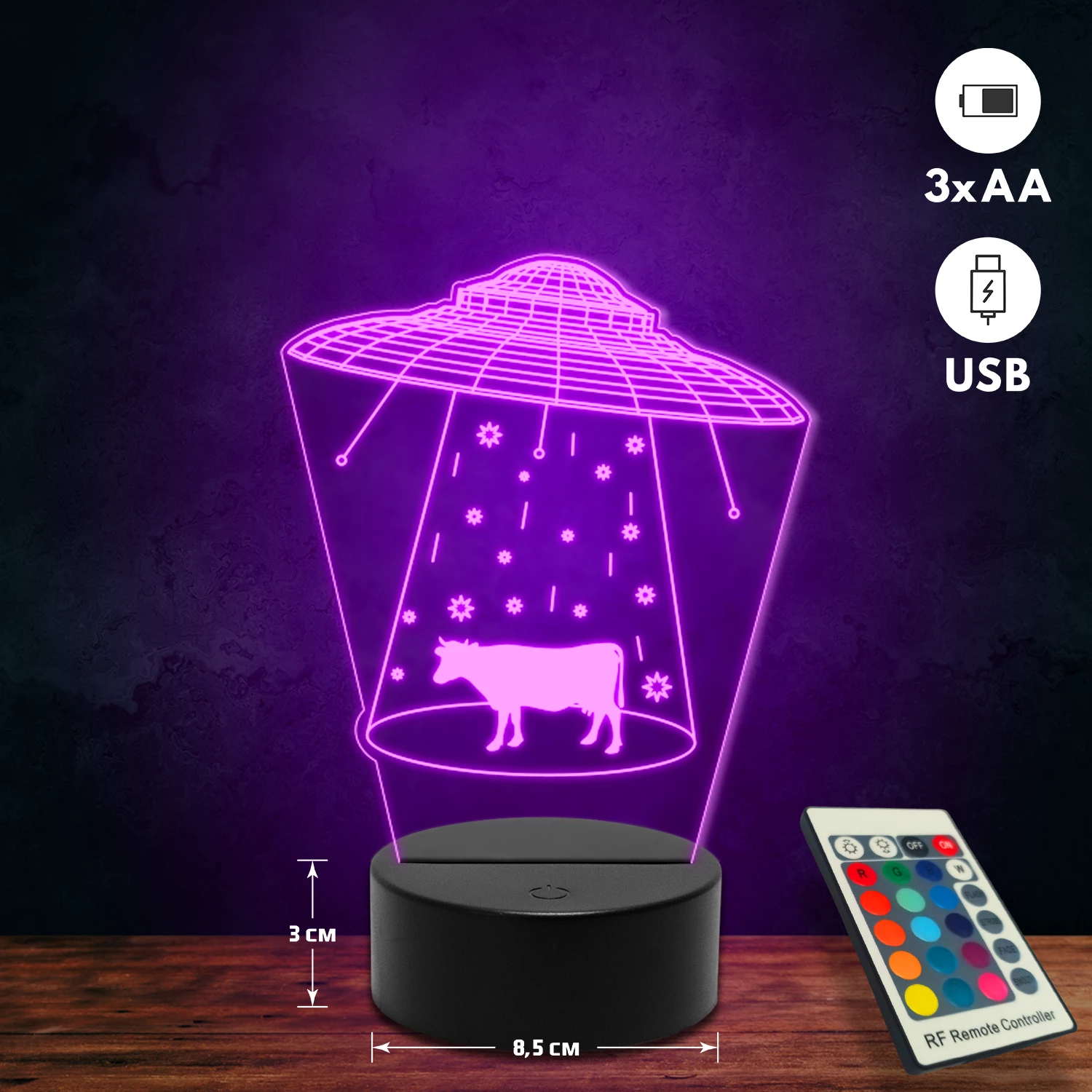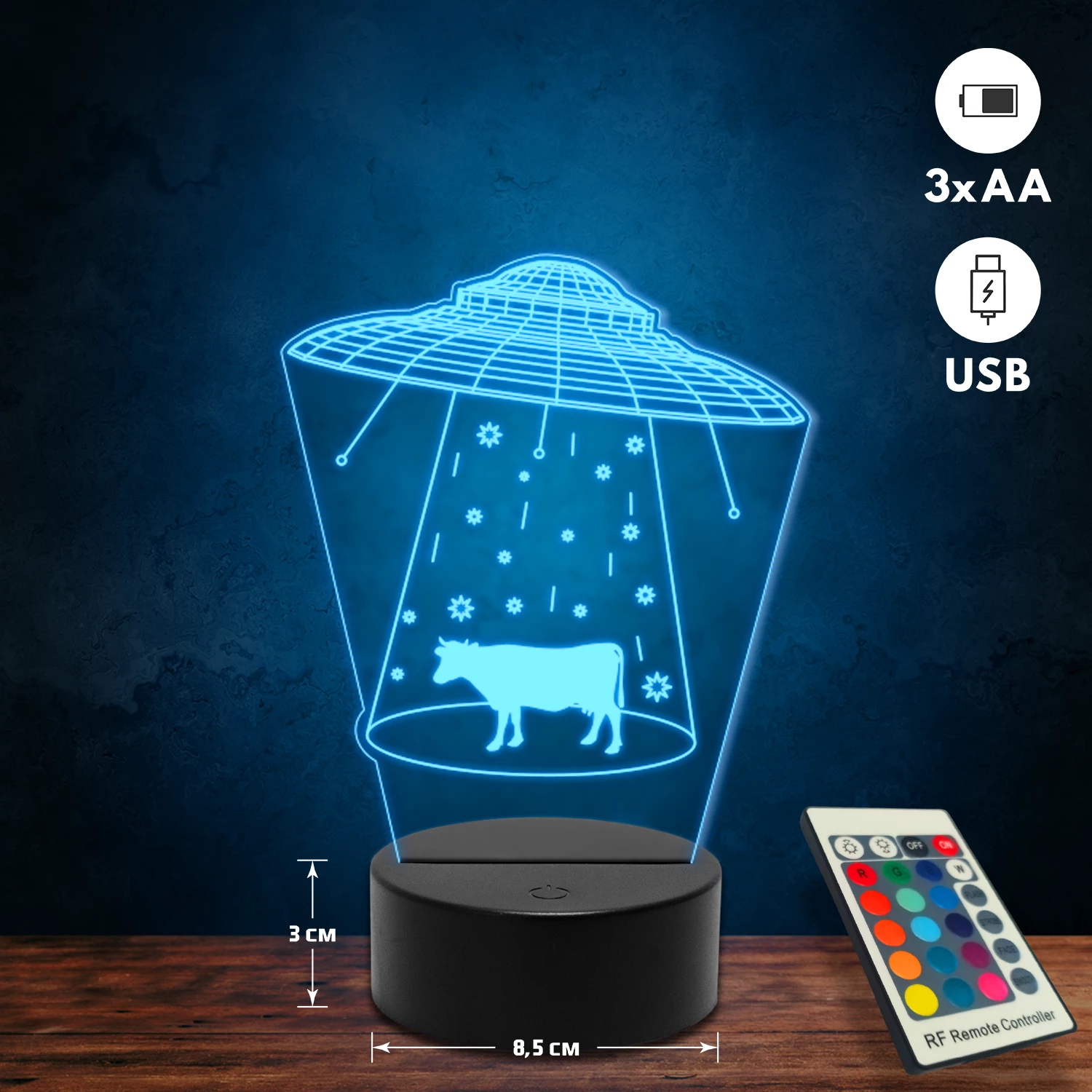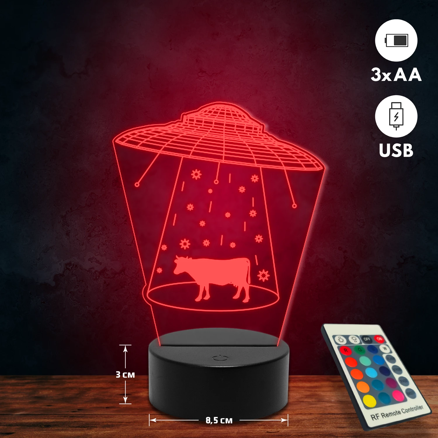 A 3D lámpa USB-kábellel is működtethető, amelyet egyszerűen csatlakoztathatsz számítógéphez, laptophoz vagy hálózati adapterhez. Emellett 3 darab AA elemmel is üzemeltethető (a csomag nem tartalmazza). A lámpa 16 különböző színben világíthat, emellett választhatóak a színváltási módok is: gyors villogás, lassú villogás vagy fokozatos színátmenet. A fény kellemesen lágy, a fényerőt pedig könnyedén állíthatod a mellékelt távirányító segítségével.