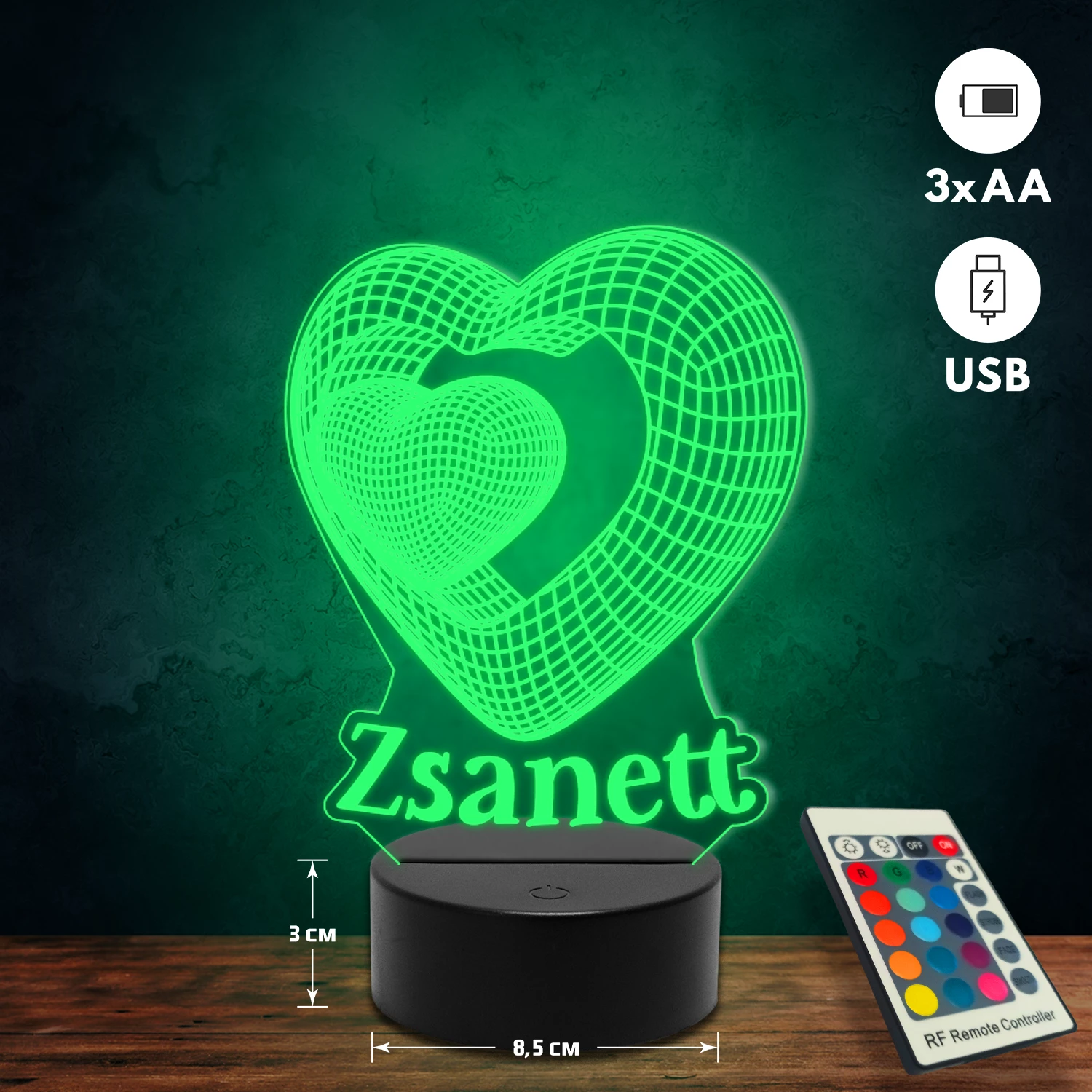A 3D lámpa USB-kábellel is működtethető, amelyet egyszerűen csatlakoztathatsz számítógéphez, laptophoz vagy hálózati adapterhez. Emellett 3 darab AA elemmel is üzemeltethető (a csomag nem tartalmazza). A lámpa 16 különböző színben világíthat, emellett választhatóak a színváltási módok is: gyors villogás, lassú villogás vagy fokozatos színátmenet. A fény kellemesen lágy, a fényerőt pedig könnyedén állíthatod a mellékelt távirányító segítségével.