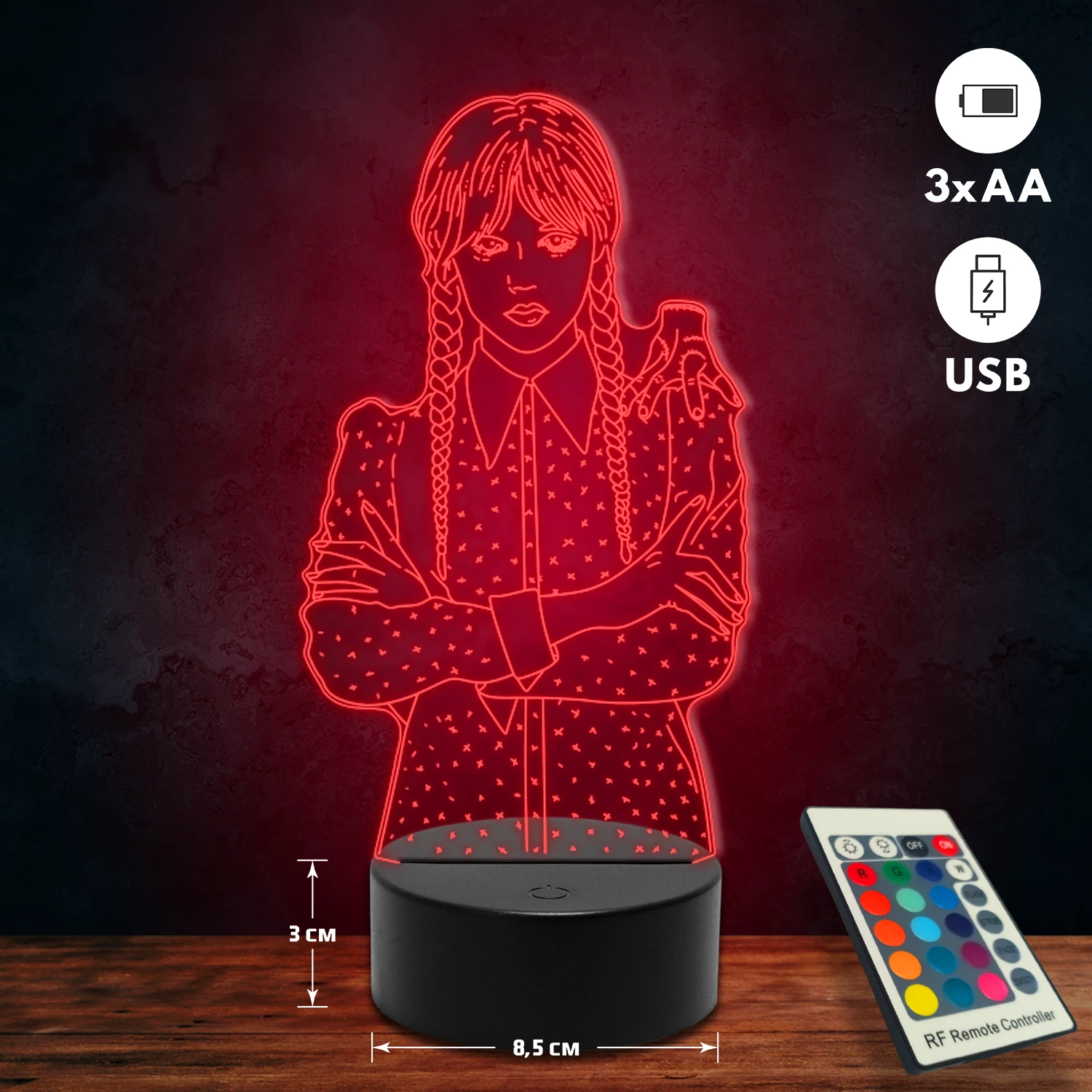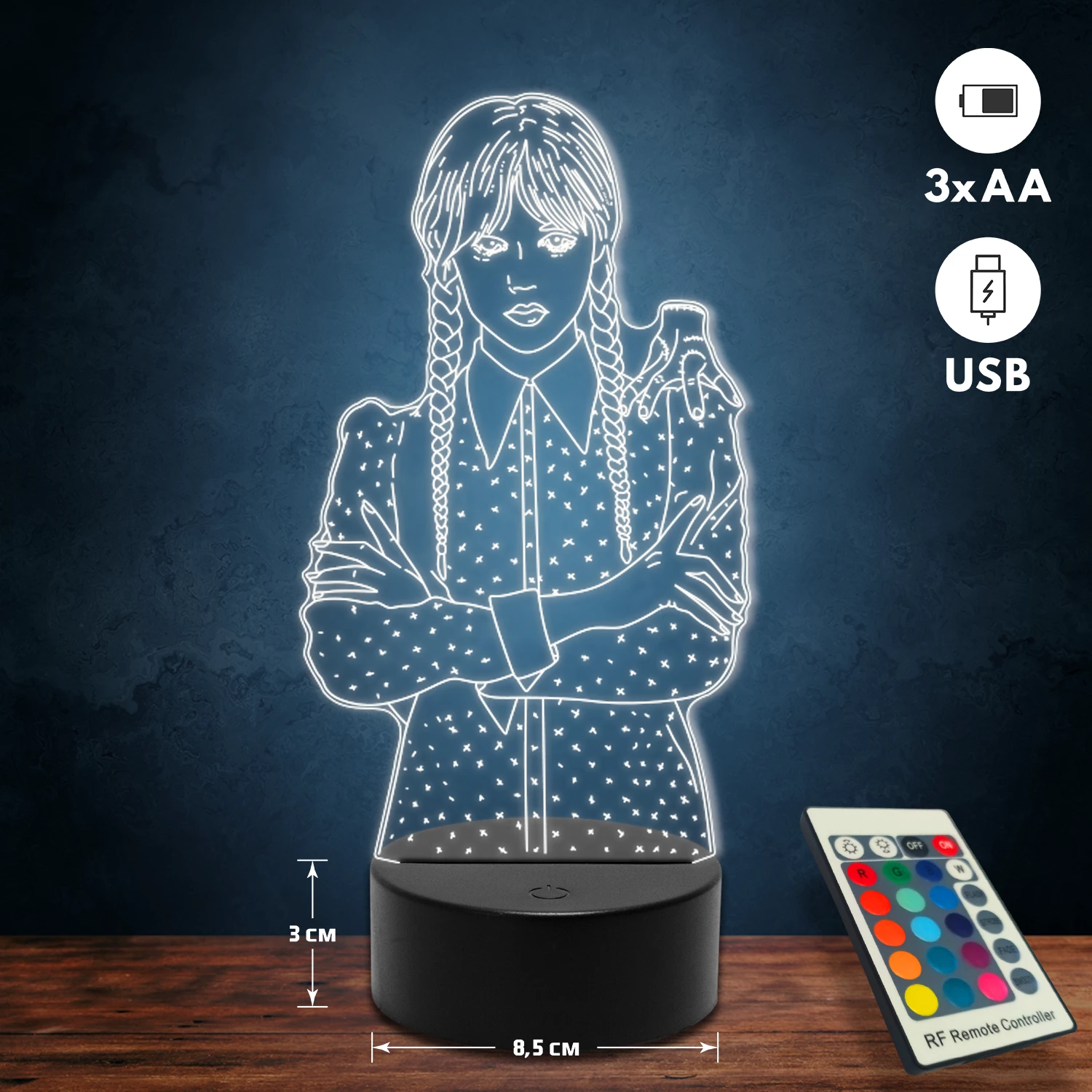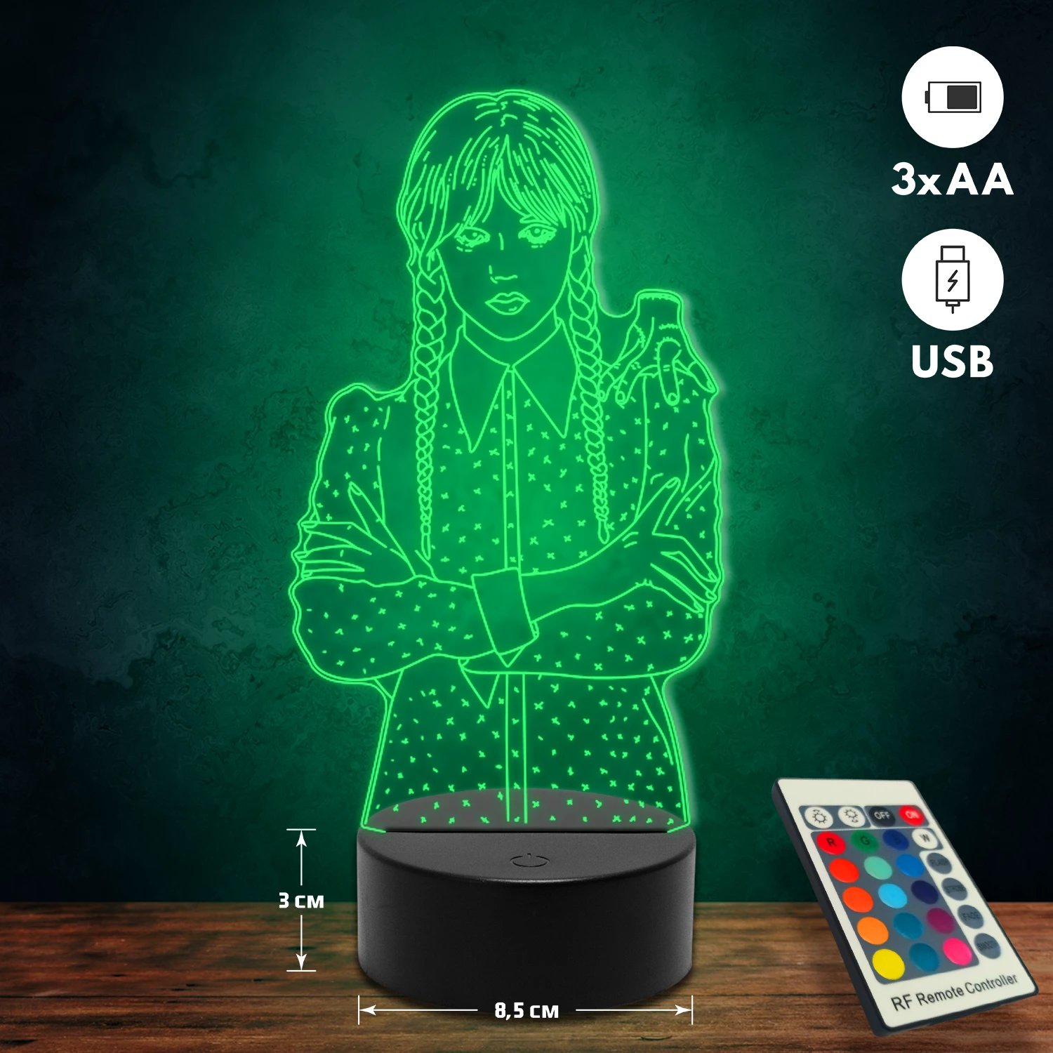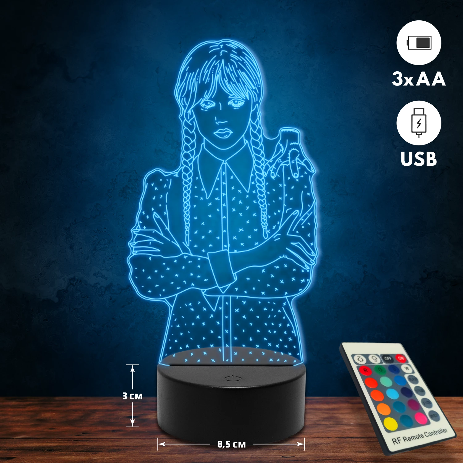 A 3D lámpa USB-kábellel is működtethető, amelyet egyszerűen csatlakoztathatsz számítógéphez, laptophoz vagy hálózati adapterhez. Emellett 3 darab AA elemmel is üzemeltethető (a csomag nem tartalmazza). A lámpa 16 különböző színben világíthat, emellett választhatóak a színváltási módok is: gyors villogás, lassú villogás vagy fokozatos színátmenet. A fény kellemesen lágy, a fényerőt pedig könnyedén állíthatod a mellékelt távirányító segítségével.